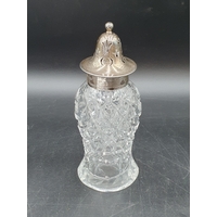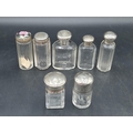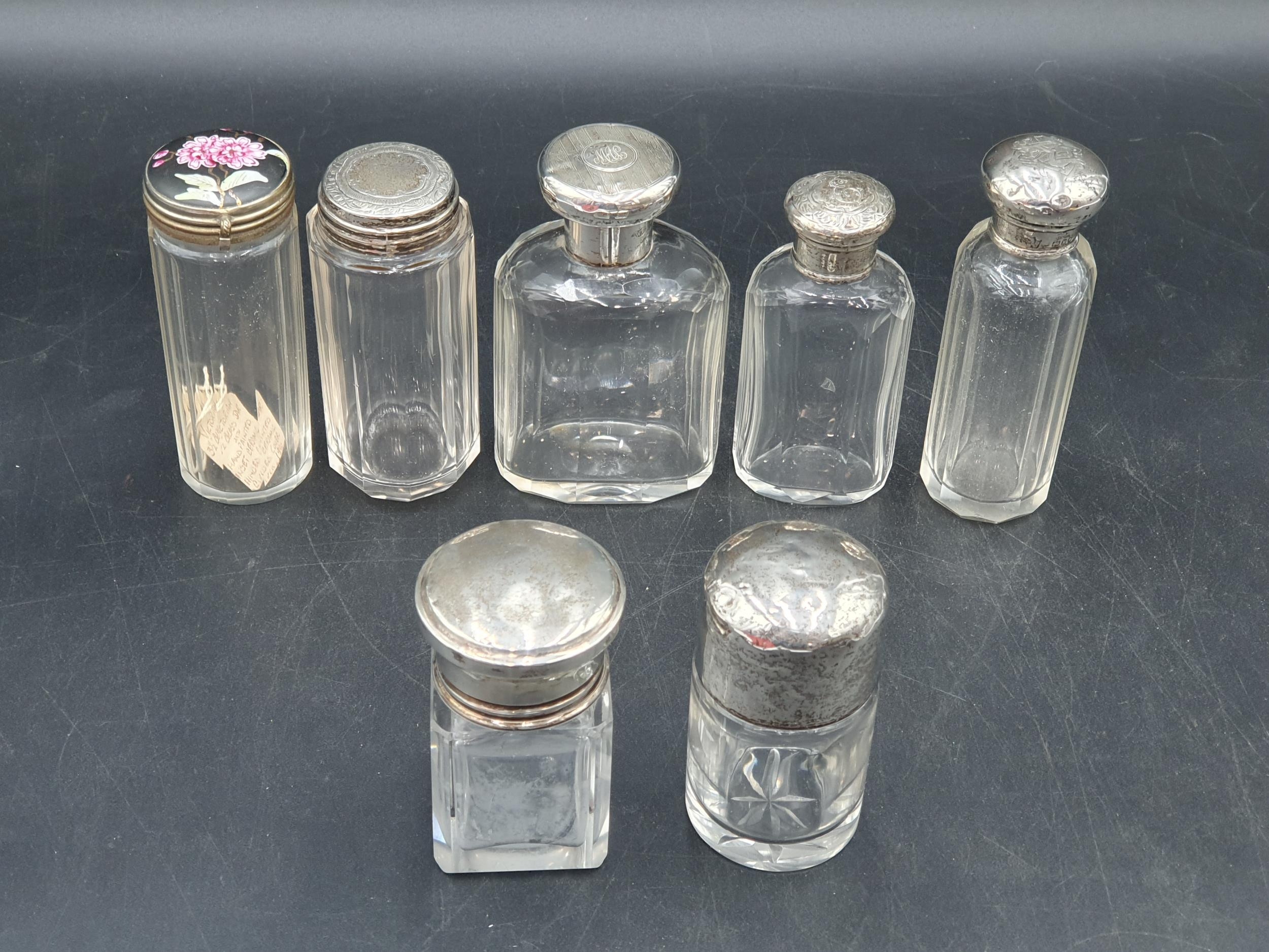 Six silver lidded glass Jars and Bottles, and a Jar with inset ceramic lid, floral painted