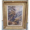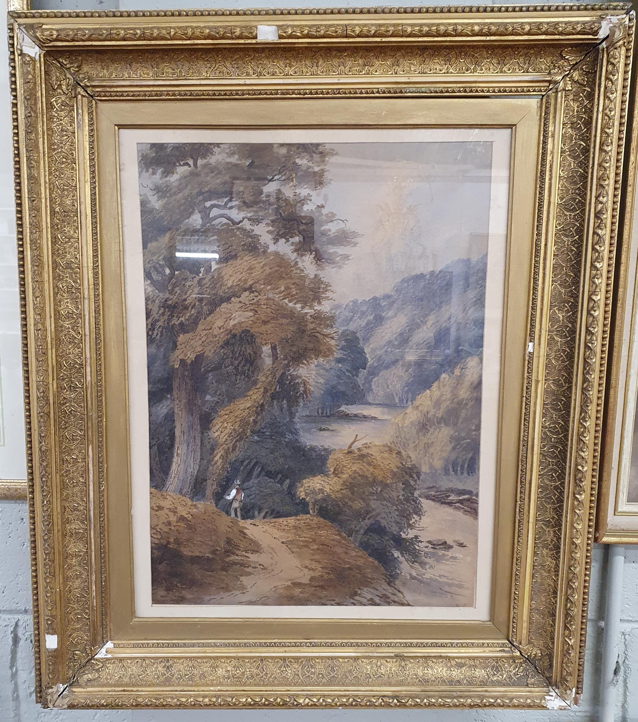 A 19th, possibly 18th Century, Watercolour of a river scene with a man walking down a path. Bears signature LR. In a really good gilt frame.