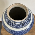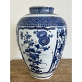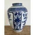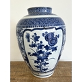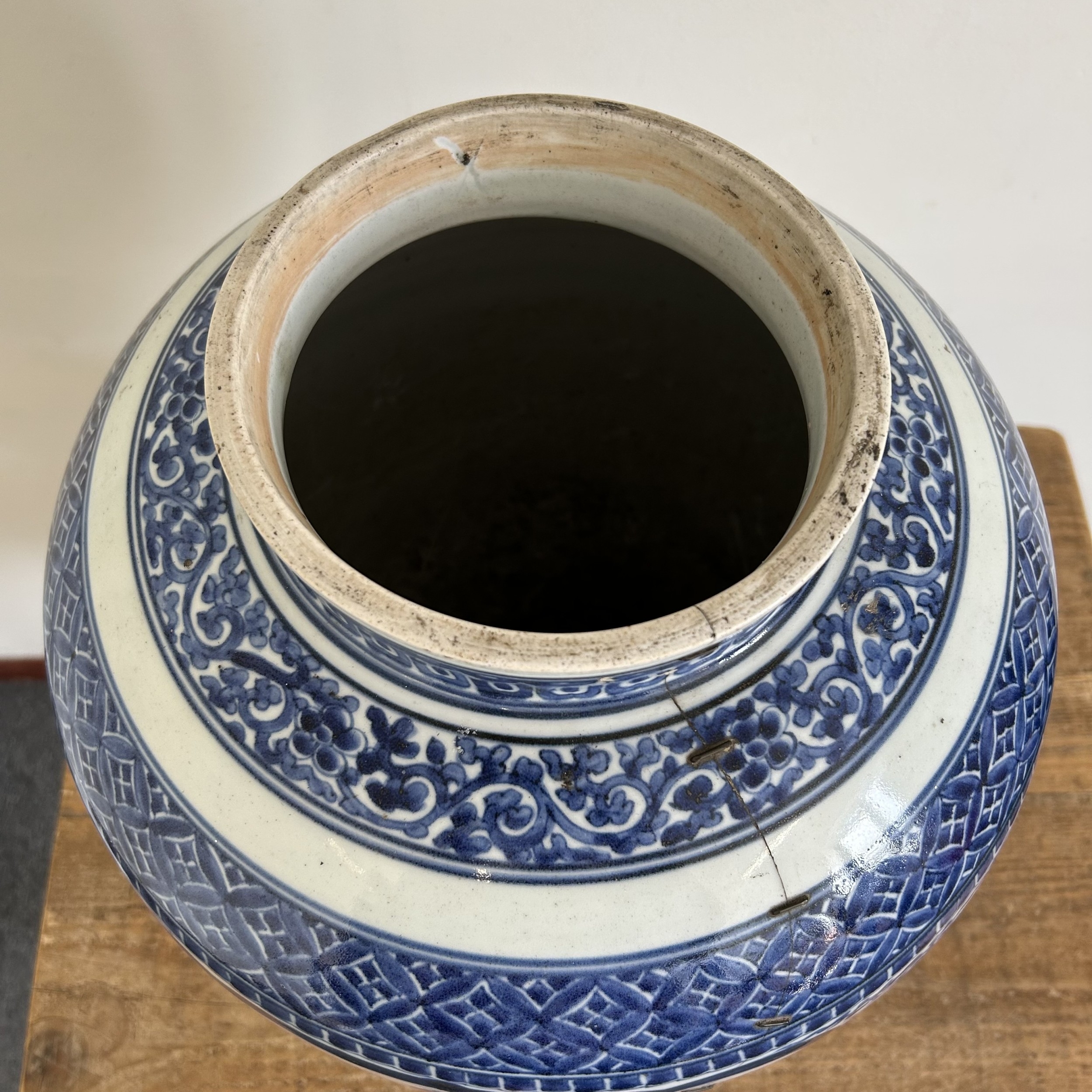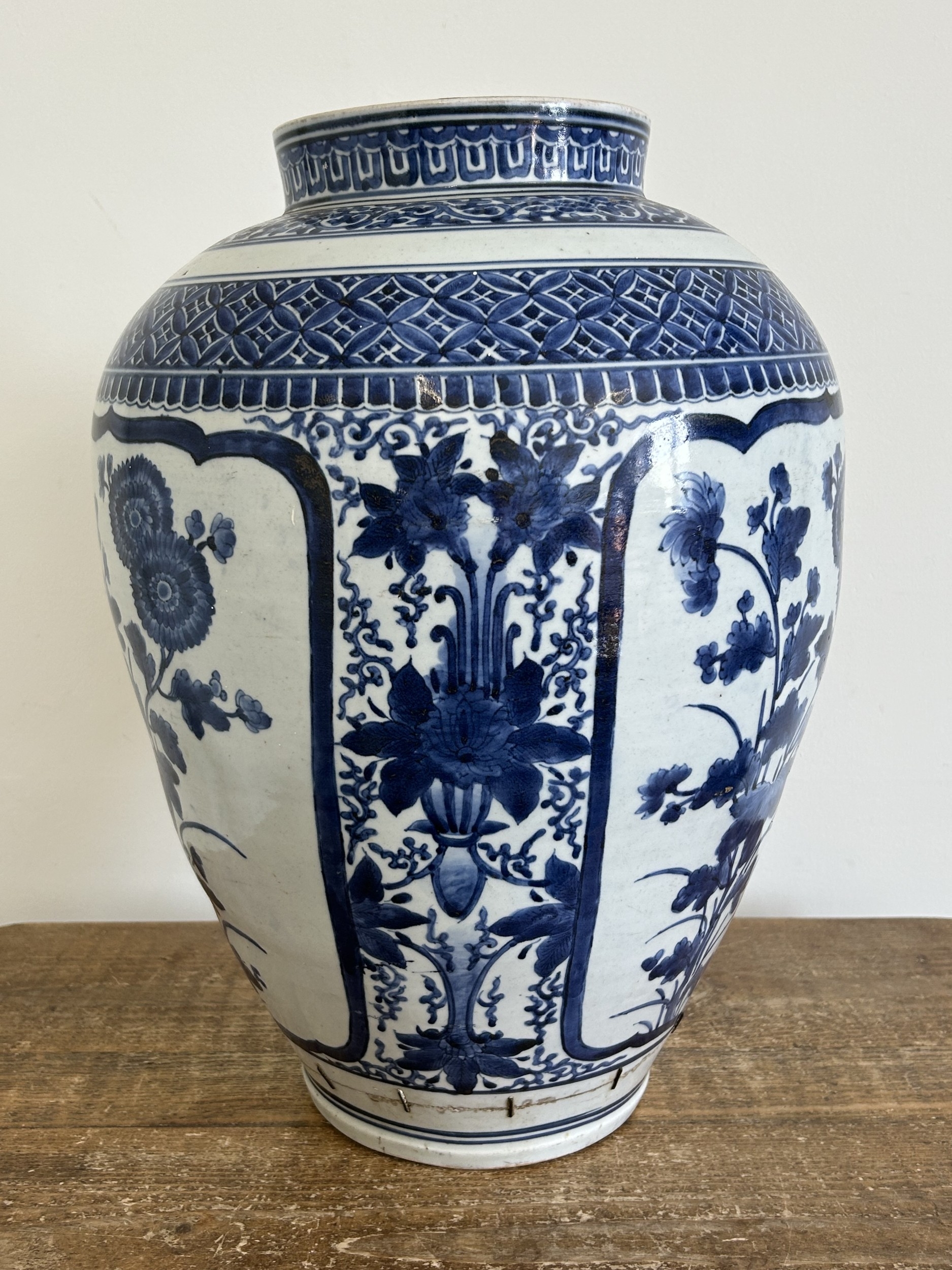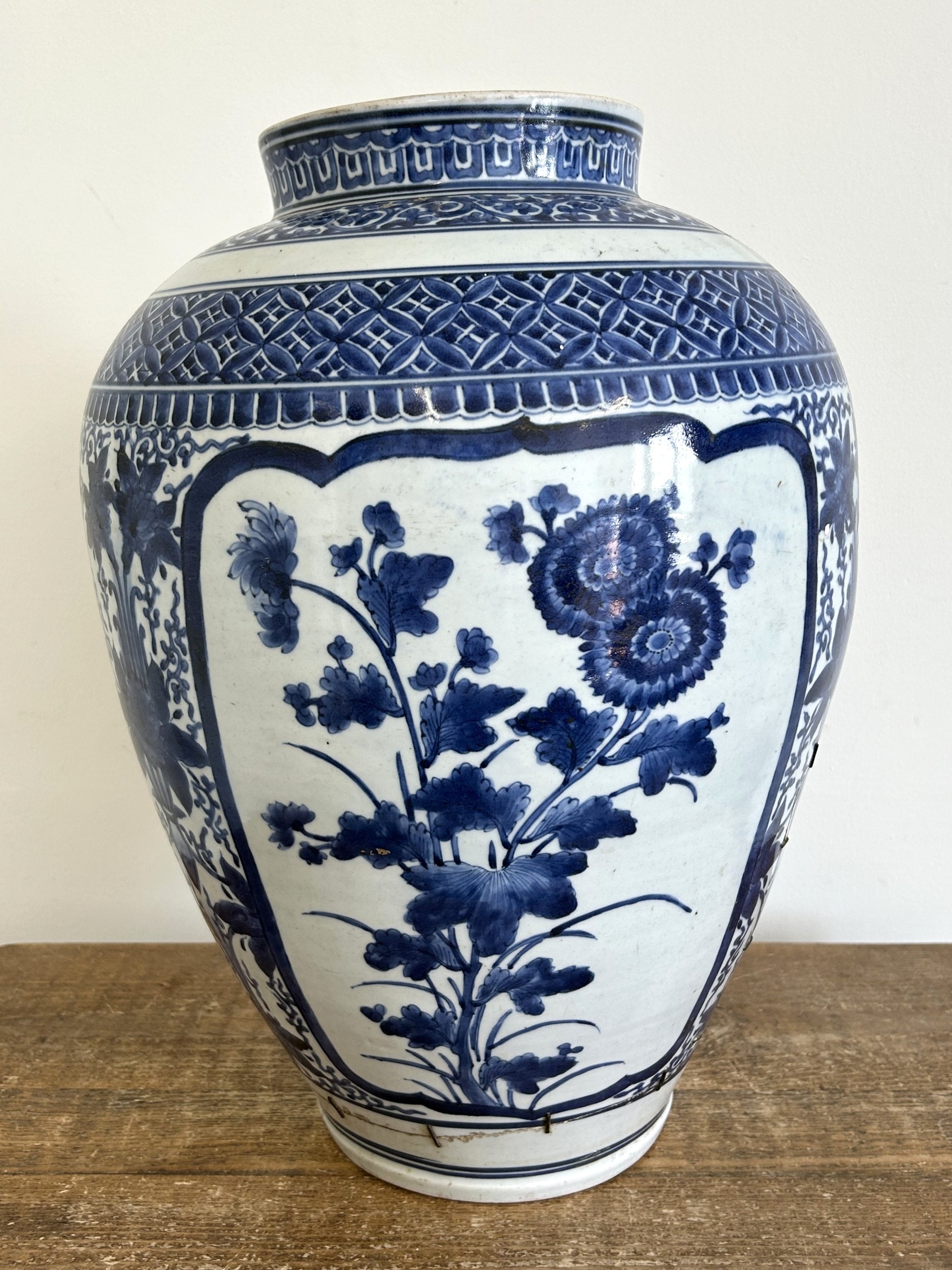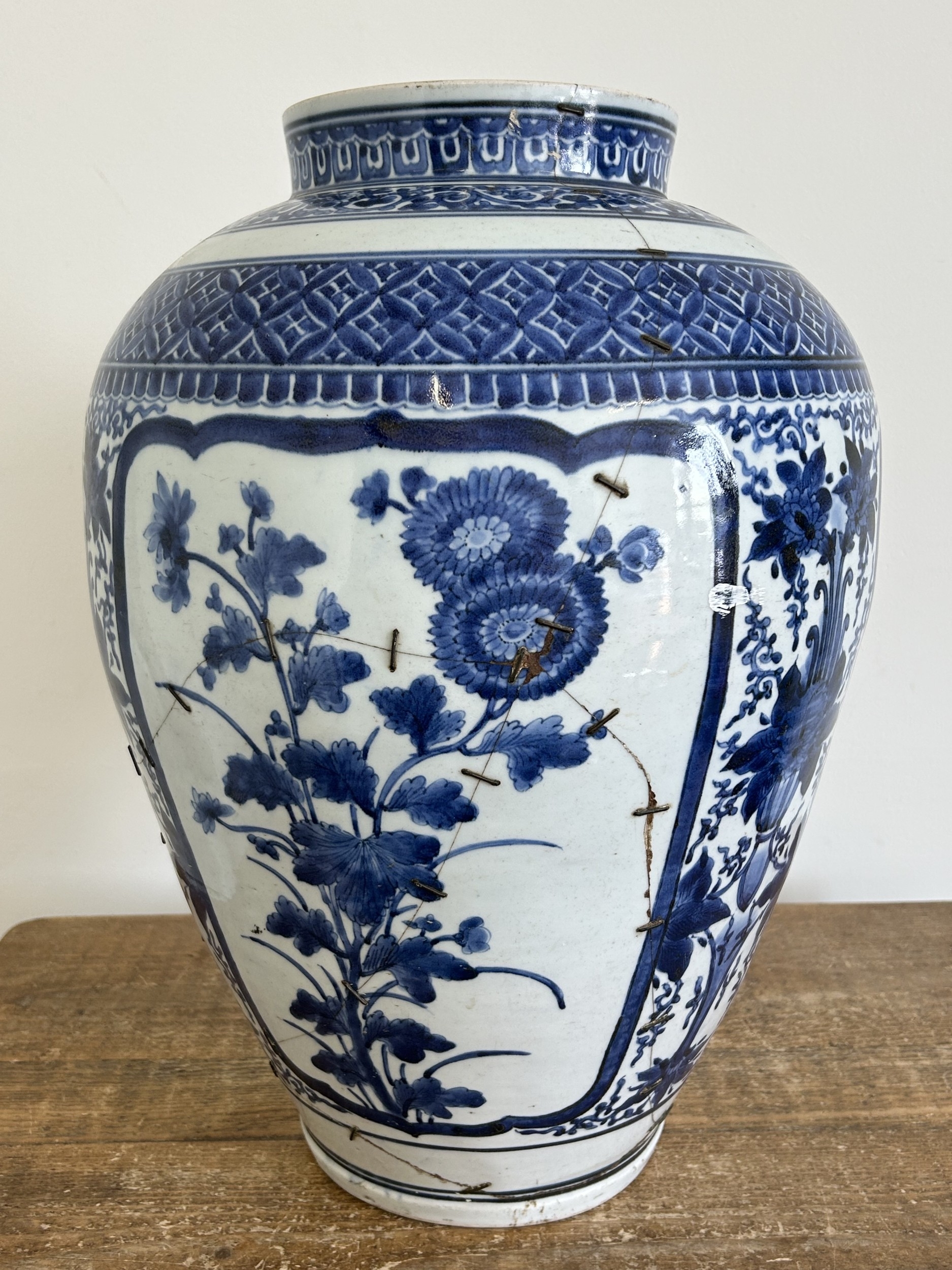 A large Chinese ceramic blue and white hand painted vase, approx. 18 1/2" tall (old damage and repaired to base and side)