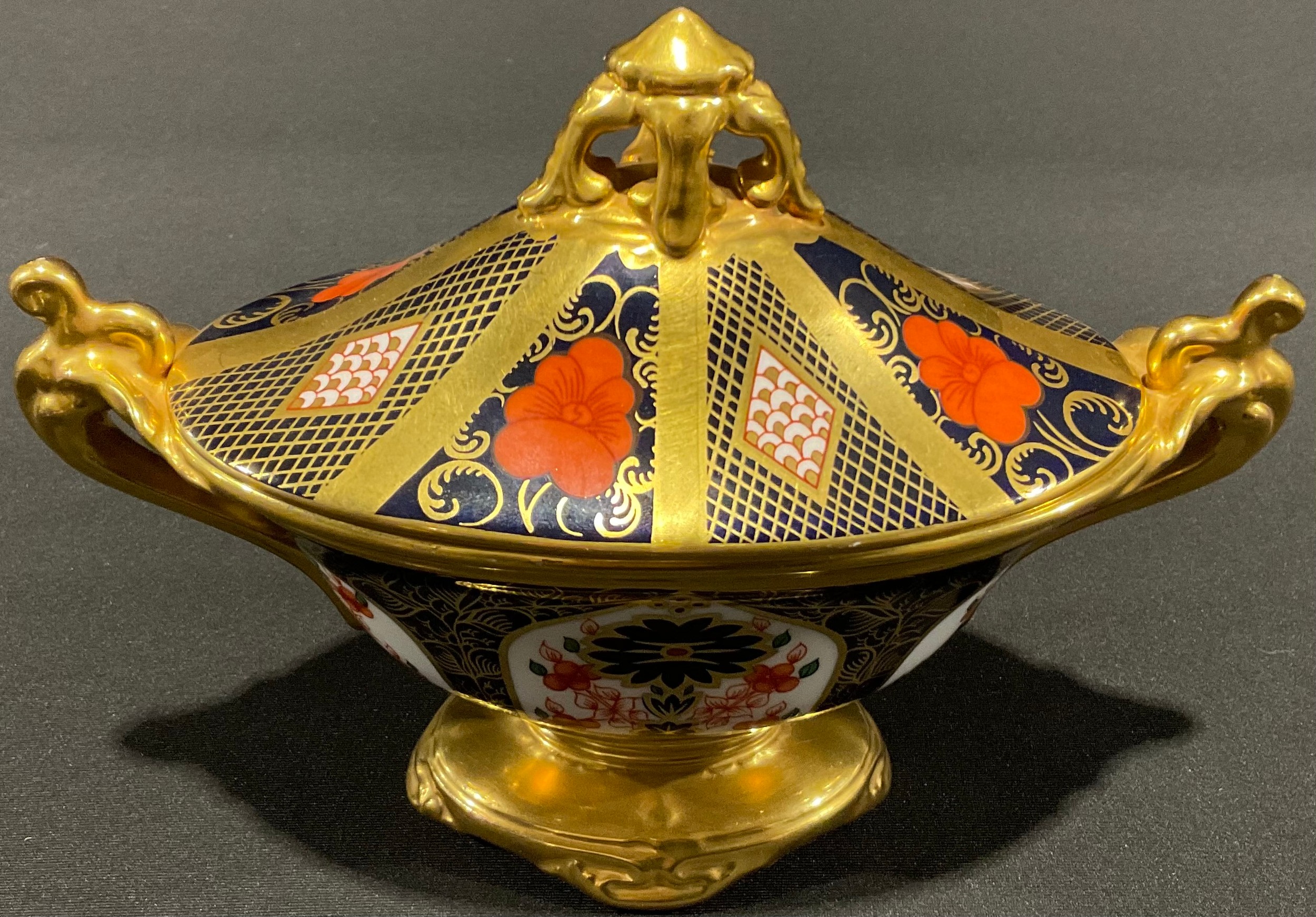 A Royal Crown Derby Imari 1128 pattern oval two handled pedestal vase and cover, solid gold band, pair of gilded scroll handles, quatrefoil base, 13cm high, printed mark in red, first quality