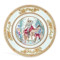 enamelled to the centre with a European equestrian scene depicting a mounted gentleman in armour attended by a companion, within gilt foliate borders. 22.2cm diameter