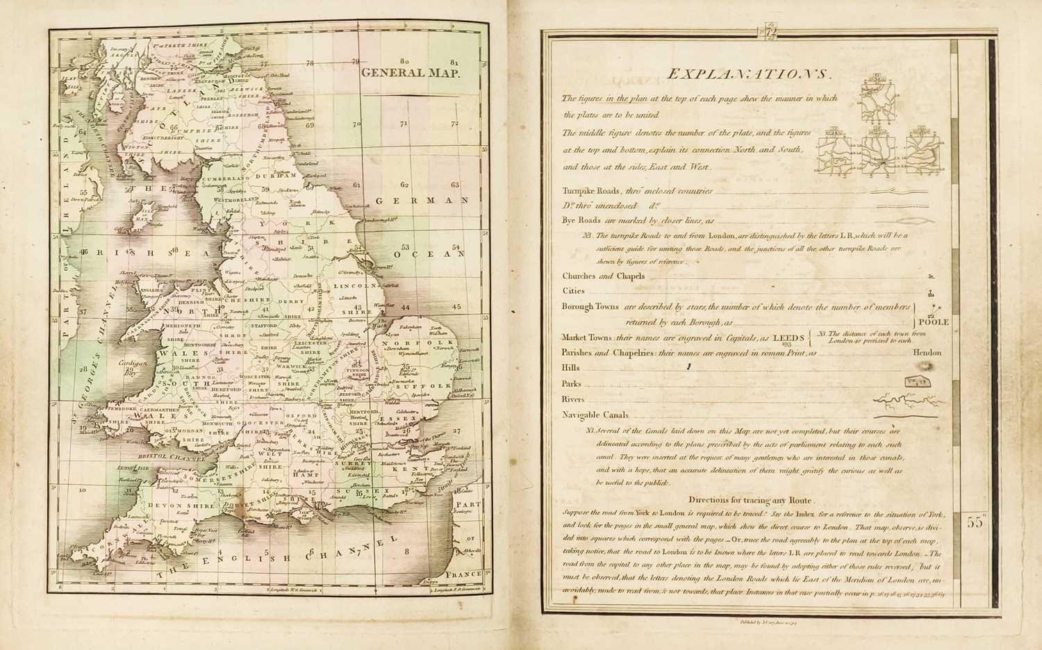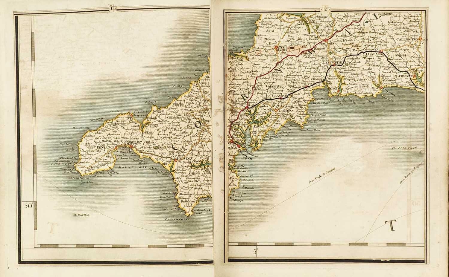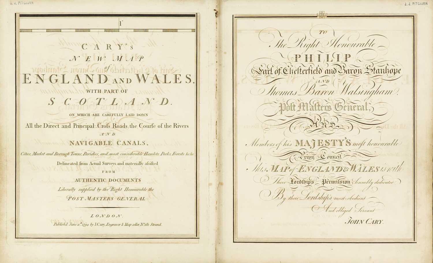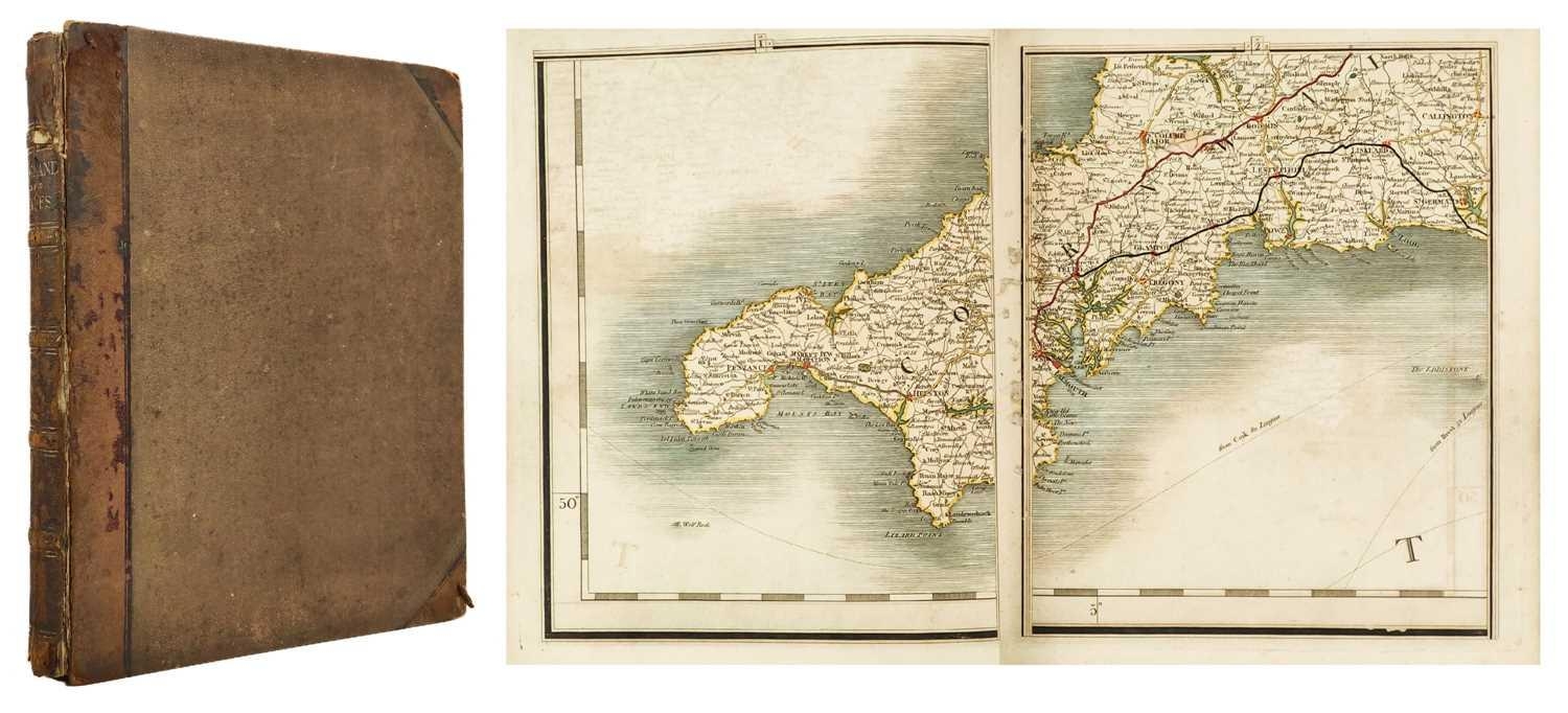 CARY, John (engraver). 'Cary's New Map of England and Wales, with Part of Scotland. on which are carefully laid down, All the Direct and Principal Cross Roads, the Course of the Rivers and Navigable Canals,' Half leather, rubbed and bumped with splitting to joints, engraved title and hand-coloured general map, 80 of 81 maps with map 62 missing as is the norm, ex libris of J. J. Pitcairn (R. Austin Freeman and Clifford Ashdown) with owner stamp to the head margin of titlepage and front endpapers, later newspaper articles pasted to front pastedown and front free endpaper, index to rear pp.85, three pages of subscribers, some toning, light spotting to margins but otherwise a vg textblock, J. Cary, London, 1794. Cary's map incorporated the latest cartographic techniques of the period, including precise surveying and engraving methods. It set a standard for mapmaking that influenced future cartographers and contributed to the development of modern cartography. This is a good example of this aesthetically pleasing atlas, with a rather interesting former owner.