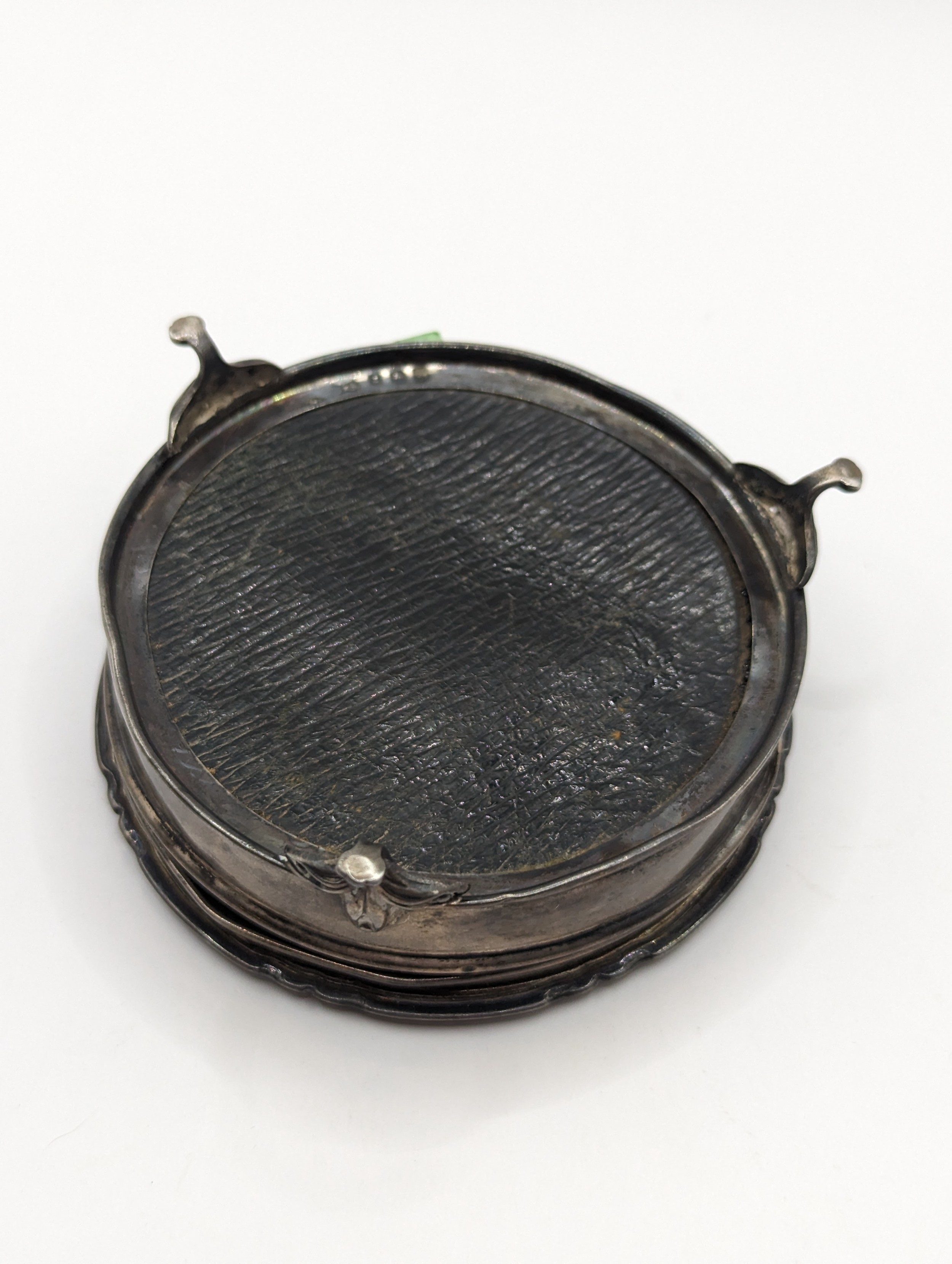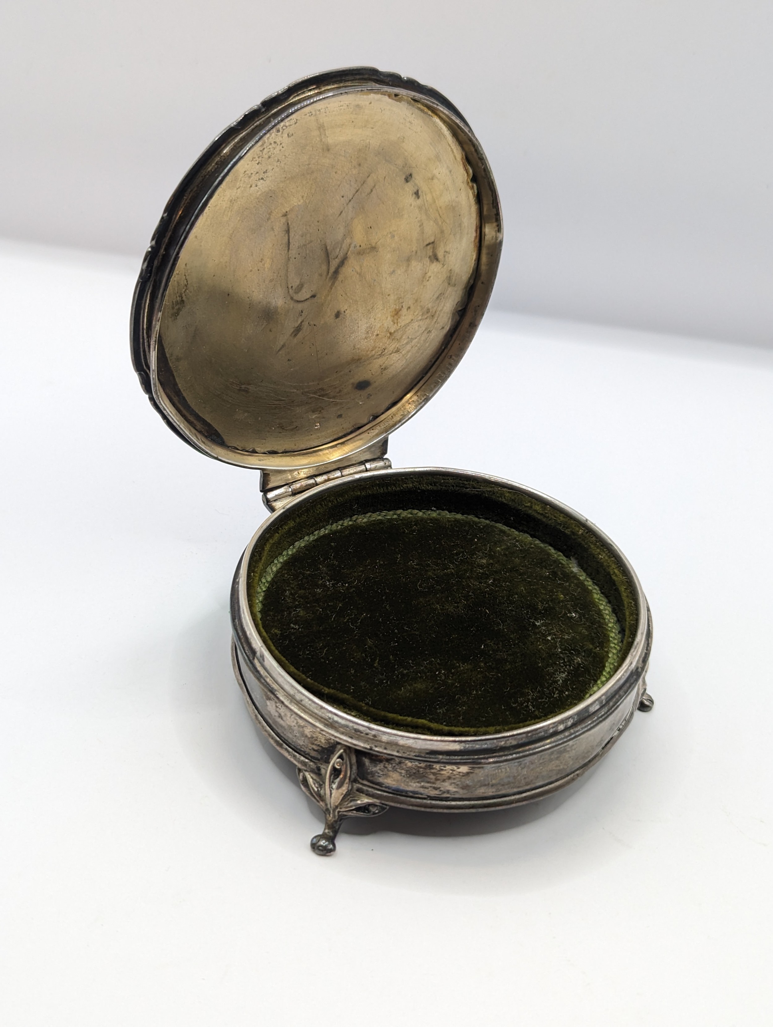 George V silver jewellery box, Synyer & Beddoes, Birmingham 1919, of circular footed form, lid diameter 9cm, gross weight 171.6 grams