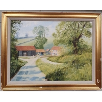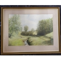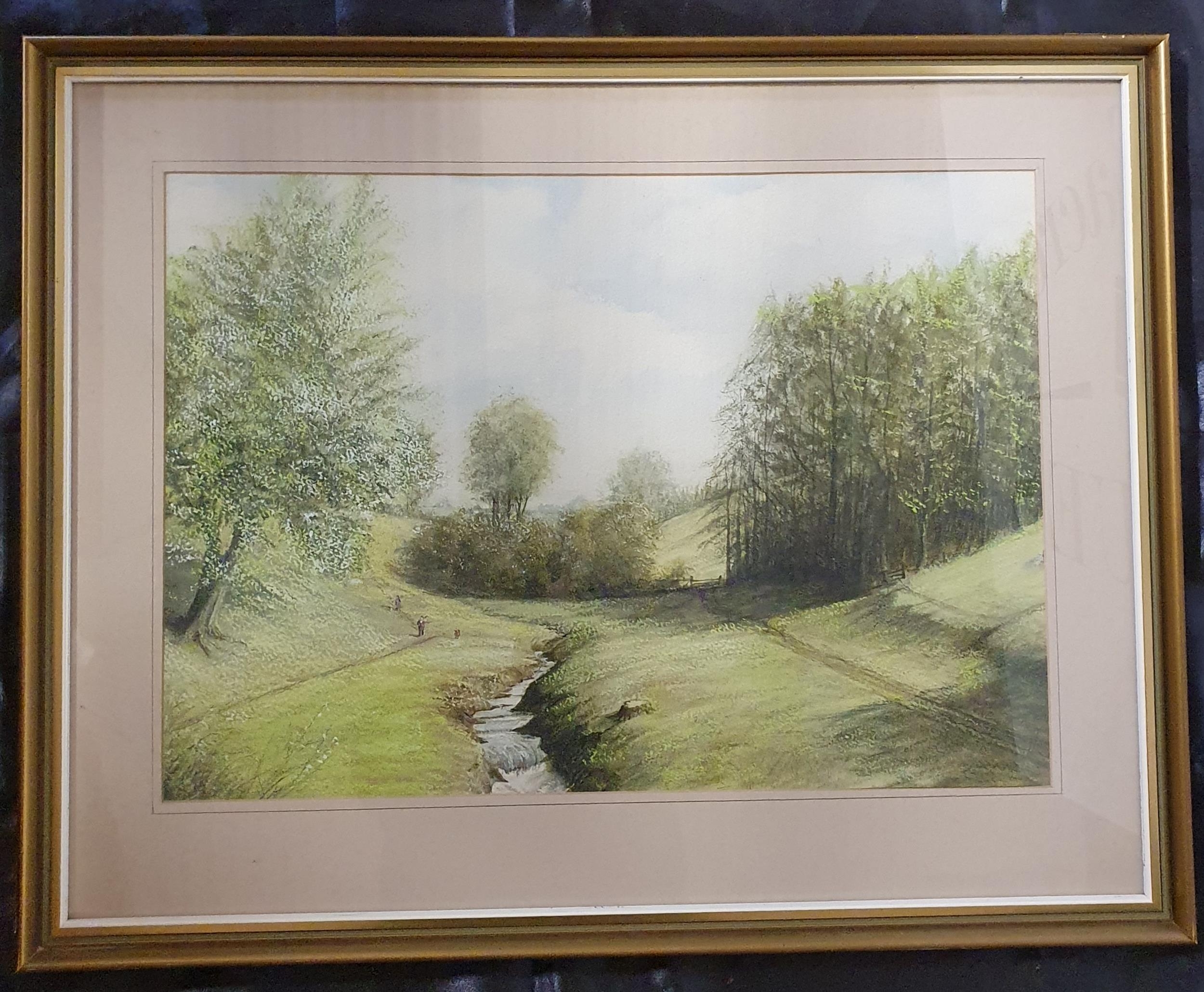 A 20th Century Pastel of people walking along a path and stream no apparent signature. 32 x 46cm approx.