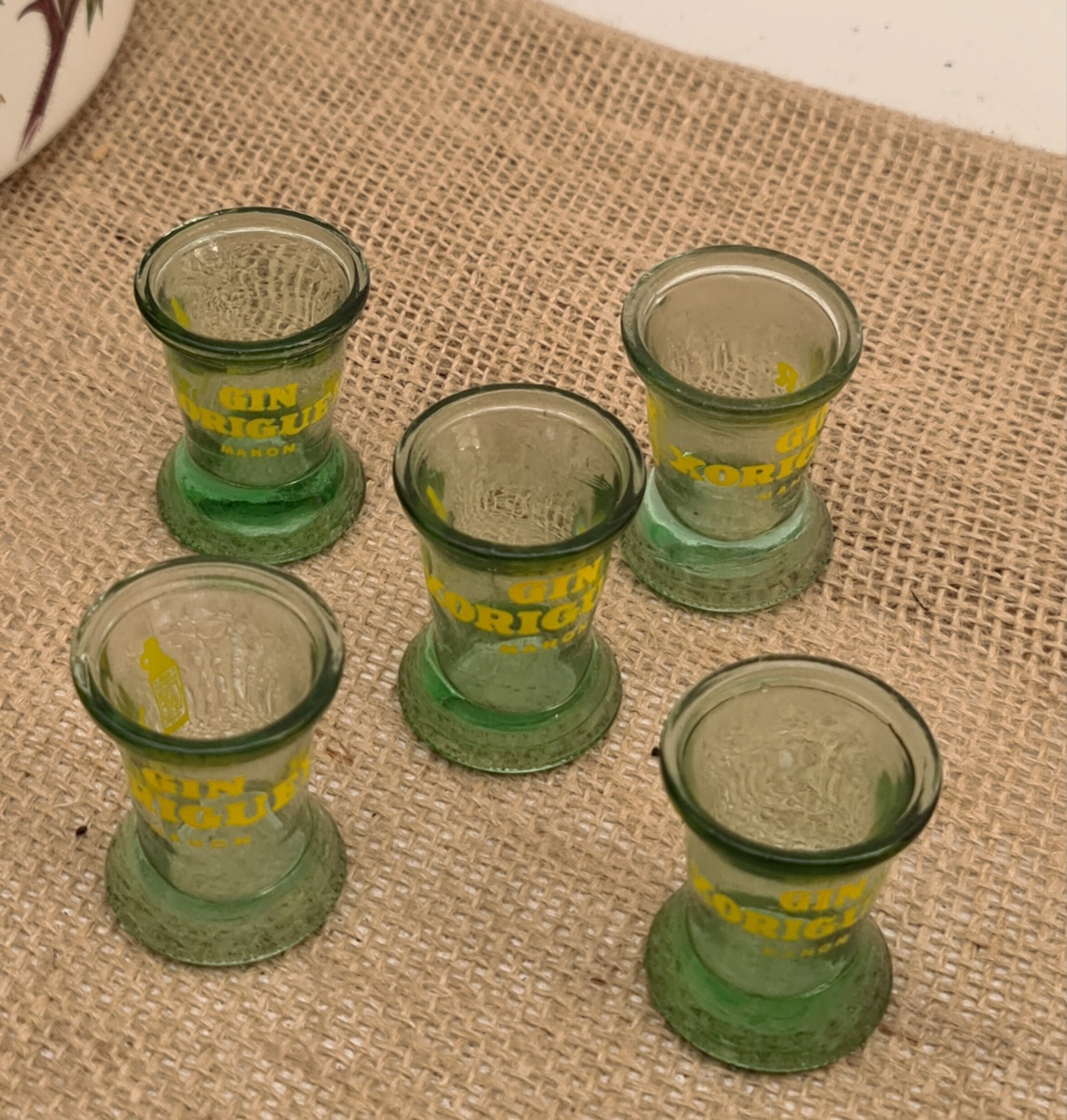 Parcel of 5 Vintage Moulded Gin Shot Glasses. Green with Yellow Xoriguer Mahon Gin Motif. Each Measure 4.5cm tall. Shipping is available. Please ask for a quote before bidding. Where possible we combine shipping costs. Remember, if you are the highest bidder above reserve on this Lot you have bought the item and are legally responsible for the item. Viewing is recommended in either person or via video link. Contact us to arrange.