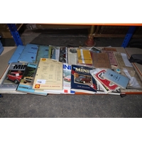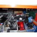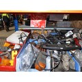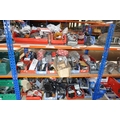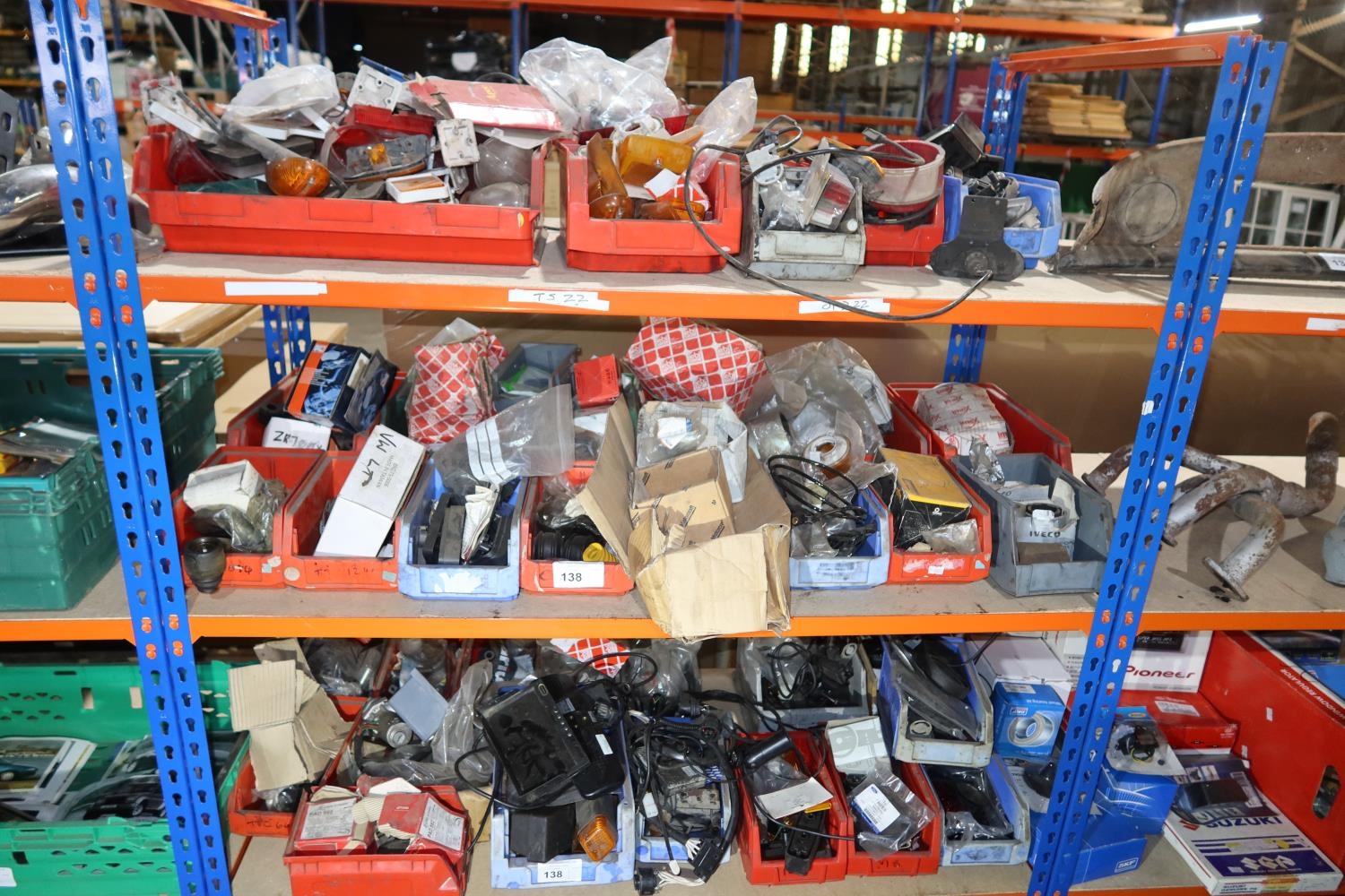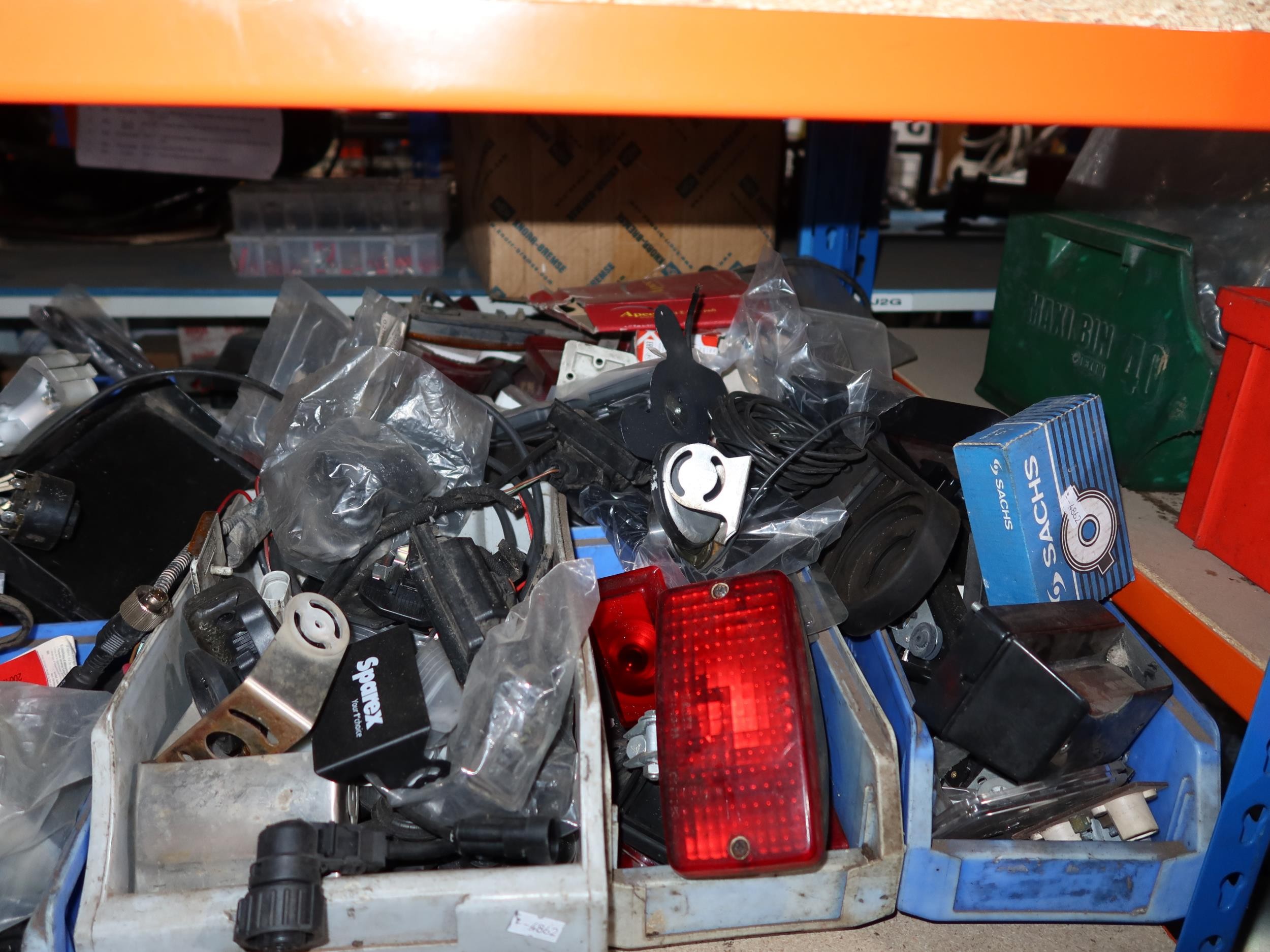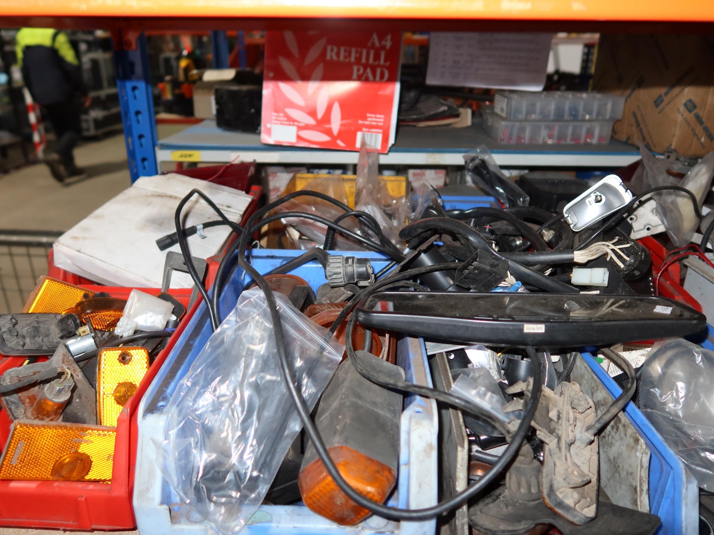 A quantity of plastic Lin type storage bins containing various auto related items including indicators, reflectors, brackets, a digital mirror monitor, brake pads, tie rod / drag link ends, a king pin set etc. Contents of 3 shelves