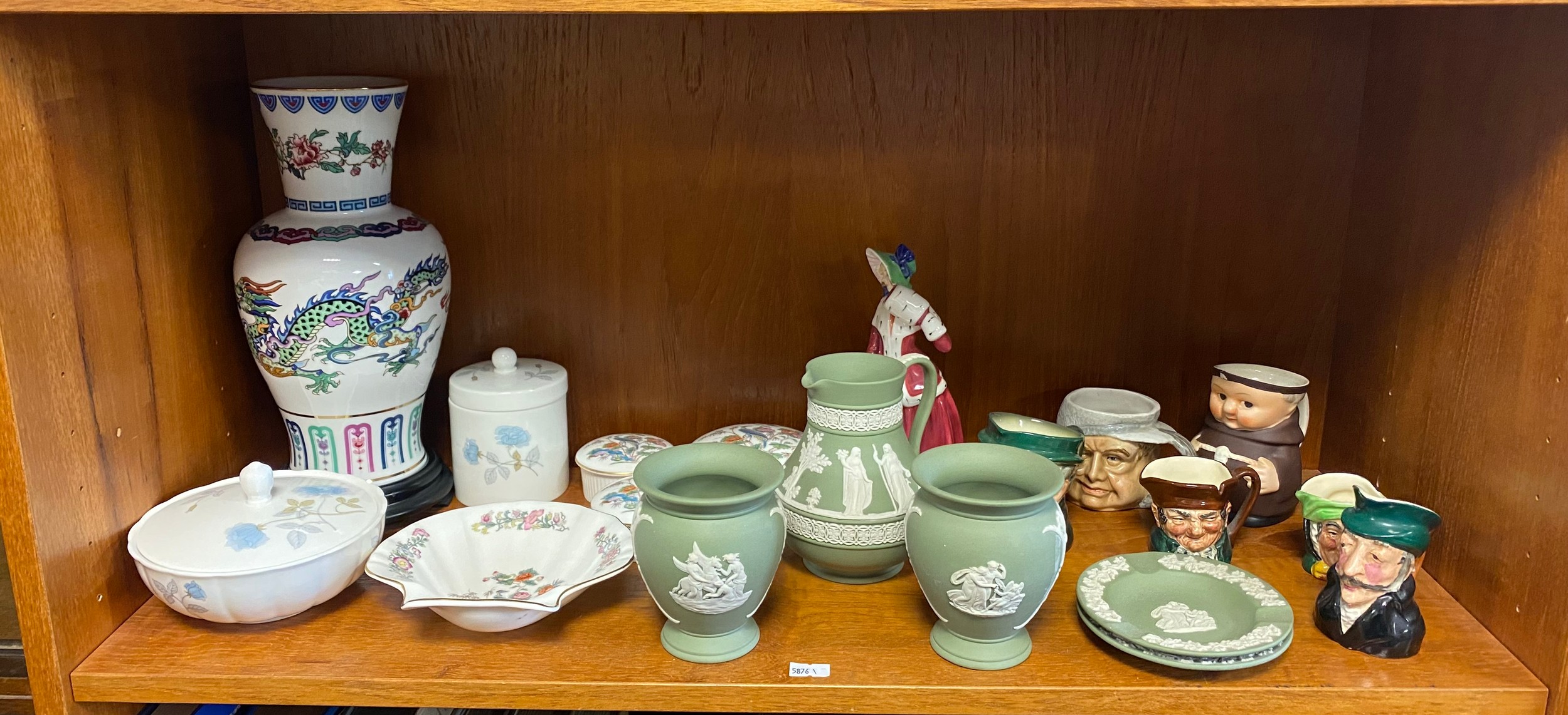 A group of decorative china items, including Wedgwood green jasper jug and vases, Royal Doulton figure, Wedgwood dressing table items etc -