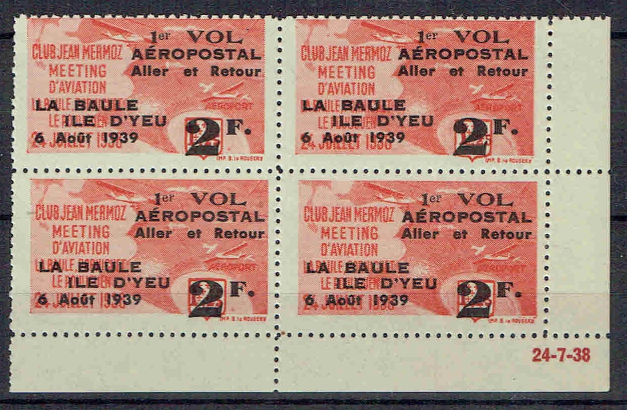 REVENUES & CINDERELLA - France: 1939 1st Flight Airpost La Baule 2F surcharge in red on Club Mermoz Meeting labels in red. Fine bottom right marginal U/M block of 4, with date imprint.