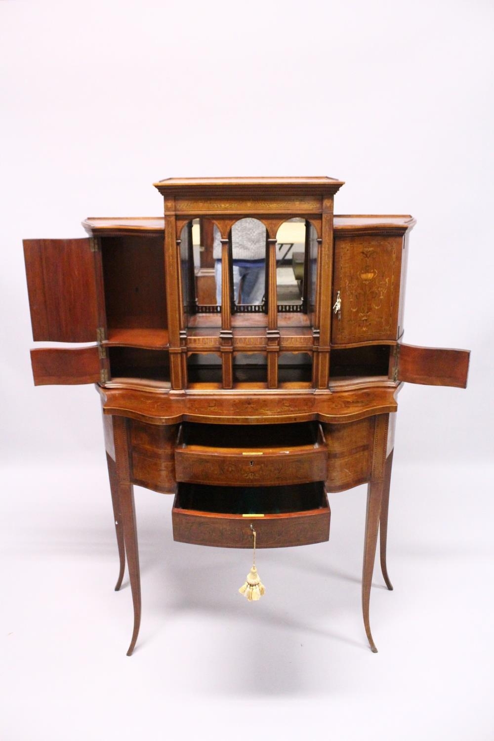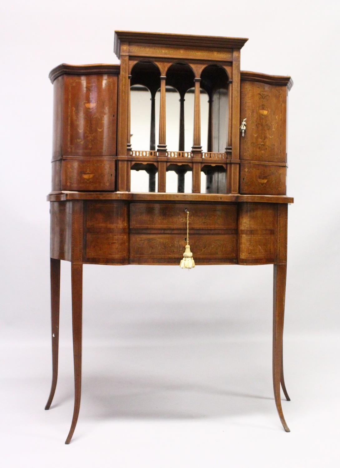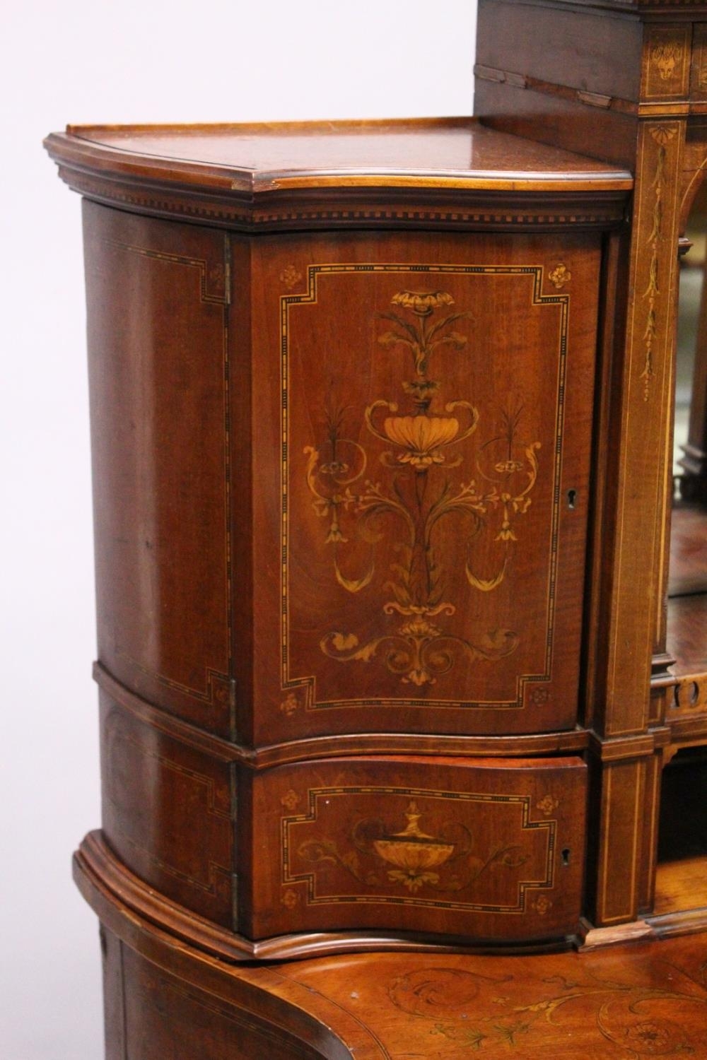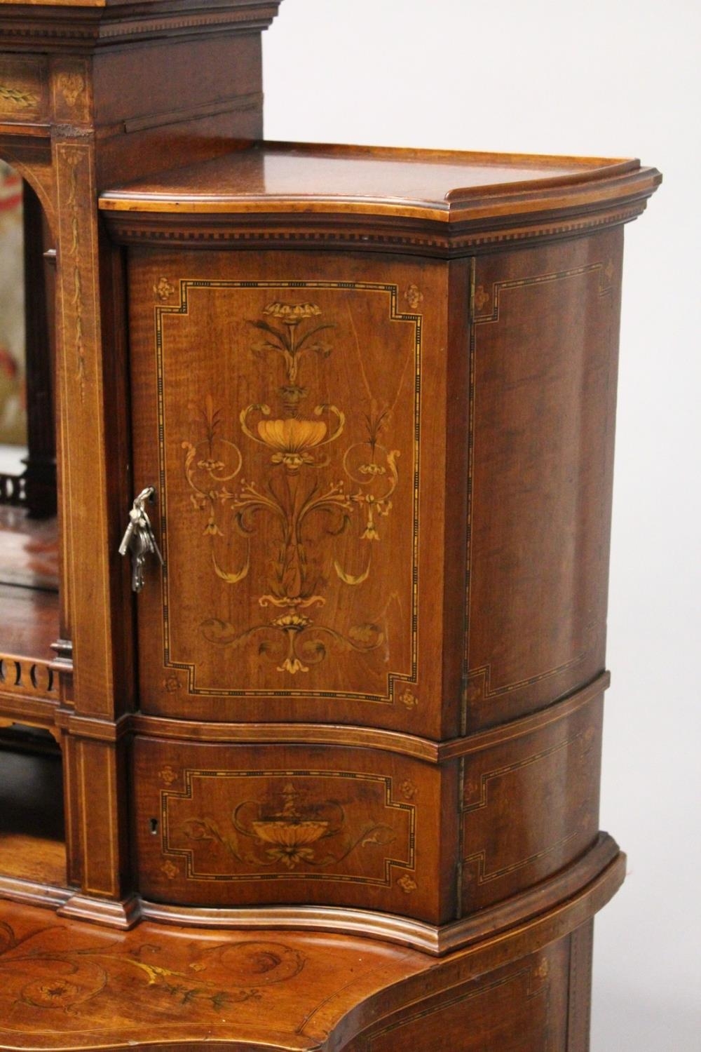 A VERY GOOD EDWARDIAN SHERATON REVIVAL SIDE CABINET, the upper section with a mirror back, galleried shelf with a tapering square columns, flanked by a pair of serpentine fronted doors over a similar pair of small doors, the shaped base with two central drawers flanked by serpentine panels, supported on slender tapering sabre legs. The whole of the cabinet profusely inlaid in the classical style with figures, urns and floral motifs.