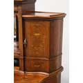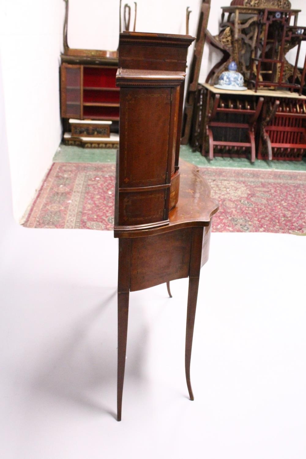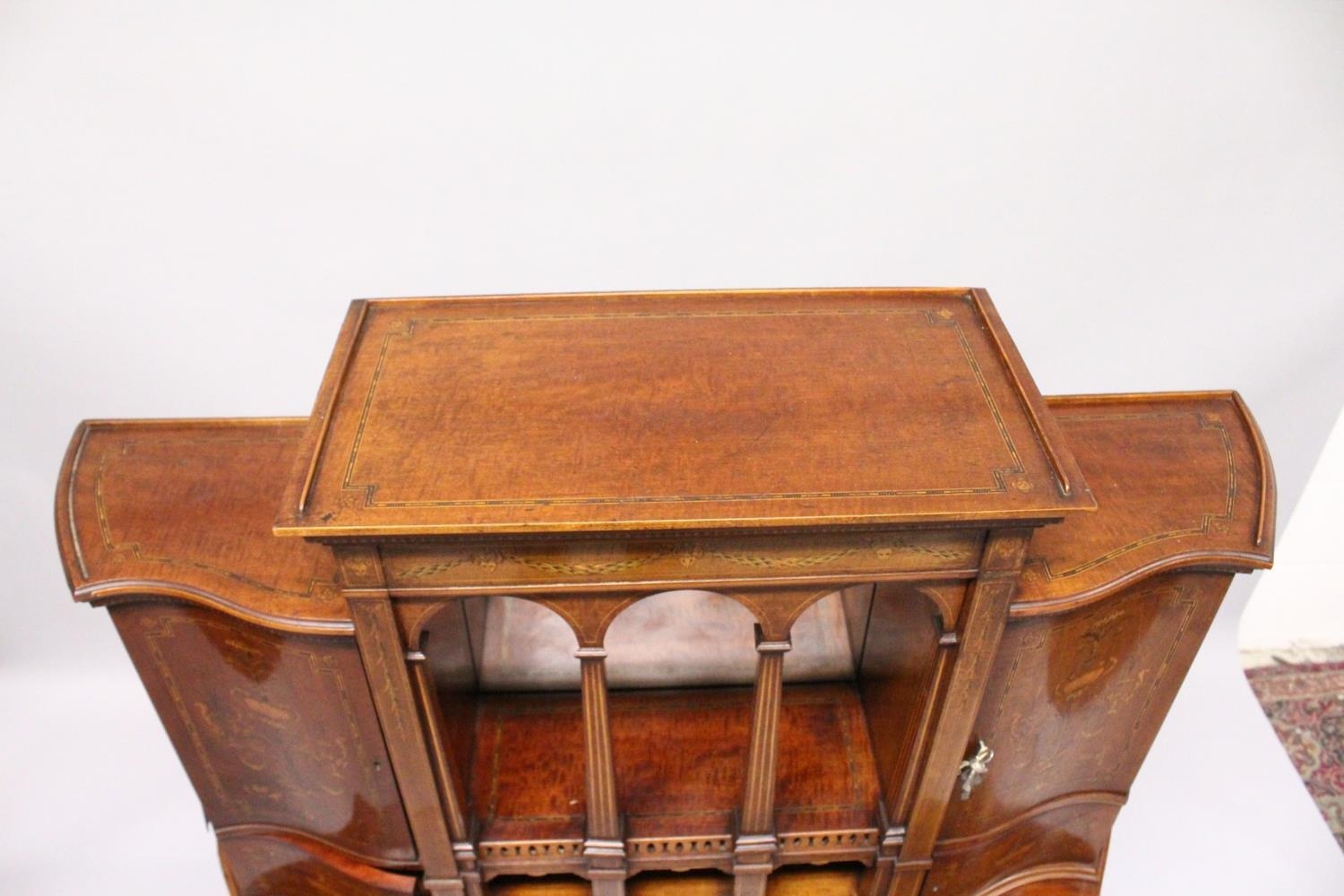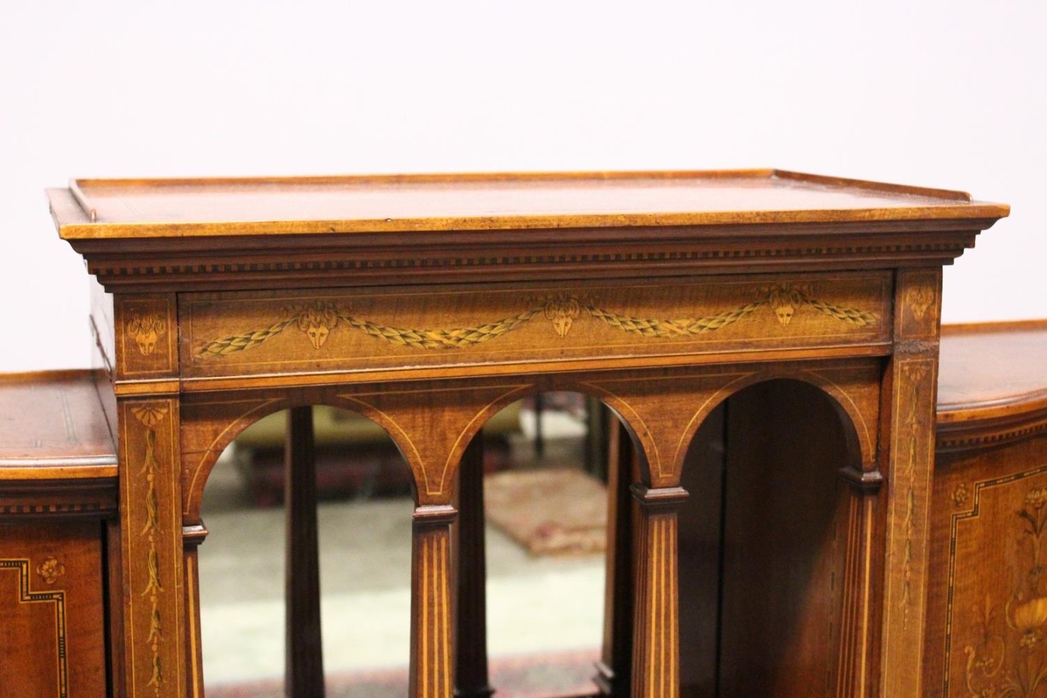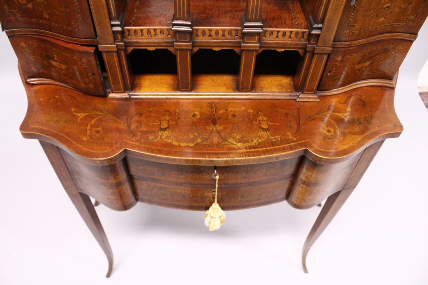 A VERY GOOD EDWARDIAN SHERATON REVIVAL SIDE CABINET, the upper section with a mirror back, galleried shelf with a tapering square columns, flanked by a pair of serpentine fronted doors over a similar pair of small doors, the shaped base with two central drawers flanked by serpentine panels, supported on slender tapering sabre legs. The whole of the cabinet profusely inlaid in the classical style with figures, urns and floral motifs.