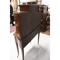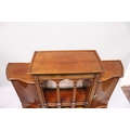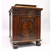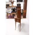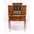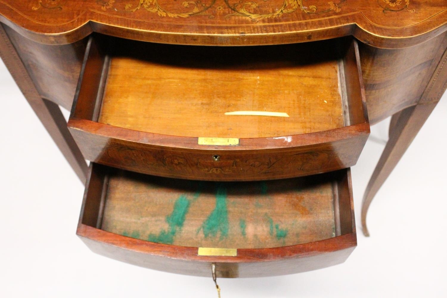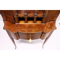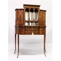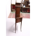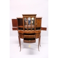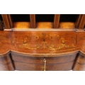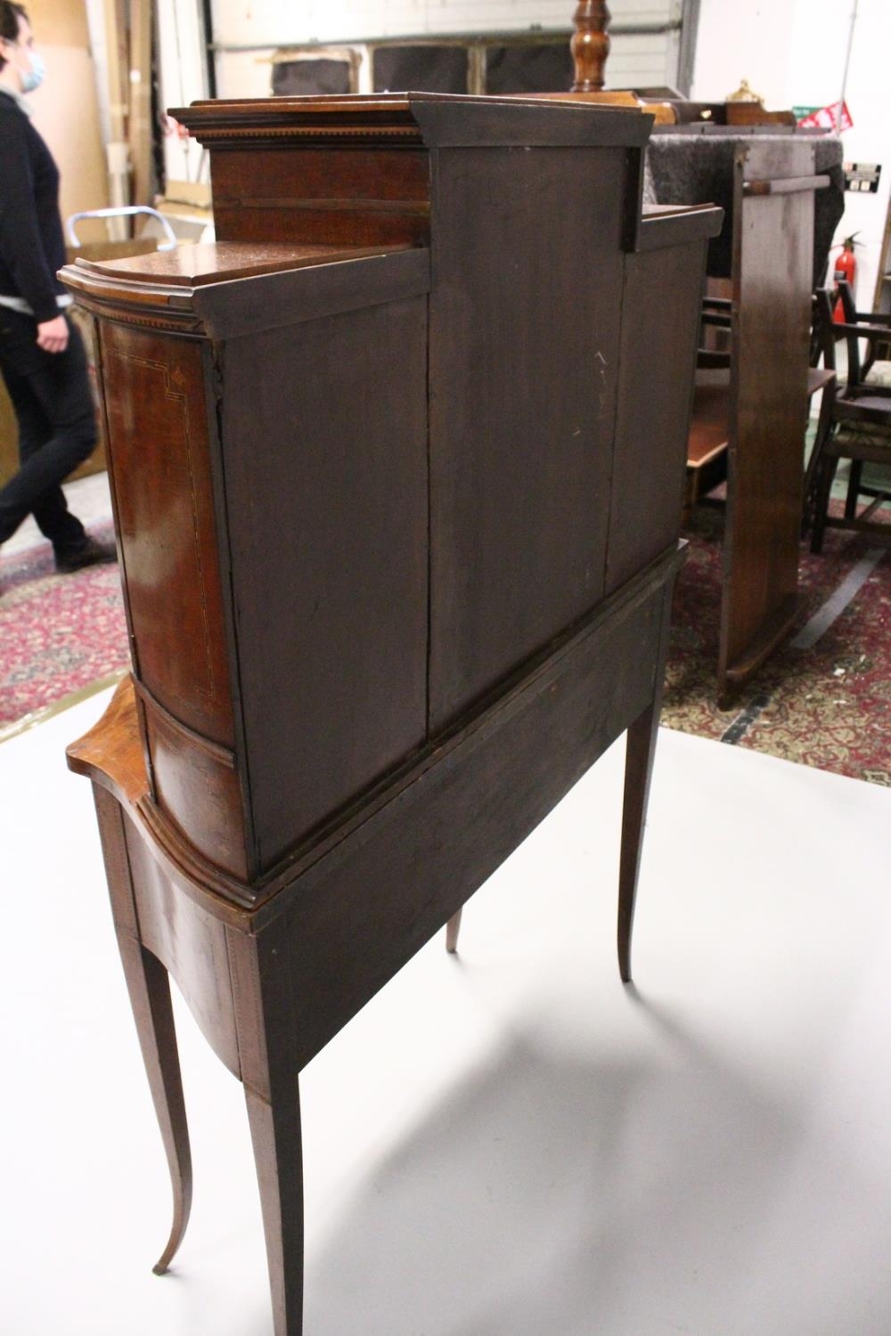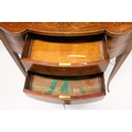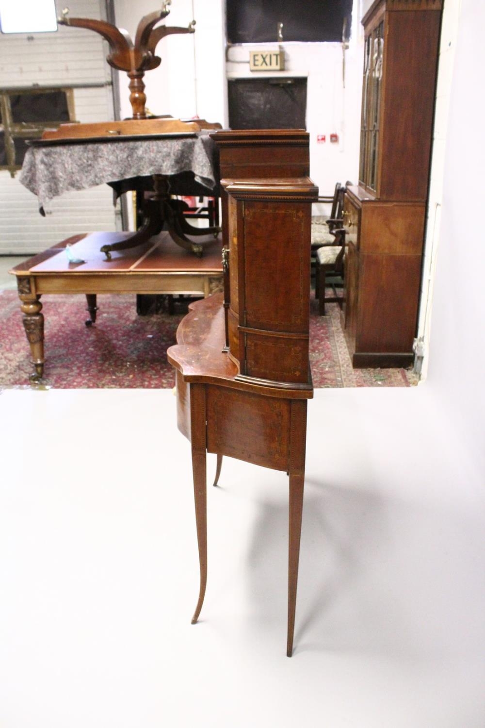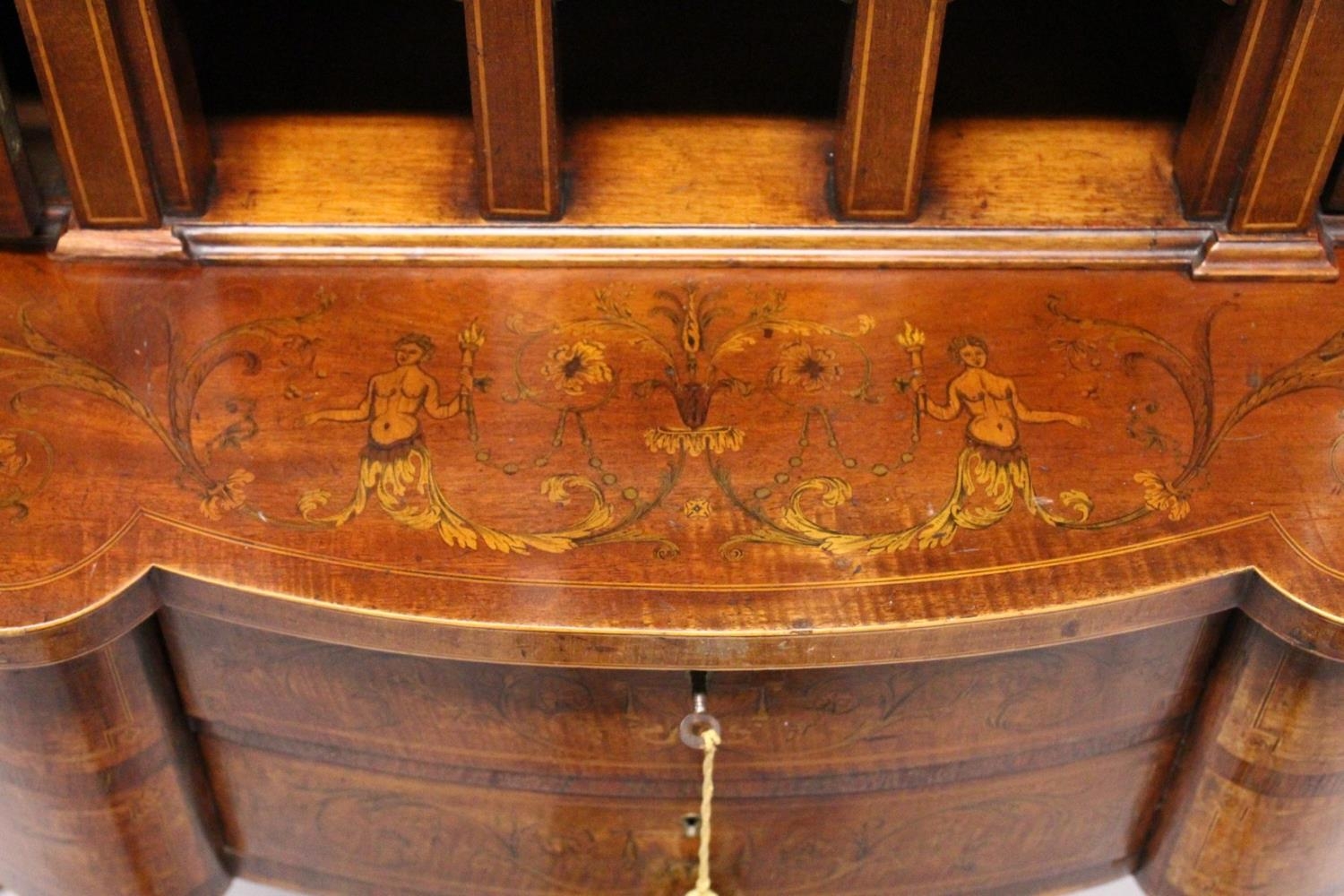 A VERY GOOD EDWARDIAN SHERATON REVIVAL SIDE CABINET, the upper section with a mirror back, galleried shelf with a tapering square columns, flanked by a pair of serpentine fronted doors over a similar pair of small doors, the shaped base with two central drawers flanked by serpentine panels, supported on slender tapering sabre legs. The whole of the cabinet profusely inlaid in the classical style with figures, urns and floral motifs.