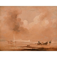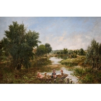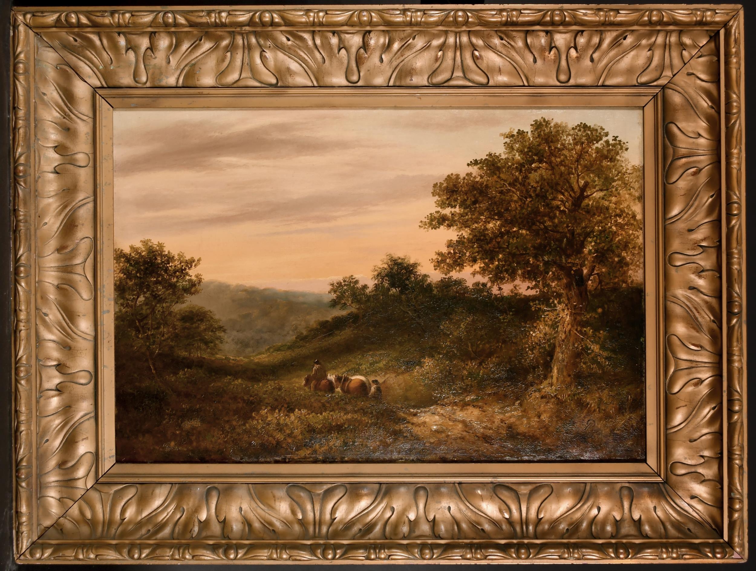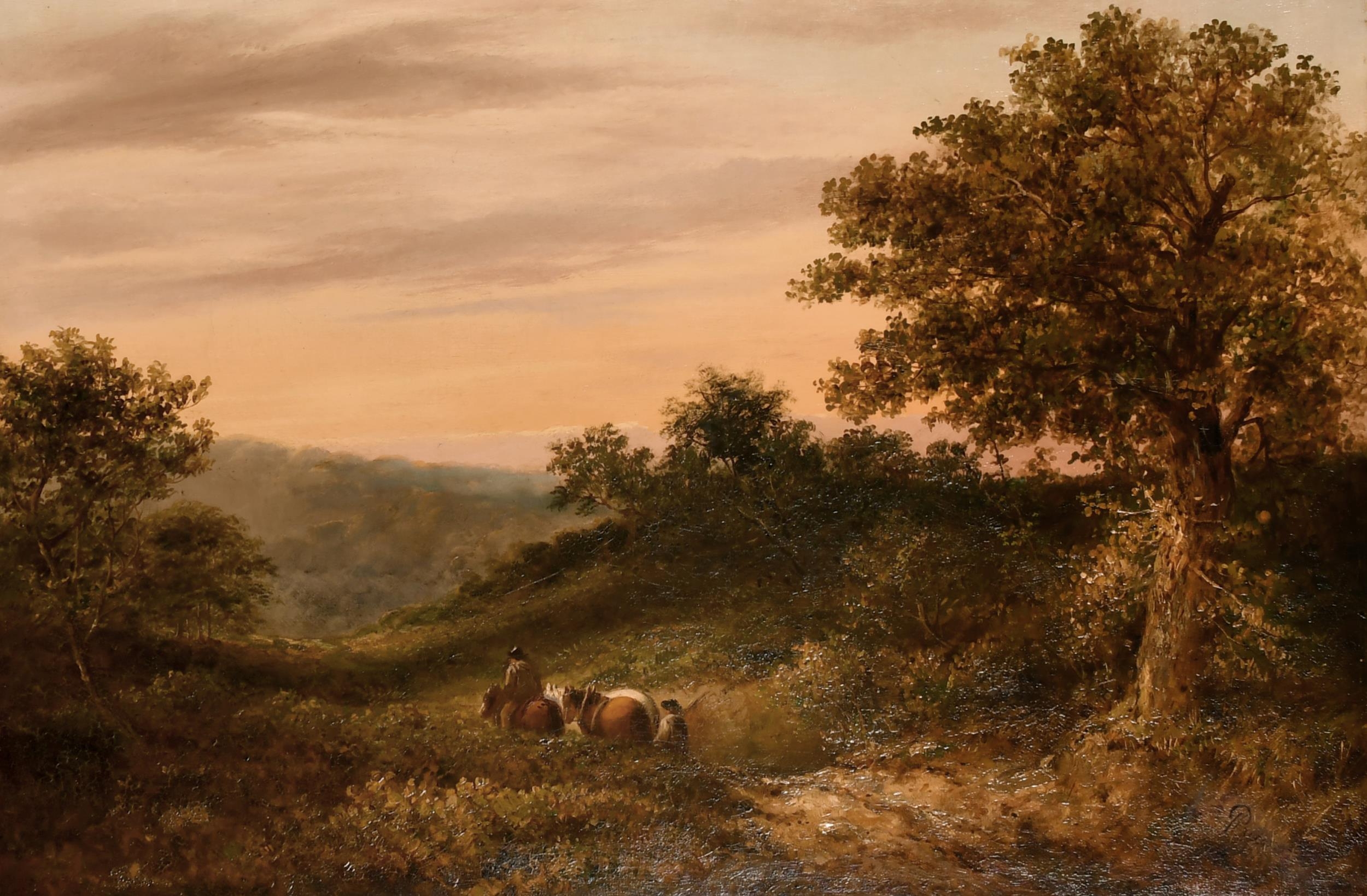 James Price (act.1842-1876) British. A Landscape at Sunset with Farmers returning Home, Oil on Canvas, Signed, Indistinctly Inscribed verso, 20" x 30" (50.8 x 76.2cm)