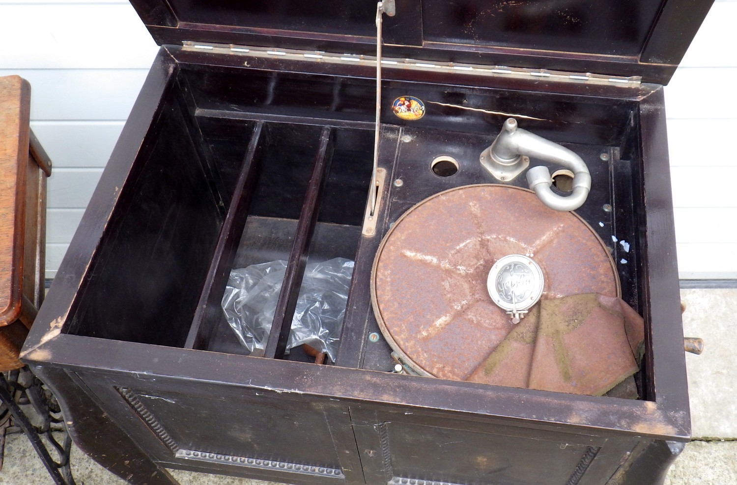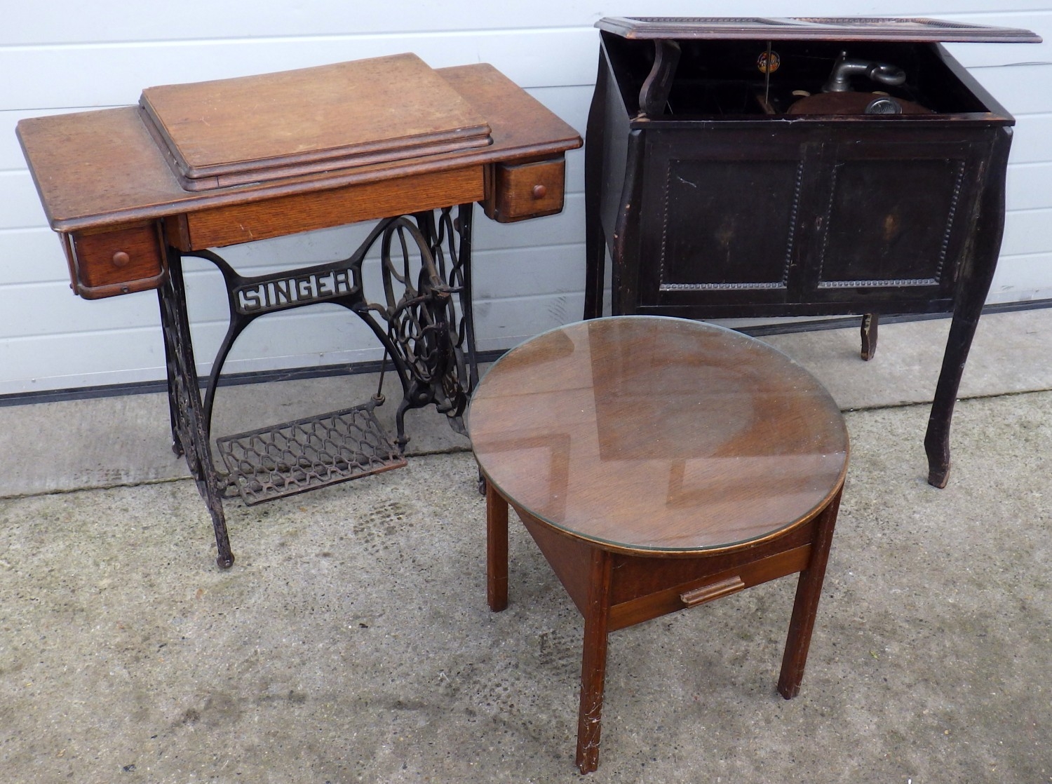A Singer treadle sewing machine together with a sewing table and a gramophone (a/f) (3)