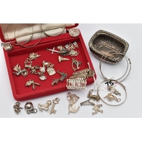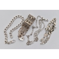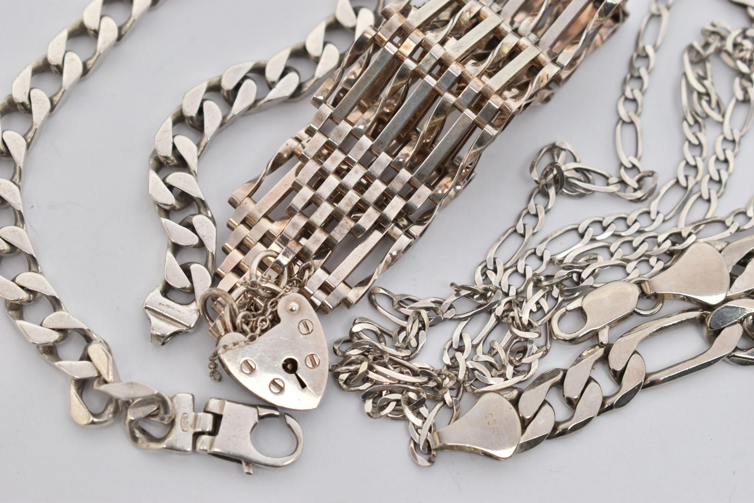 A SMALL ASSORTMENT OF SILVER AND WHITE METAL JEWELLERY, to include a wide silver gate bracelet, fitted with a heart padlock clasp, hallmarked London, a flat figaro necklace, fitted with a lobster clasp, approximate length 623mm, hallmarked Sheffield import, approximate gross weight 33.8 grams, a white metal flat link curb bracelet, fitted with a lobster clasp, approximate length 232mm, stamped 925, a white metal figaro chain bracelet, fitted with a lobster clasp, approximate length 225mm, stamped 925, approximate gross weight 47.2 grams, (condition report: general moderate wear, overall condition good)