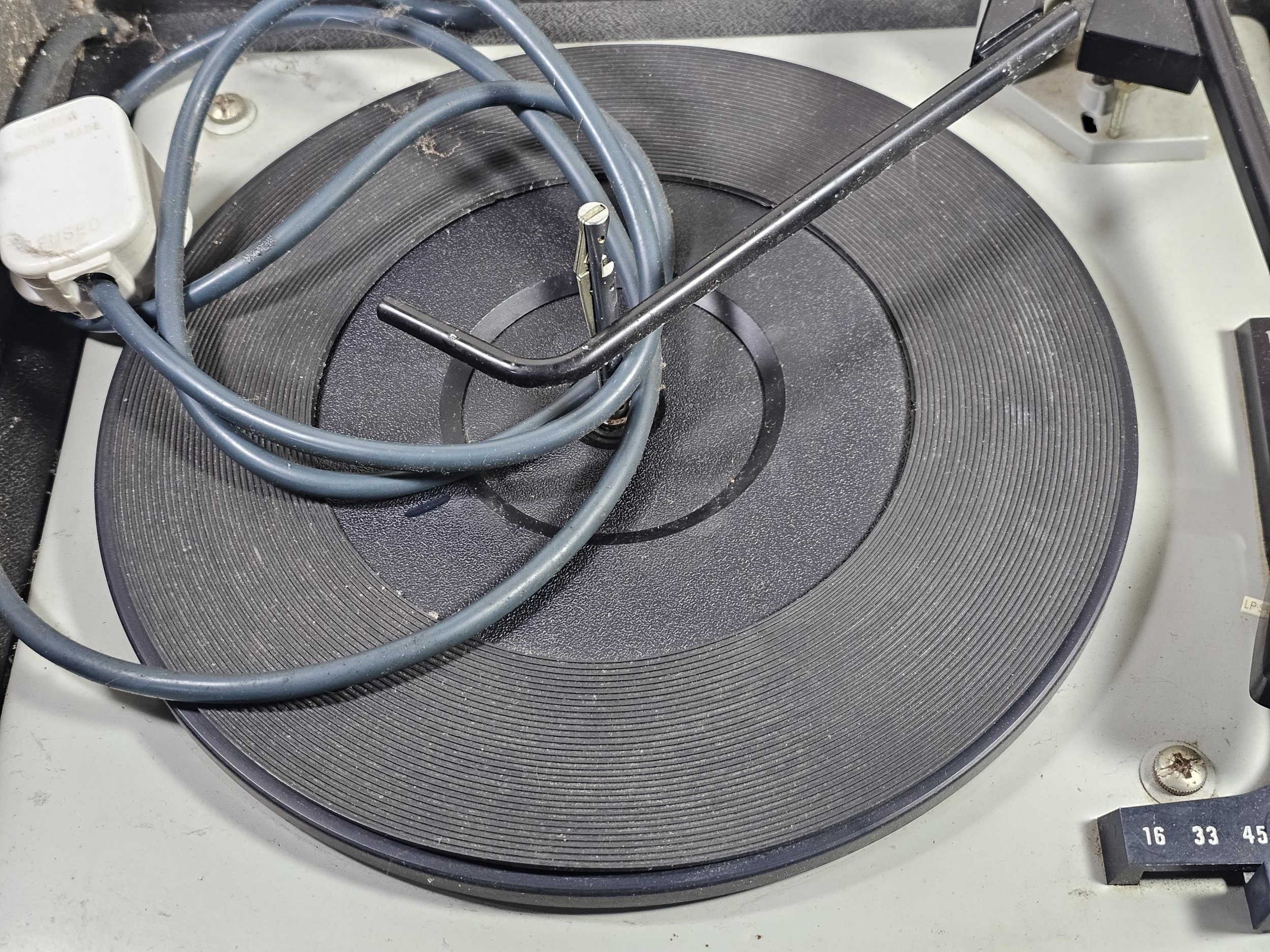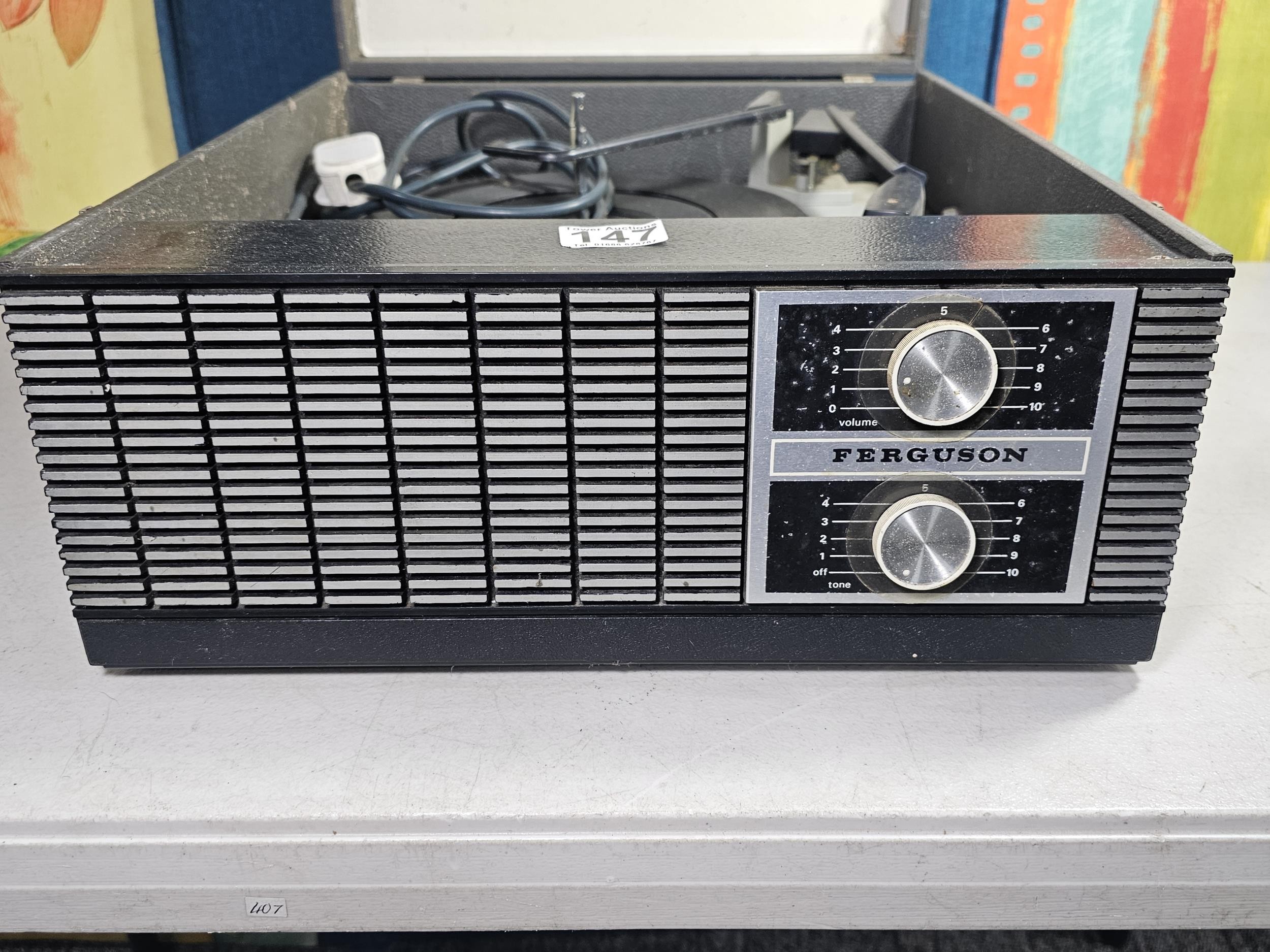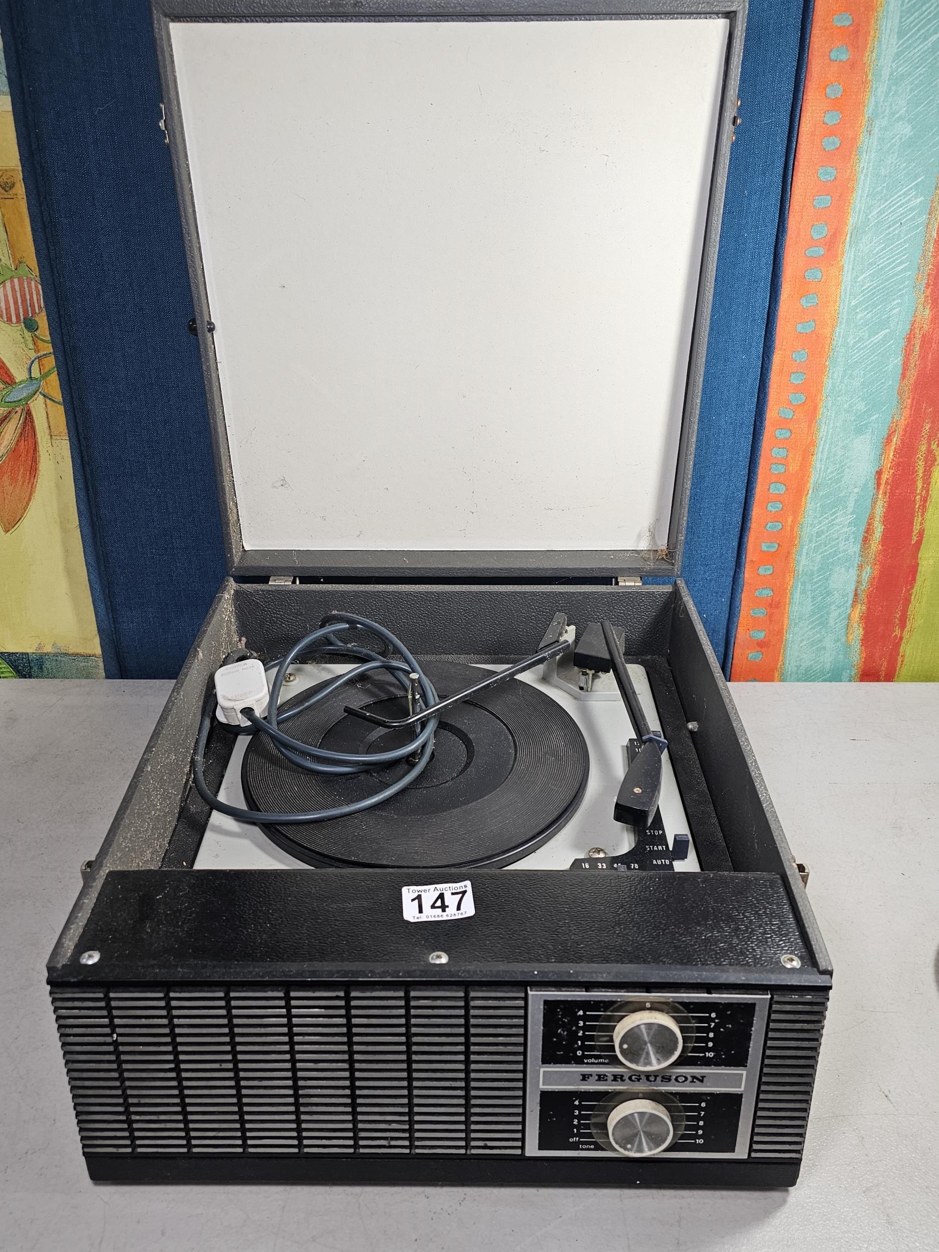 Vintage Ferguson table top record player, with lift up lid and built in speaker to the front, the record player is 4 speed, complete with power cable, due to the vintage nature of this item we can not guarantee its in working order.