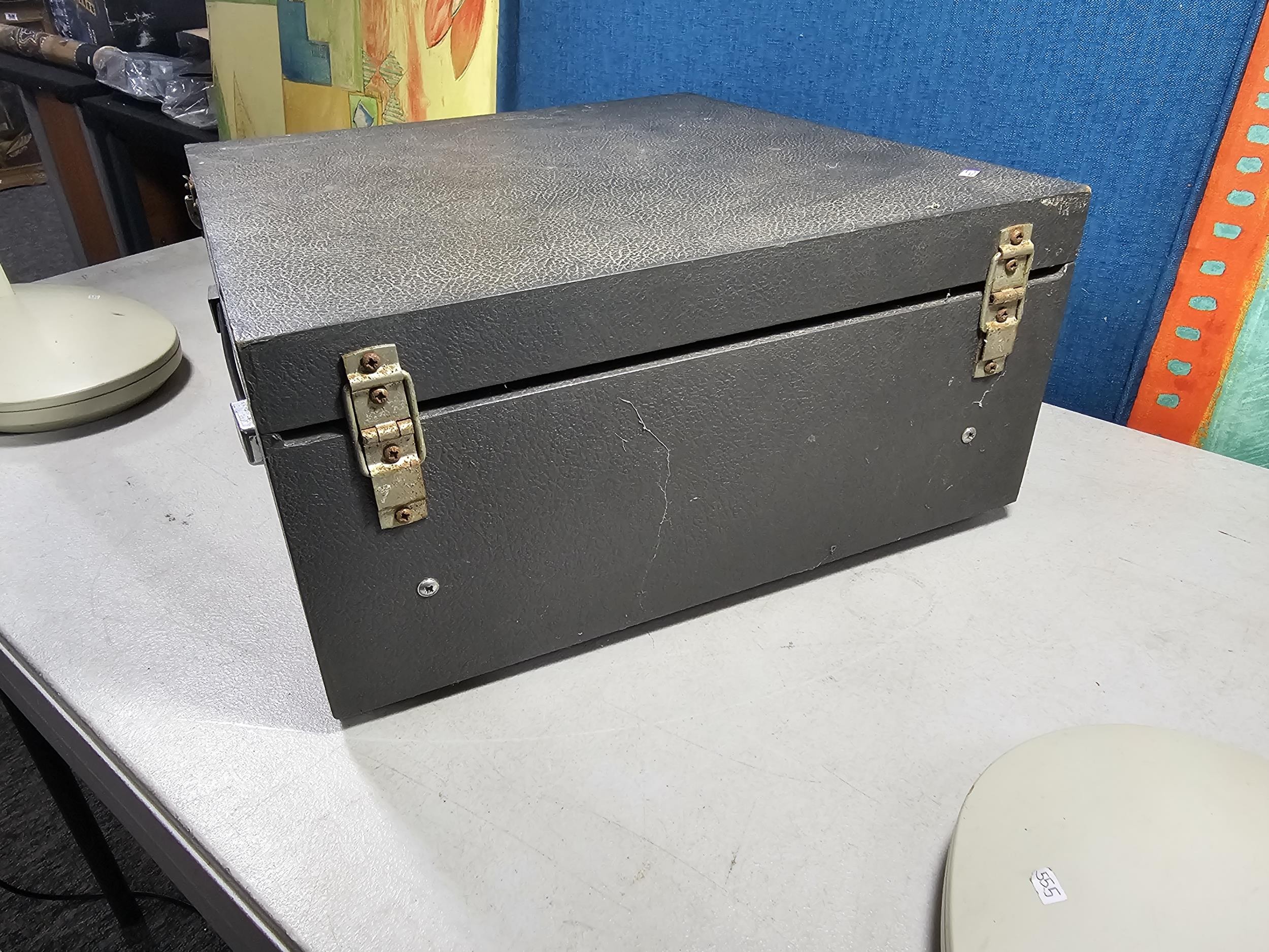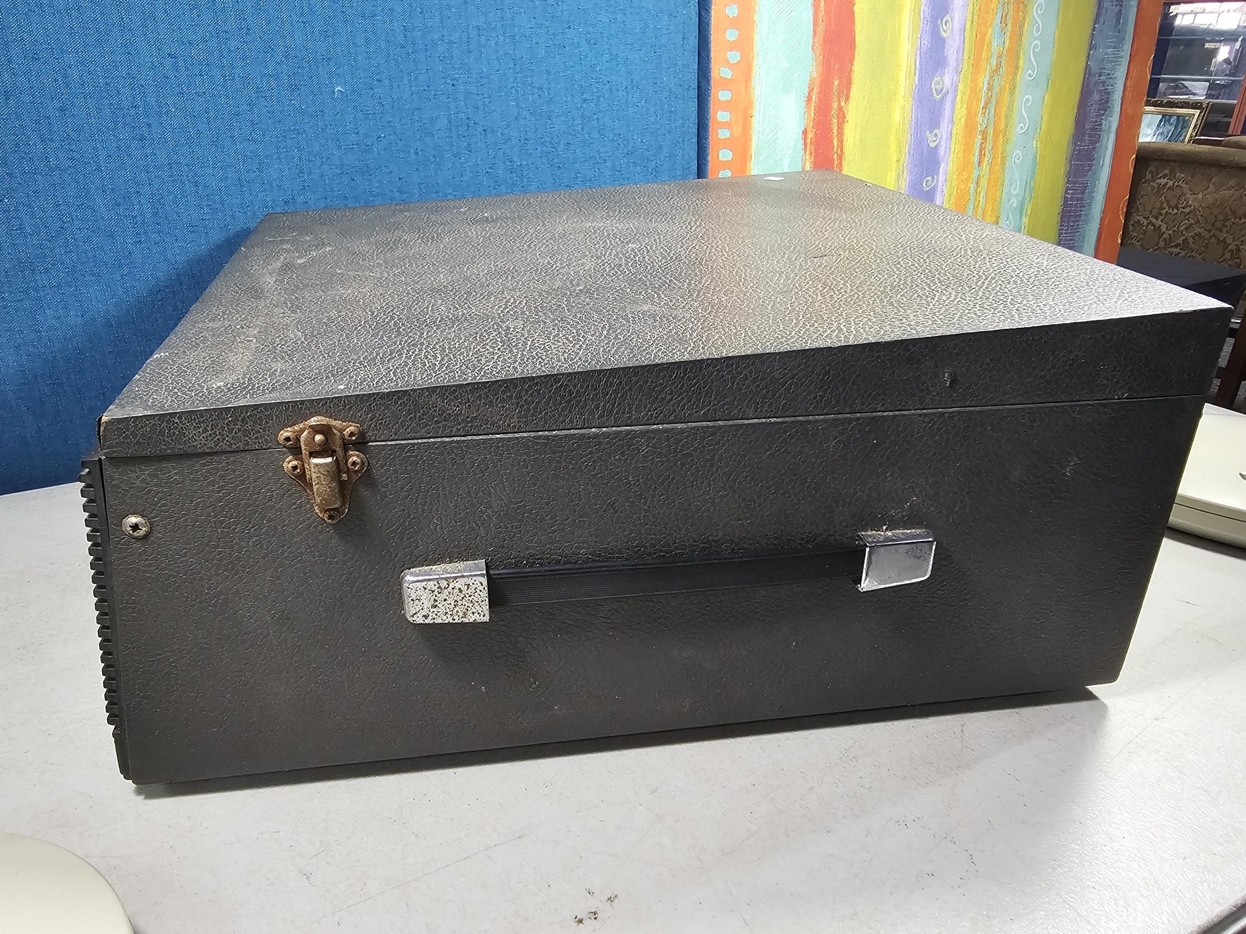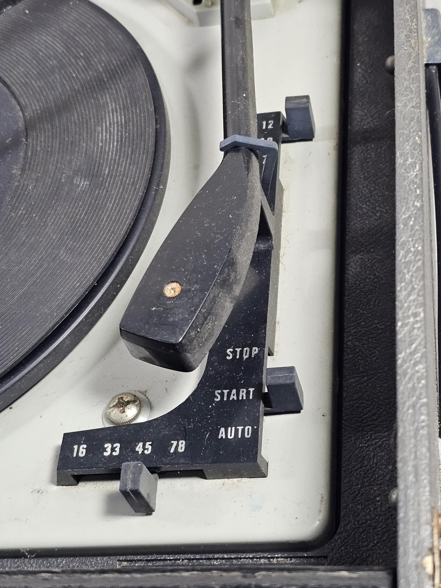 Vintage Ferguson table top record player, with lift up lid and built in speaker to the front, the record player is 4 speed, complete with power cable, due to the vintage nature of this item we can not guarantee its in working order.