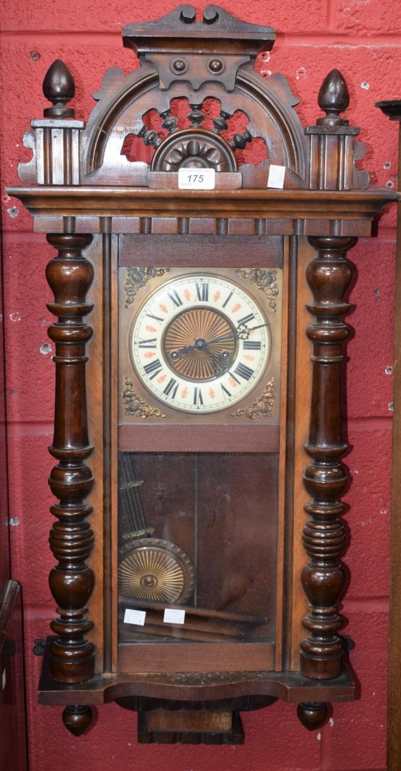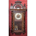 A mahogany cased Vienna type wall clock, Roman numerals, turned supports