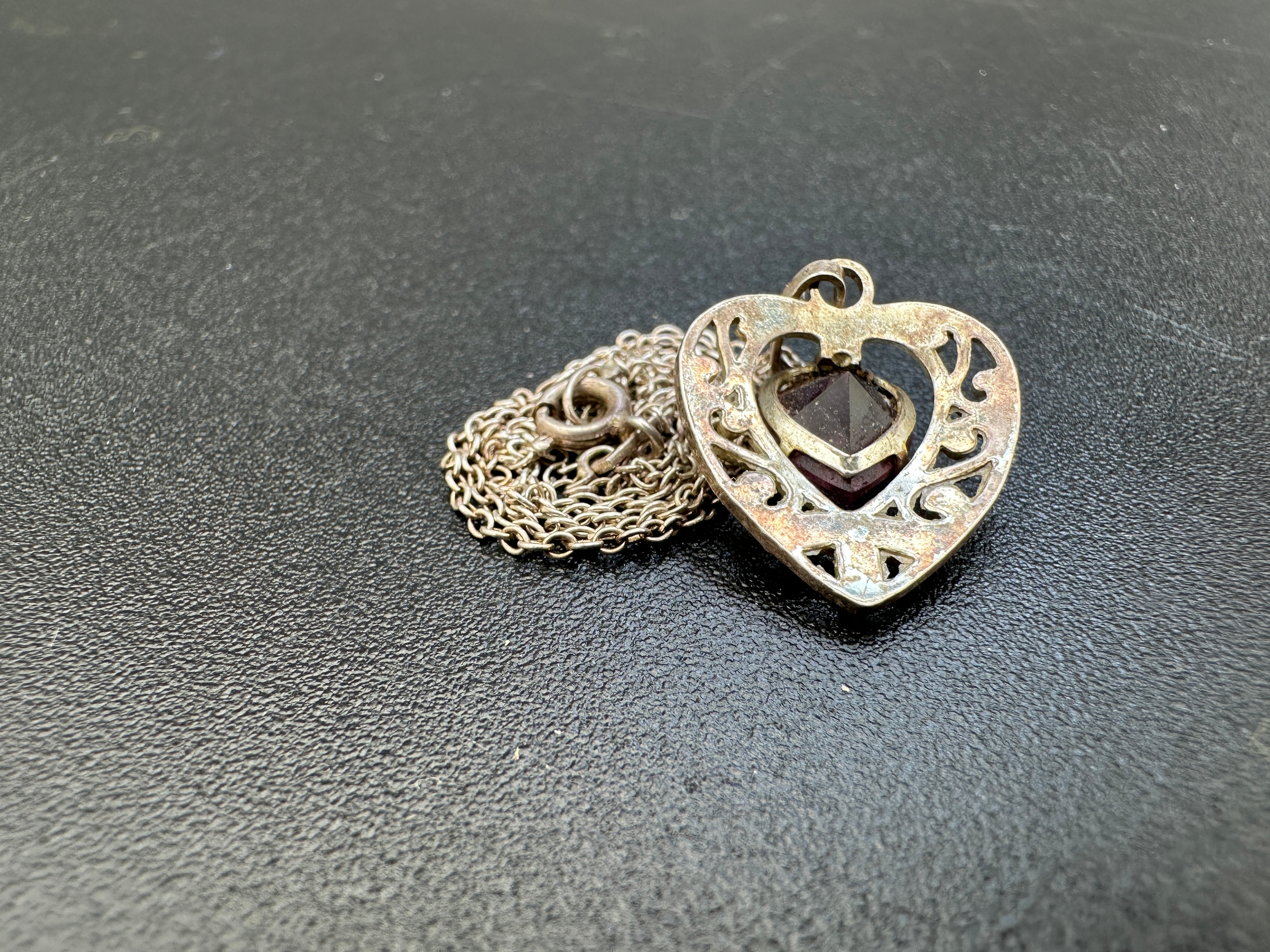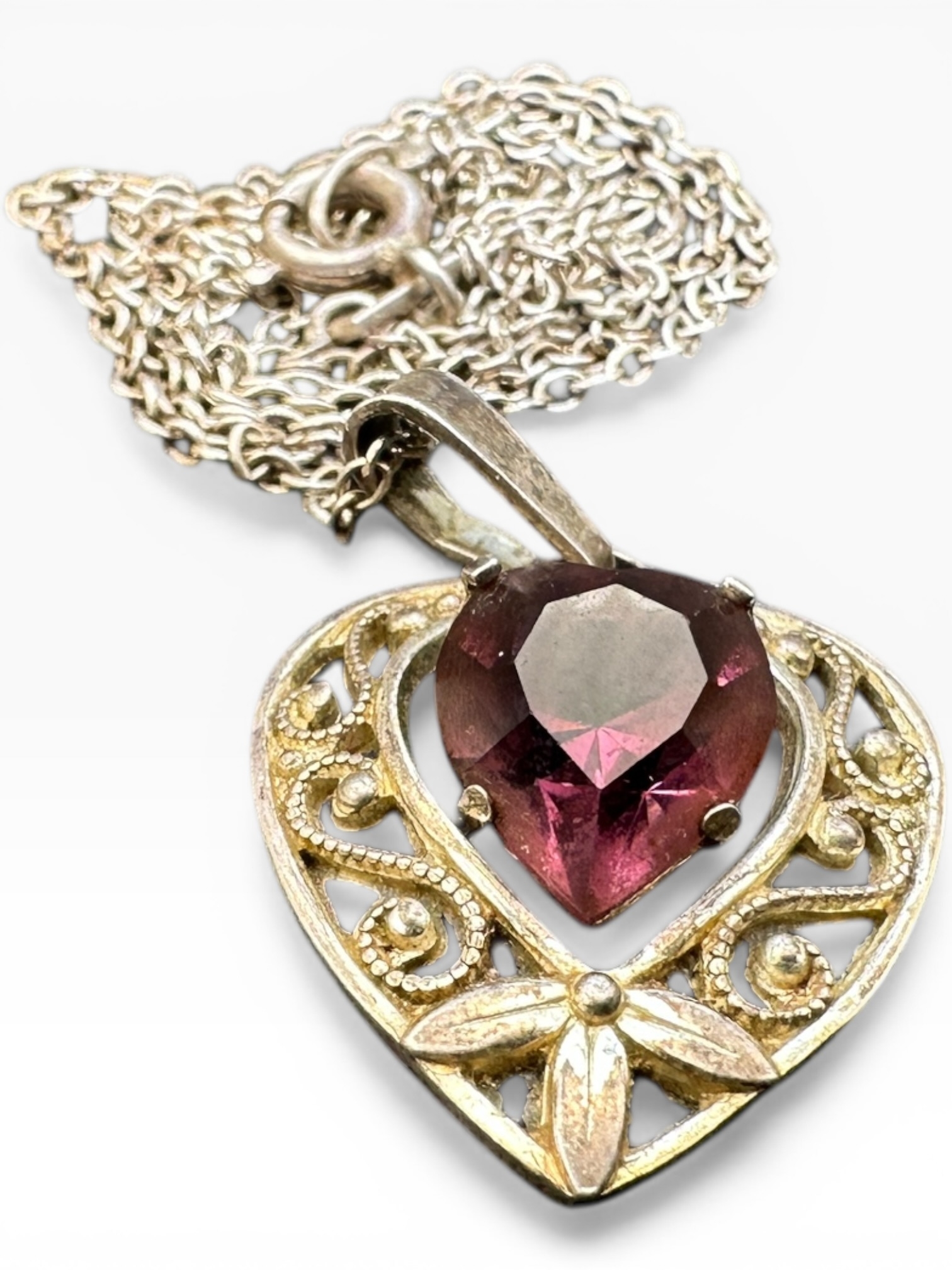 Silver Heart Shaped Pendant with Pink Stone on Silver Chain. 3.45g