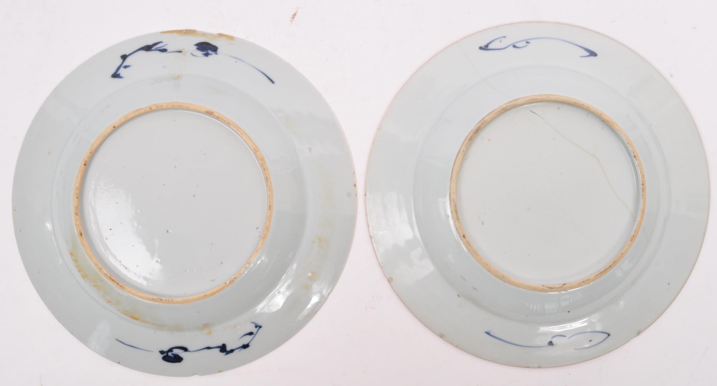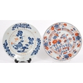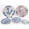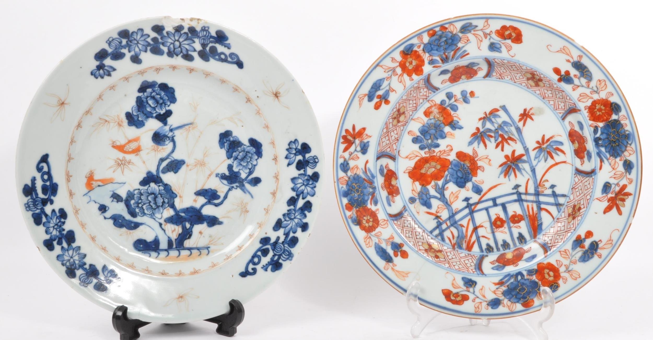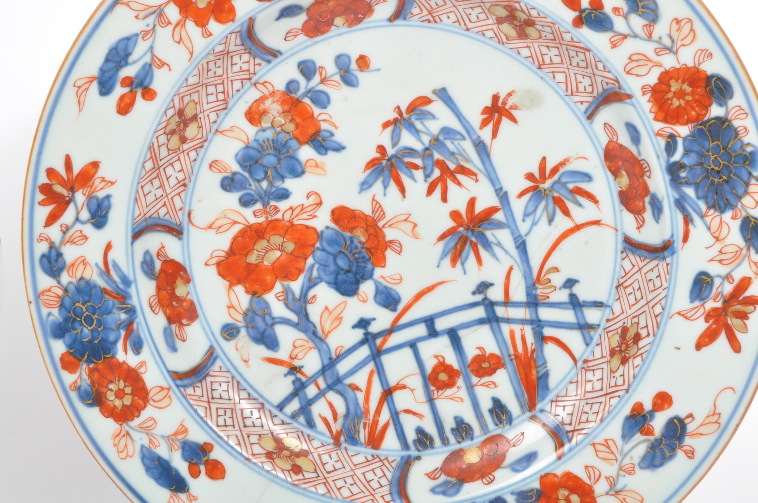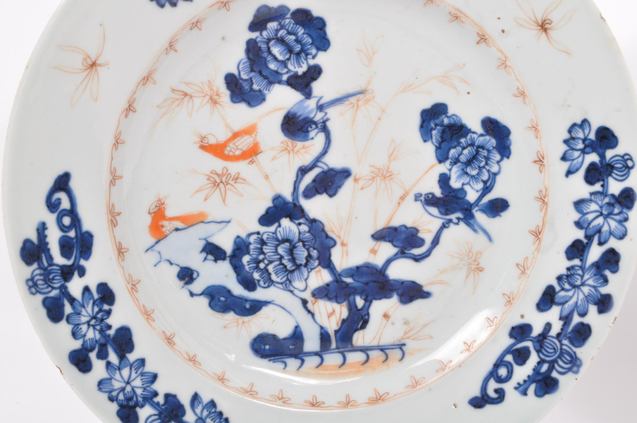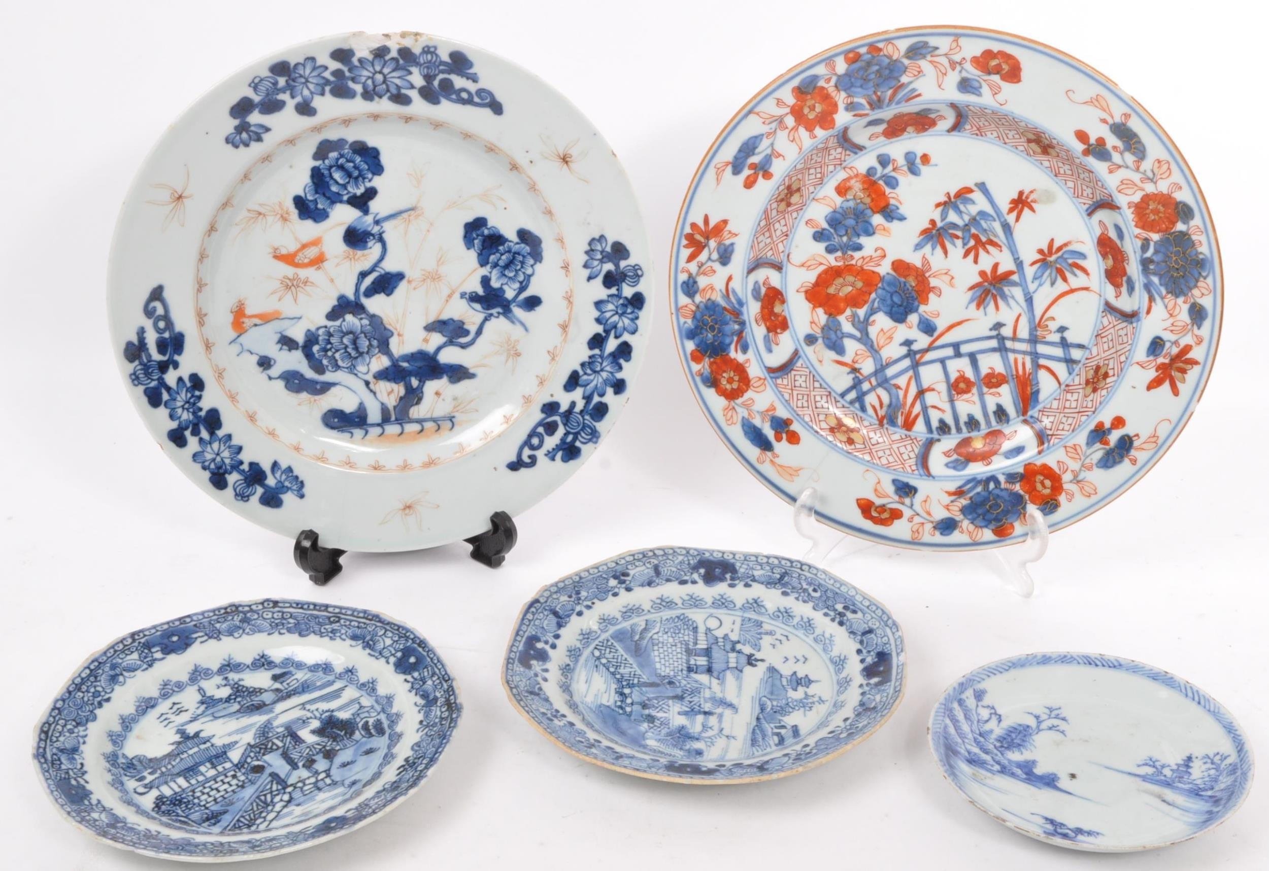 An assortment of five 18th / 19th century Chinese Oriental Qing Dynasty ceramic / porcelain plates. The lot to include two imari designs both depicting botanical subjects. Together with three of 19th century blue & white Chinese plates with foliate decorations and central bamboo depictions. Largest measures 23cm (diameter).