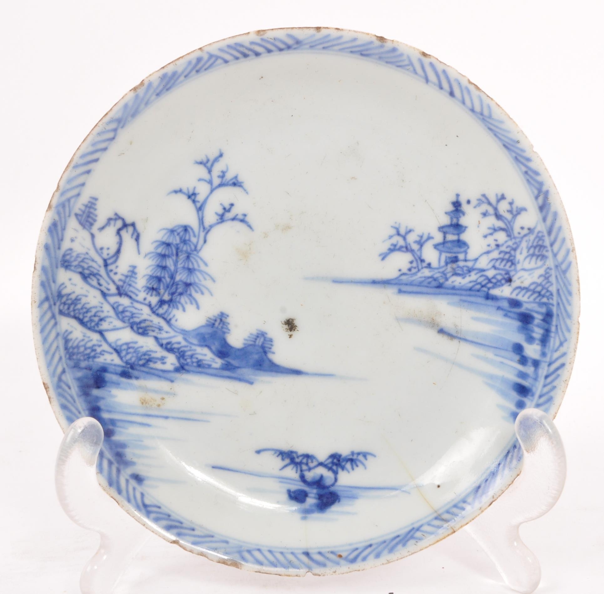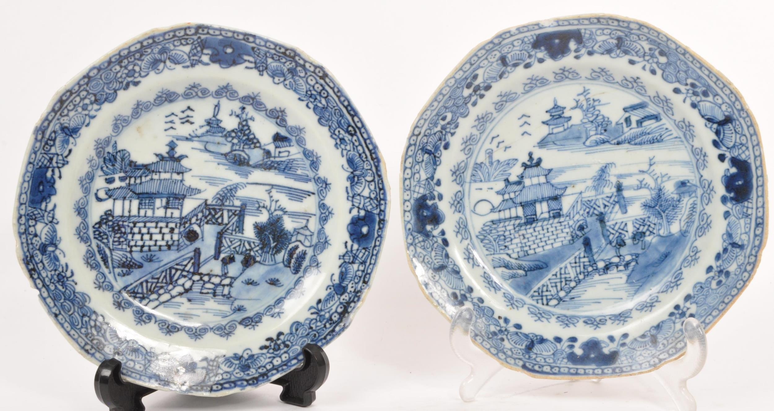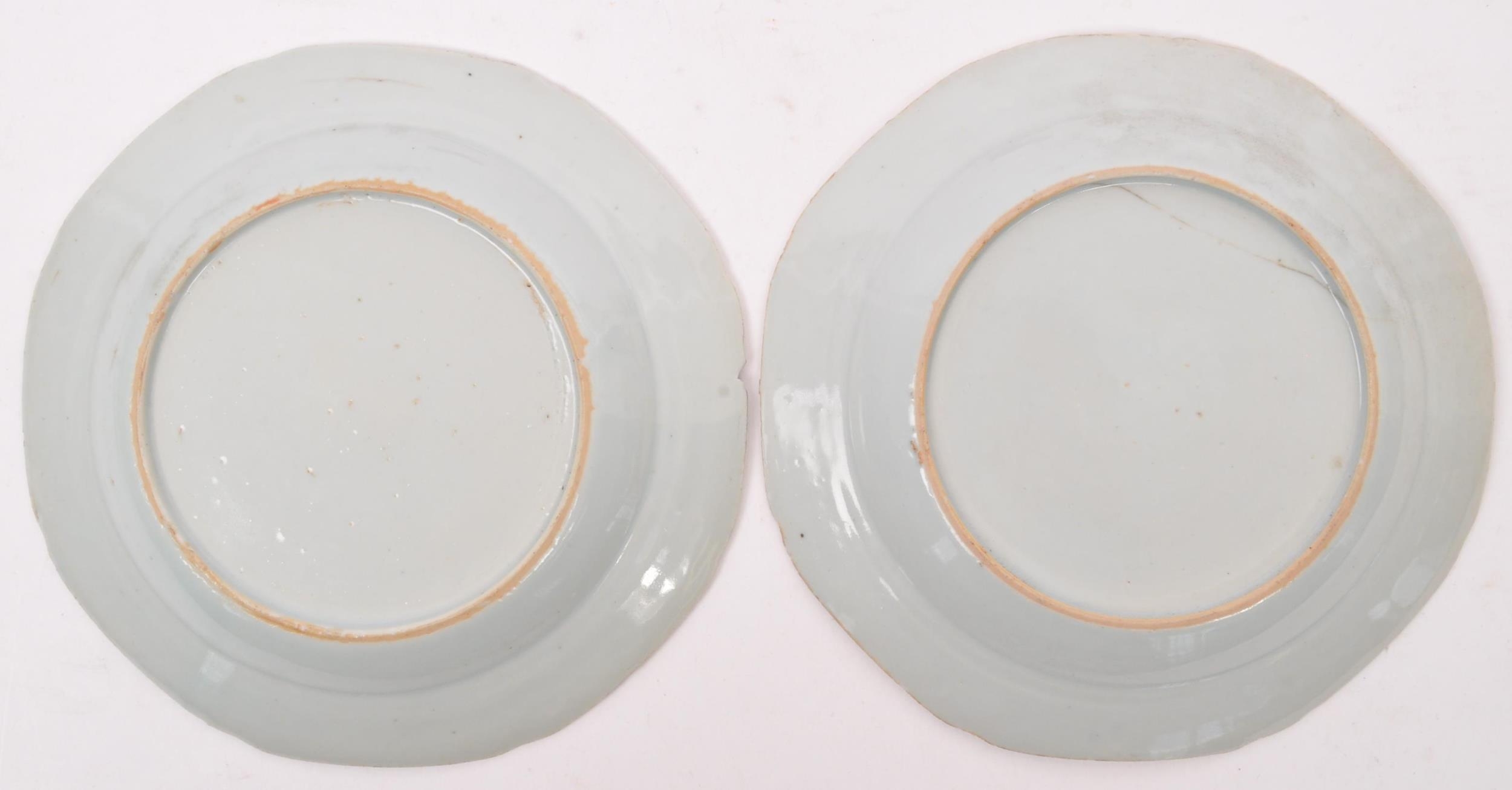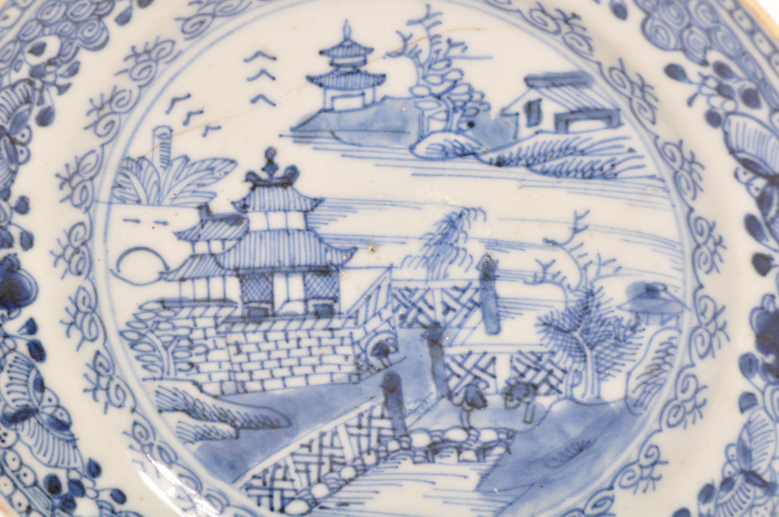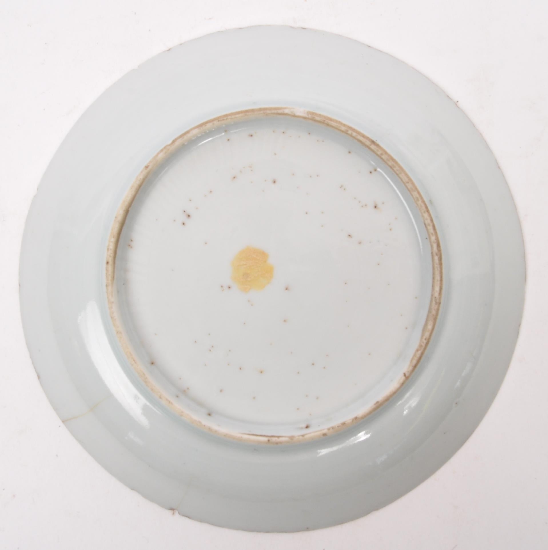 An assortment of five 18th / 19th century Chinese Oriental Qing Dynasty ceramic / porcelain plates. The lot to include two imari designs both depicting botanical subjects. Together with three of 19th century blue & white Chinese plates with foliate decorations and central bamboo depictions. Largest measures 23cm (diameter).