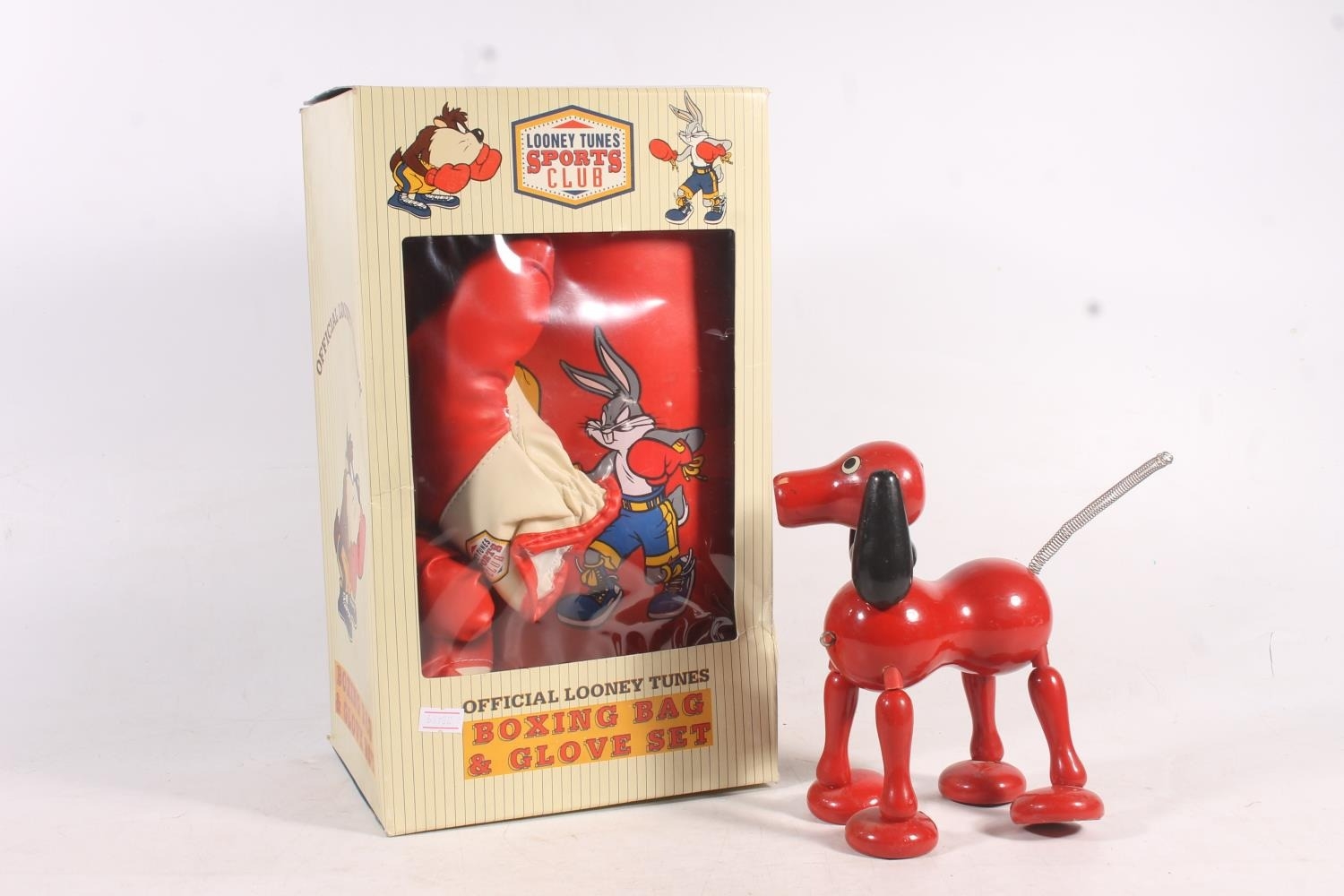 Vintage dog toy, a Looney Tunes boxing bag and glove set.