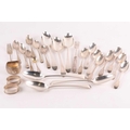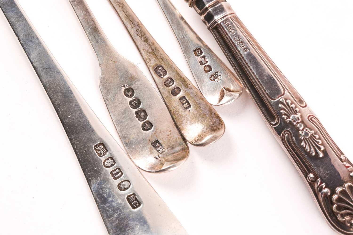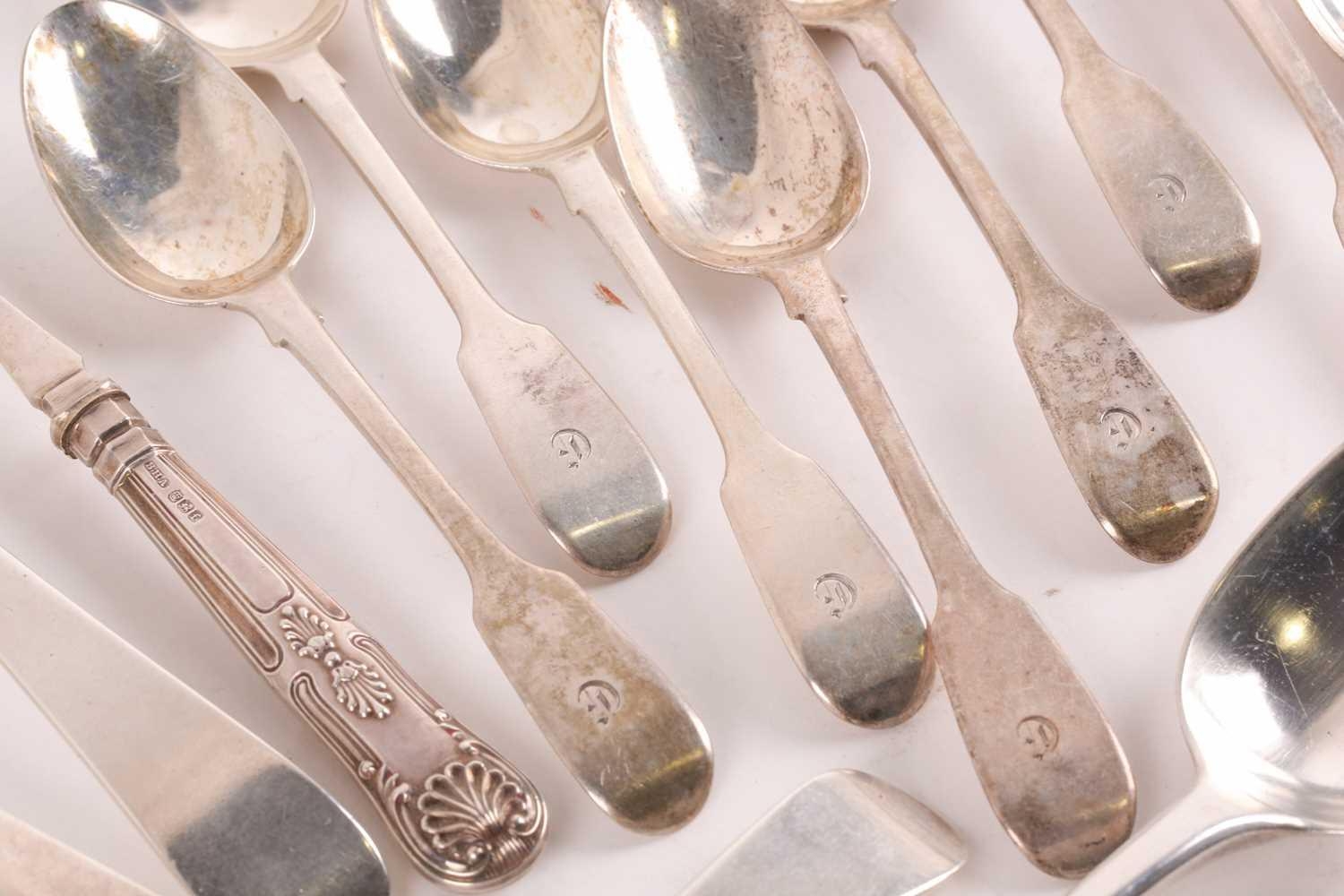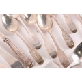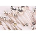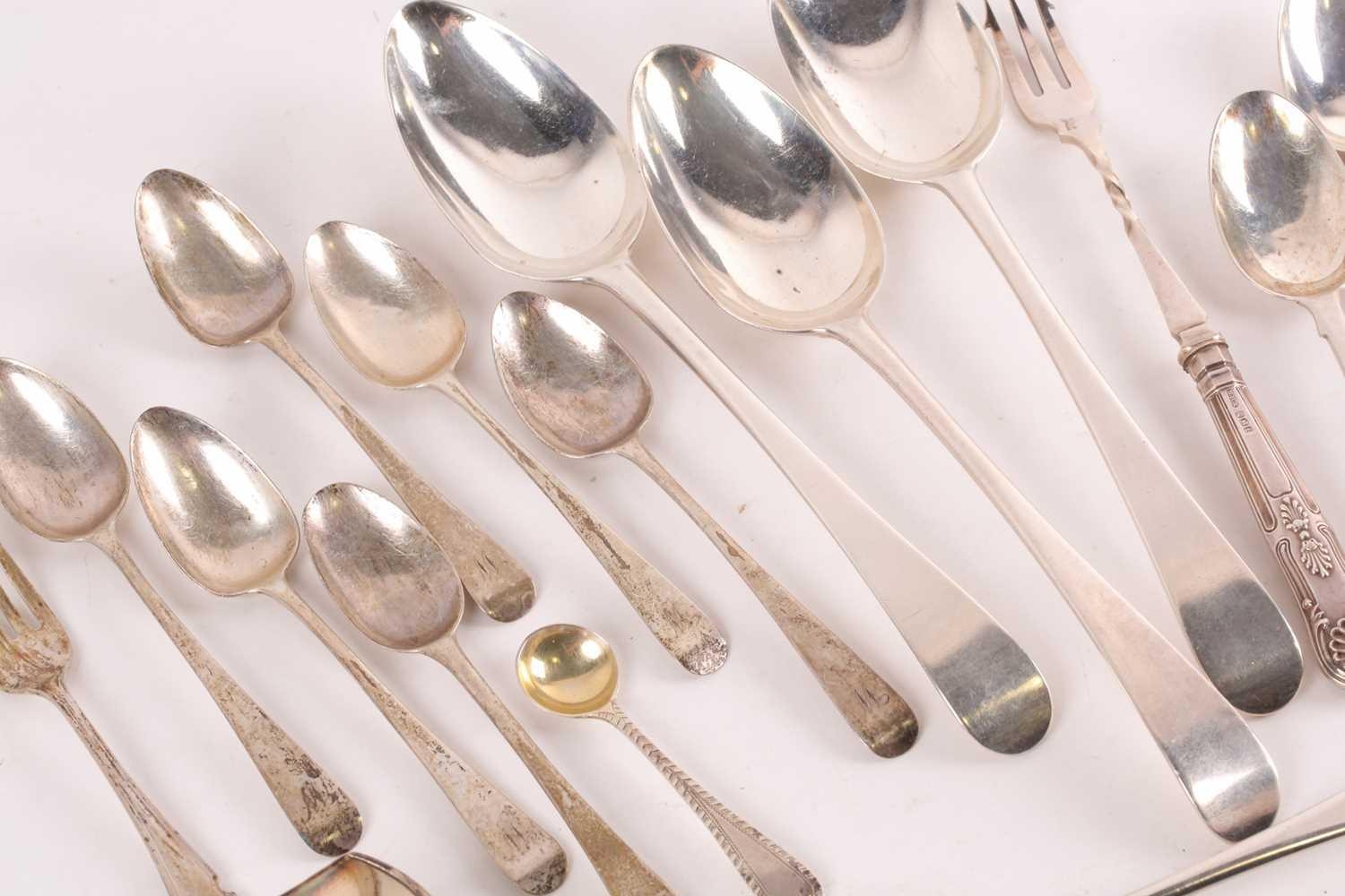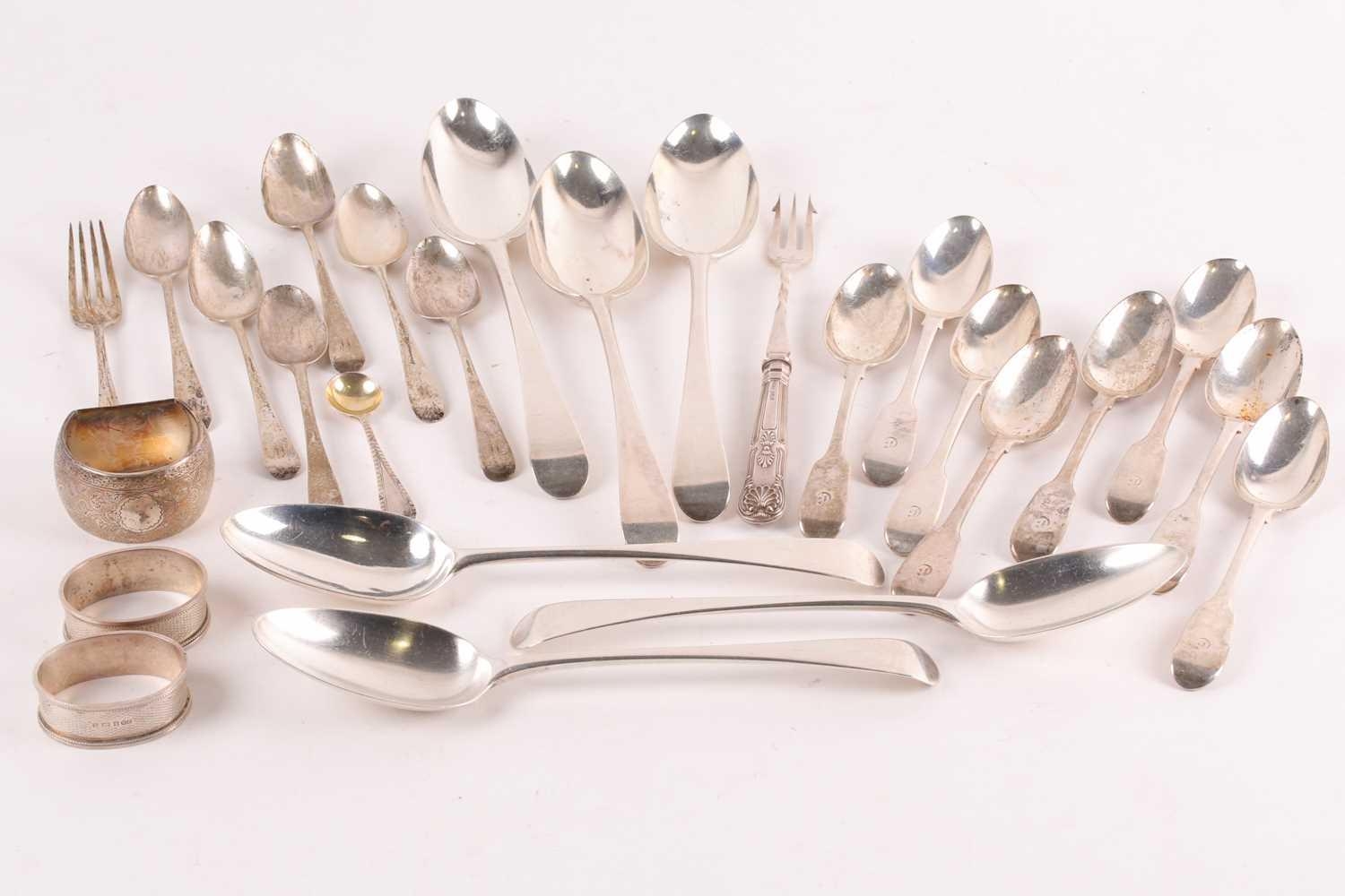 A set of four 18th century silver "Old English" pattern tablespoons London 1762 makers marks rubbed and two matching but later spoons. Together with other small items of silver flatware and items including napkin rings. 23 ozt gross weight.