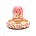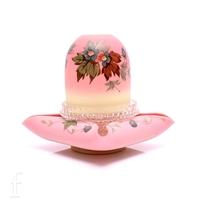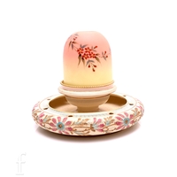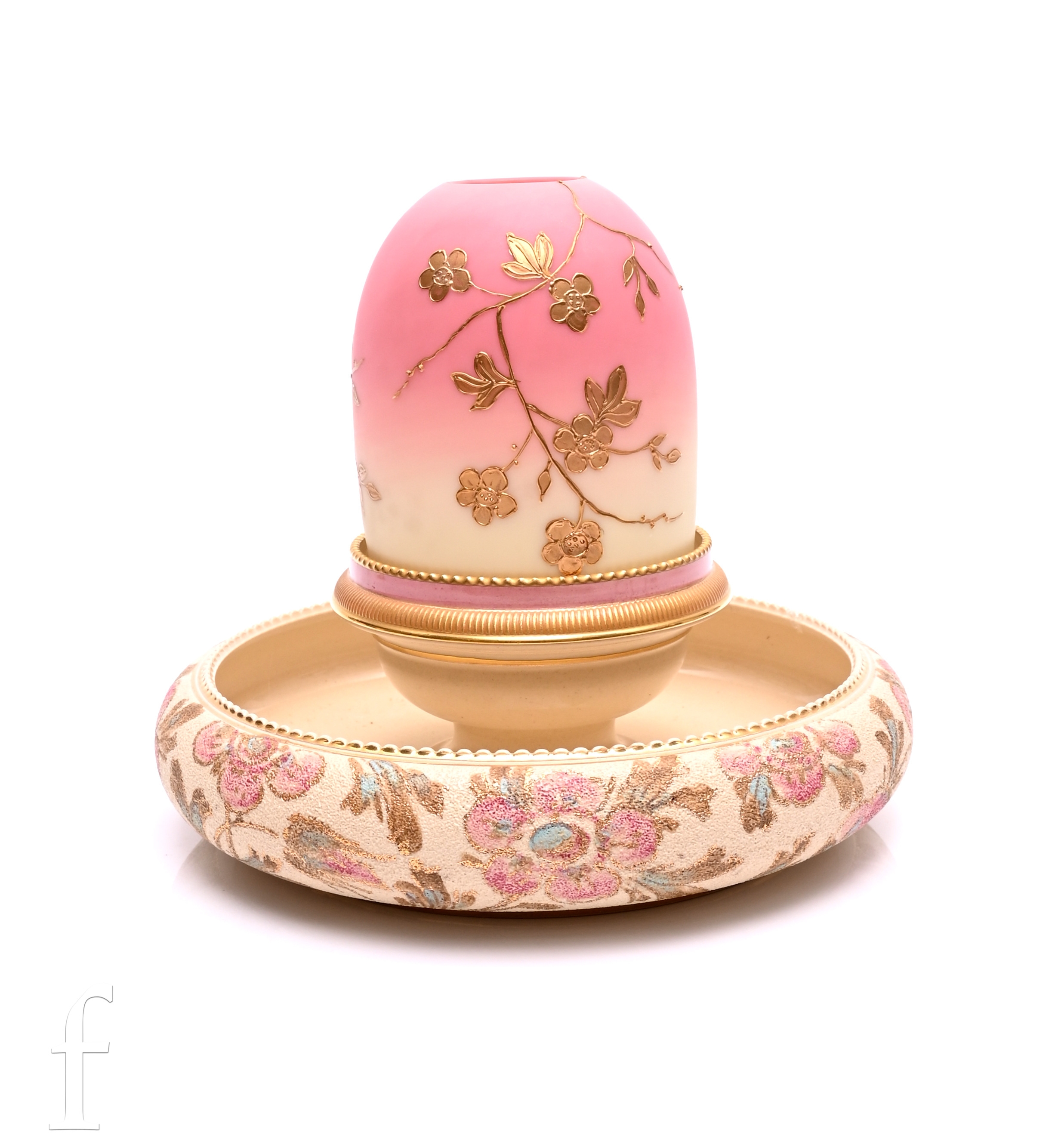 A late 19th Century Clarkes Patent Fairy nite light base by Taylor Tunnicliffe, the compressed circular base with a posy bowl decorated with stylised flowers and foliage in enamel with gilded highlights, to the centre a trademarked pedestal cup with a Thomas Webb & Sons Queens Burmese dome relief paste gilded in the manner of Jules Barbe with a flowering bough, height 17cm.