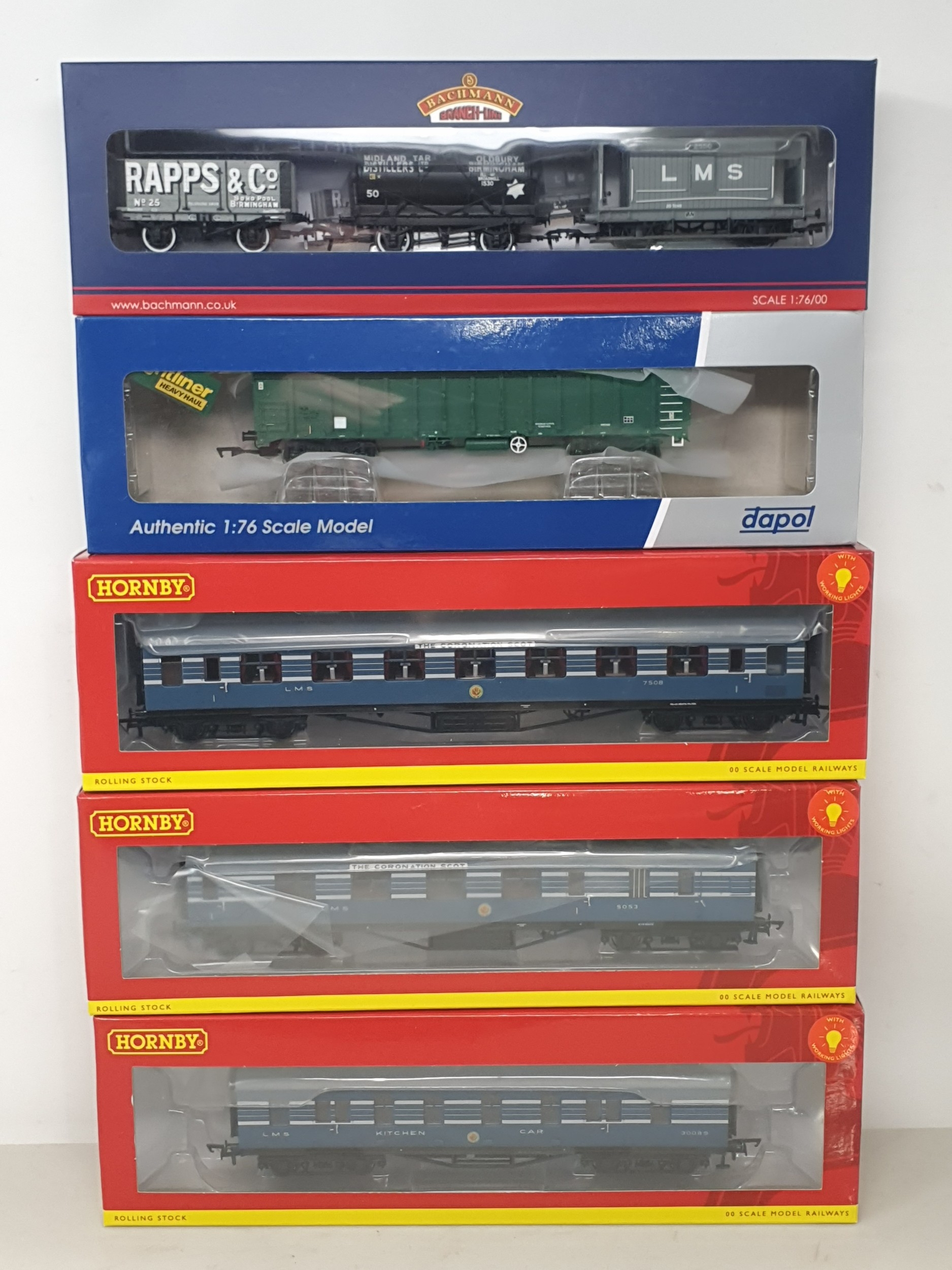 Three boxed Hornby 00 gauge LMS Coronation Scot Stanier Coaches comprising R40052, R40055 and R40054A; together with a boxed Dapol 4F-025-004 Freightliner Bogie Box Van and a Bachmann 38-990Z Warley National Model Railway Exhibition 2017 50th Anniversary Wagon Set, all M, boxes Nr perfect