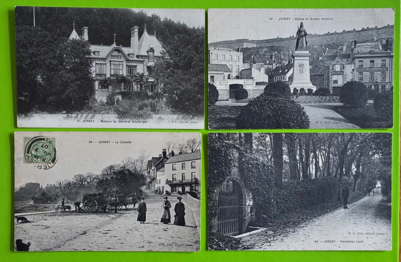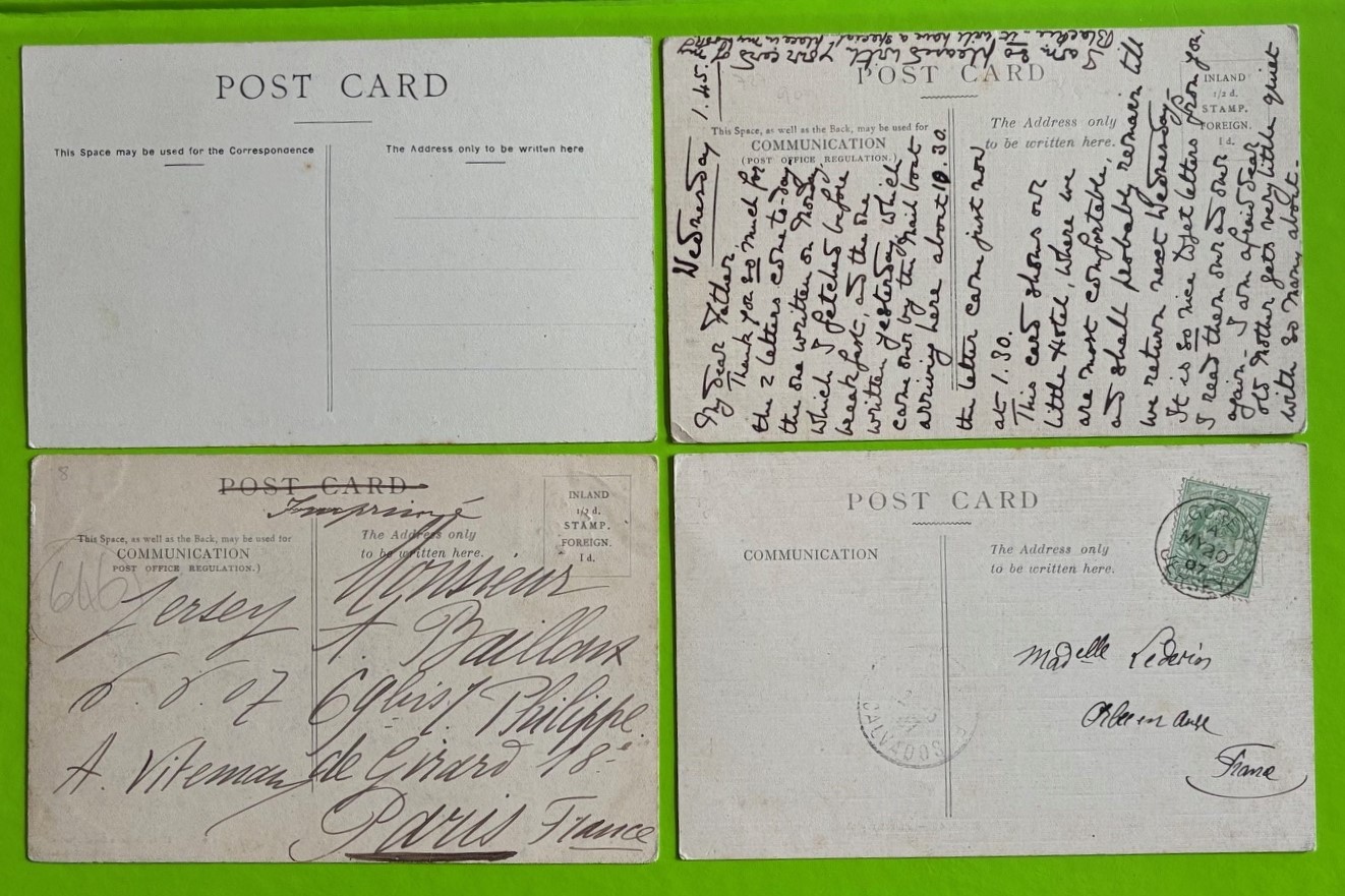 Four printed black and white Allix postcards of Jersey, one with Gorey sub post office p/m numbers 31, 32, 38 & 40 (4).