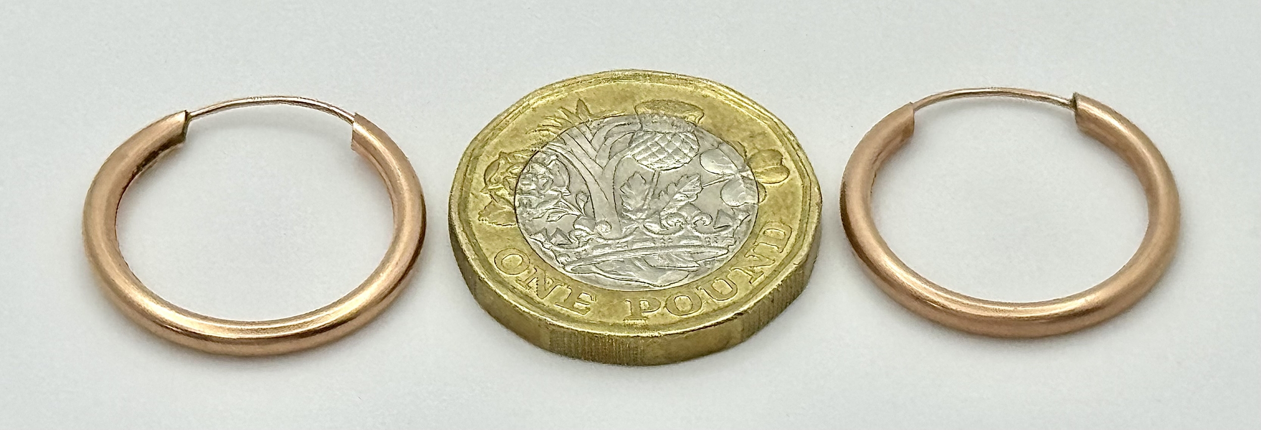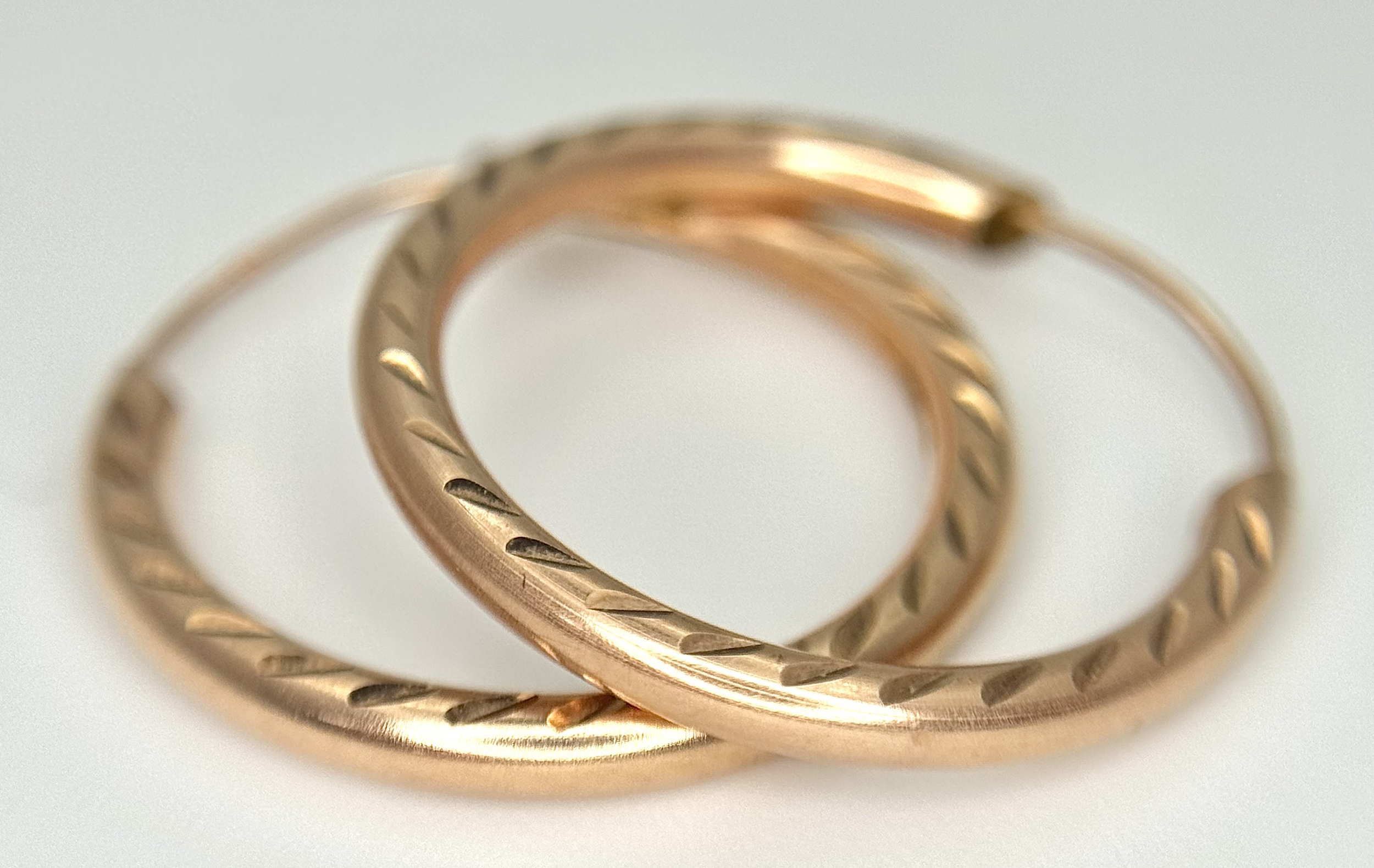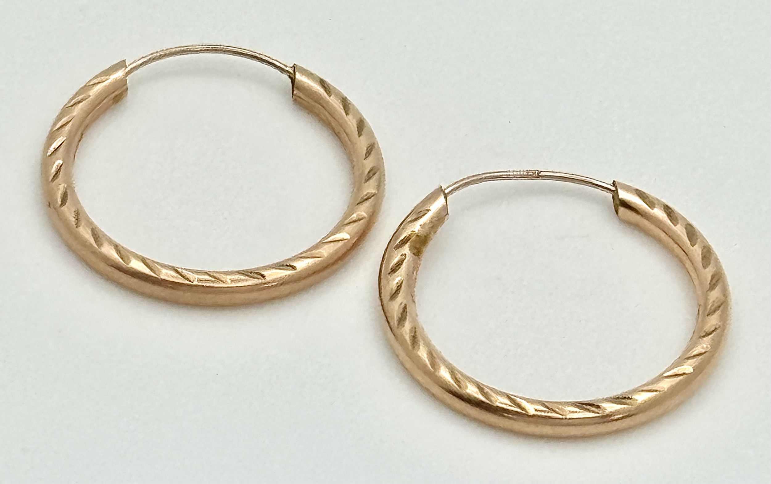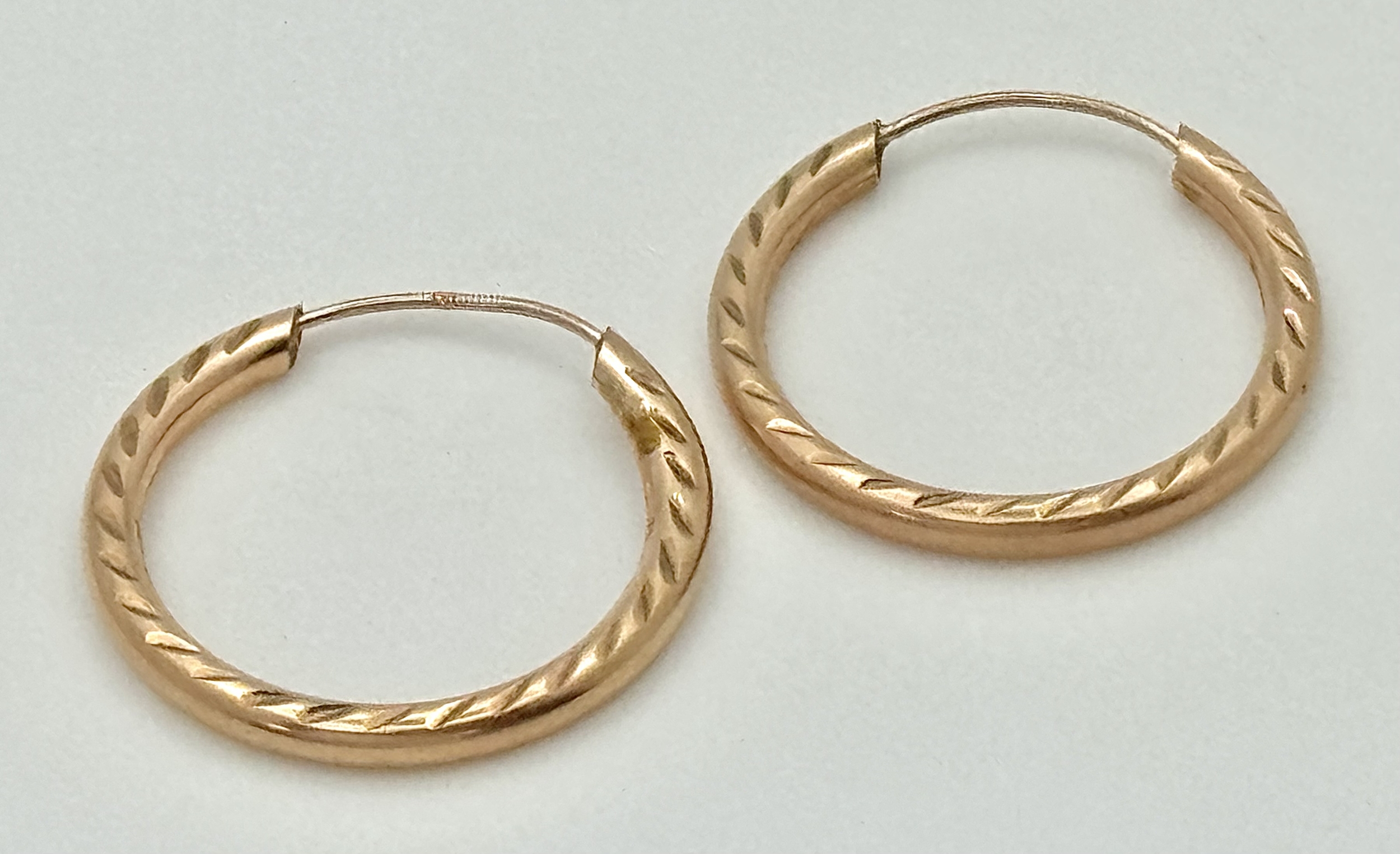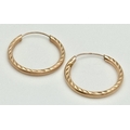 Classic Pair of 9 CARAT ‘ROSE GOLD’ HOOP EARRINGS. Patterned Side Detail. 0.8 Grams. 2 cm Diameter.