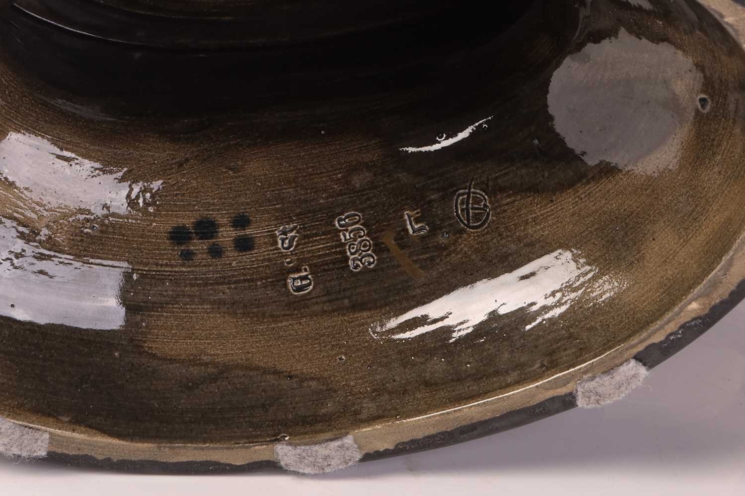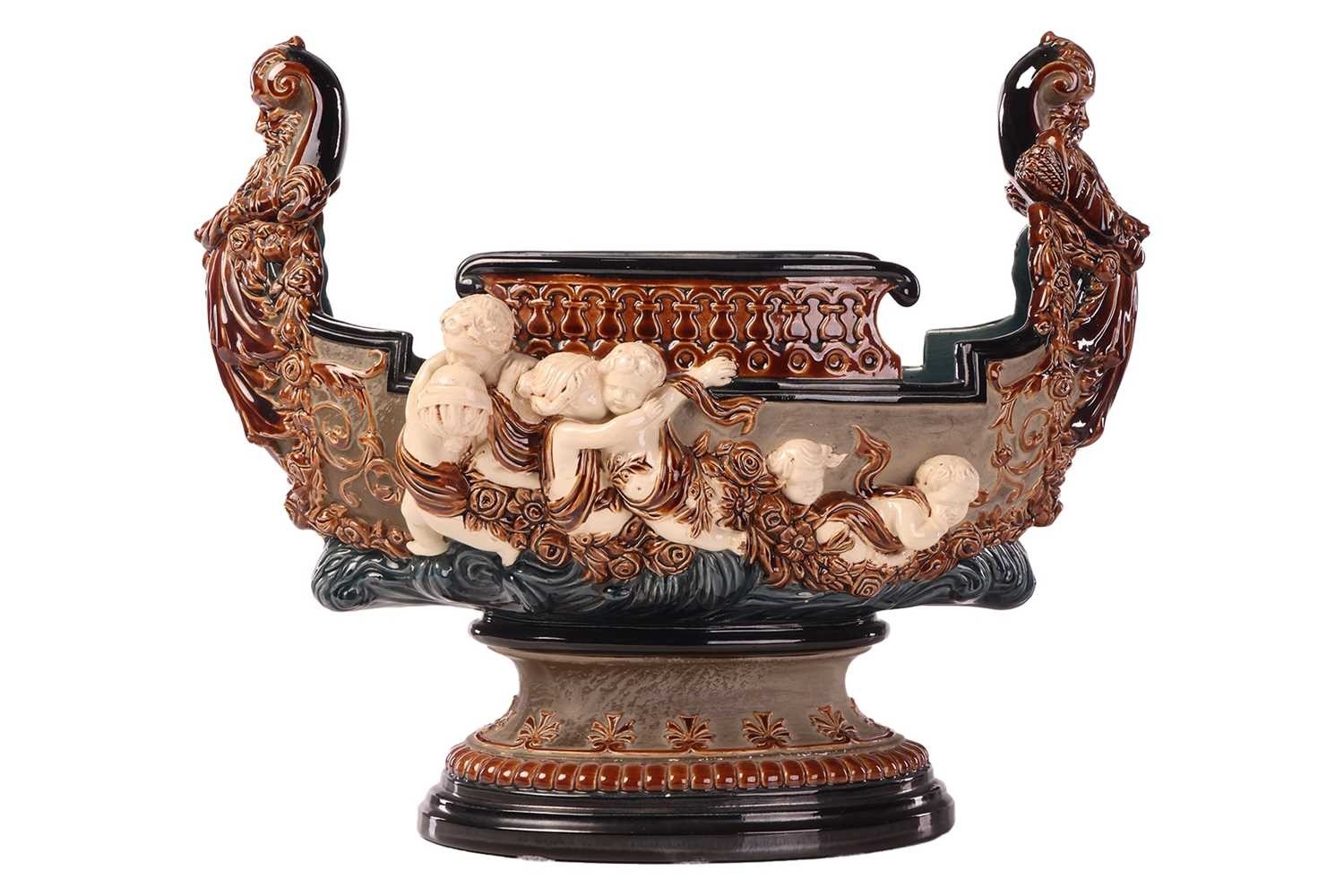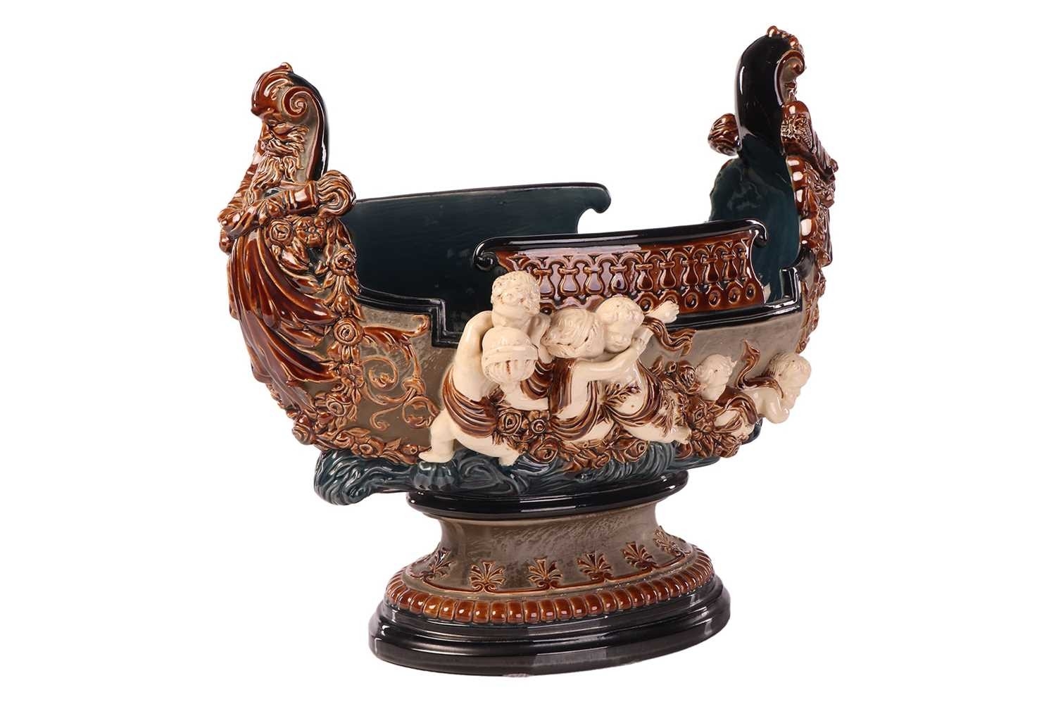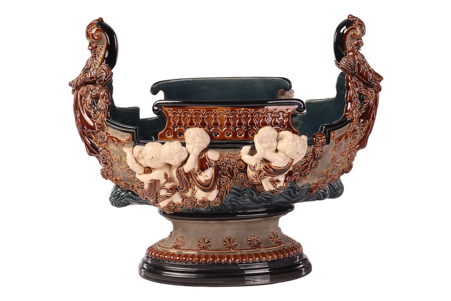 A large Gerbing & Stephan majolica jardinière, late 19th century, modelled as a Viking longship on a pedestal, numbered 3856, 31 cm high x 36 cm wide.