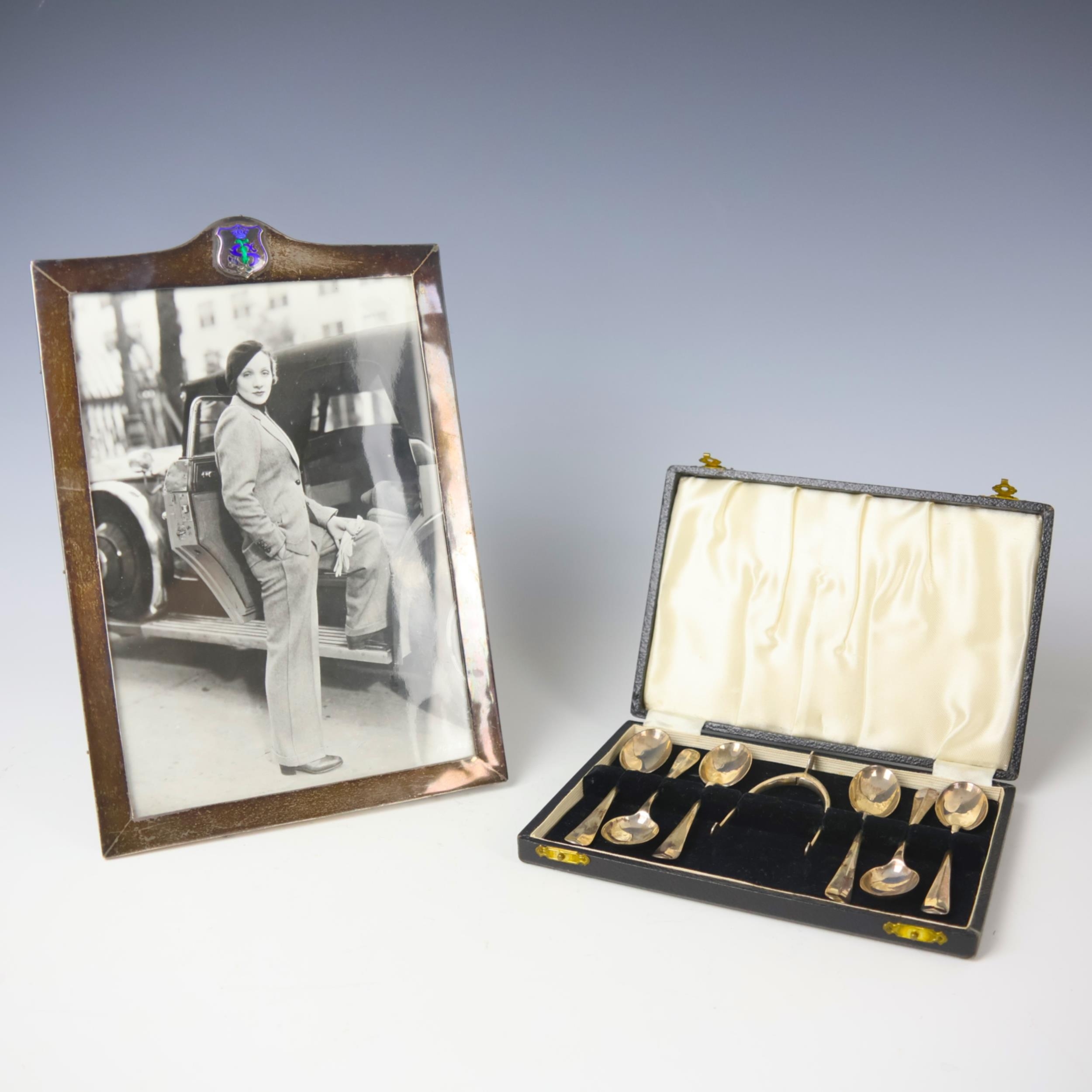 A cased set of George VI silver Hanoverian pattern teaspoons, James Swann & Son, Birmingham 1940, the six teaspoons of typical form with wishbone shaped sugar tongs, 10cm long, 92gms, with an early 20th century silver plated photograph frame, with enamel detailing to top, 28.8cm high (2) (at fault)
