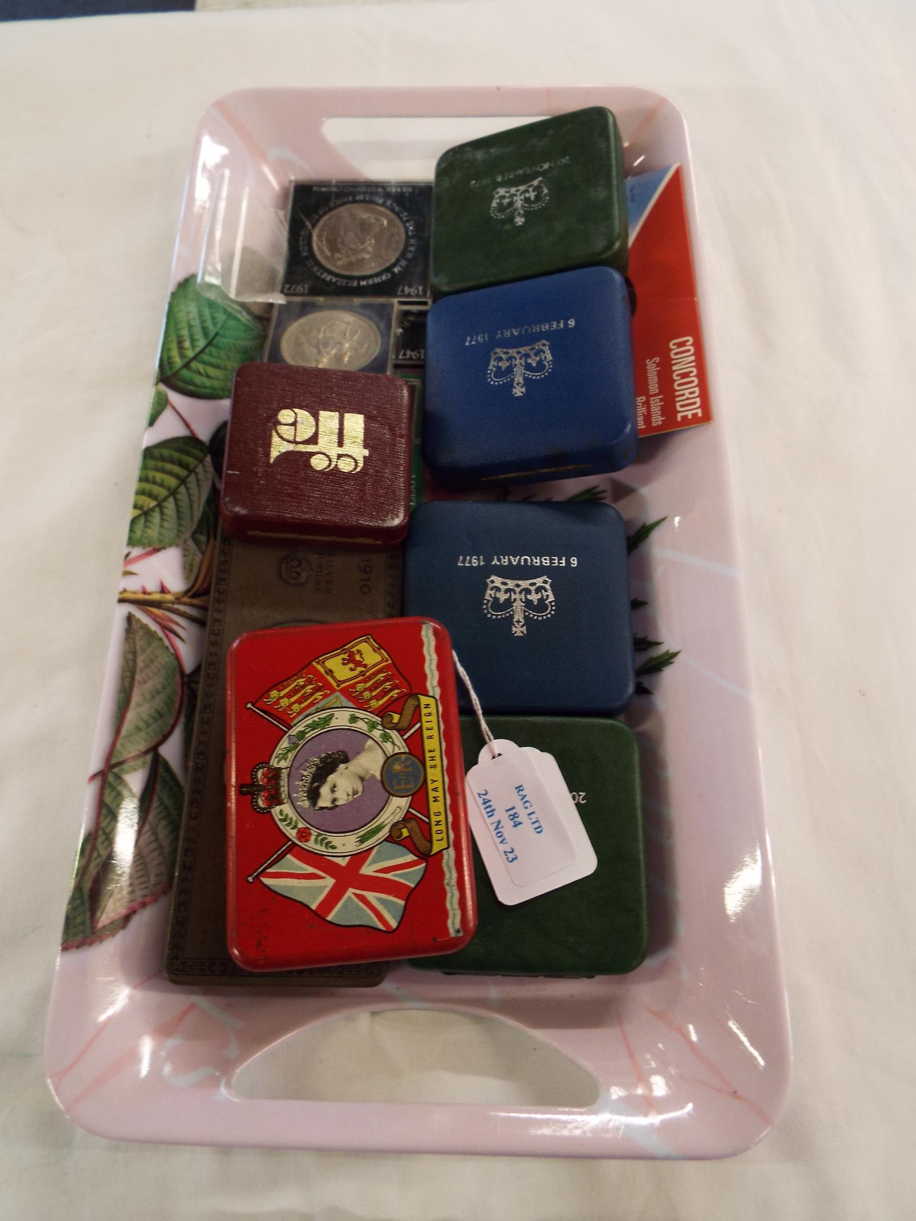 A mixed selection of coinage to include Royal Mint Silver Wedding Crown, Elizabeth and Phillip Crown etc together with two commemorative tins