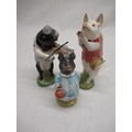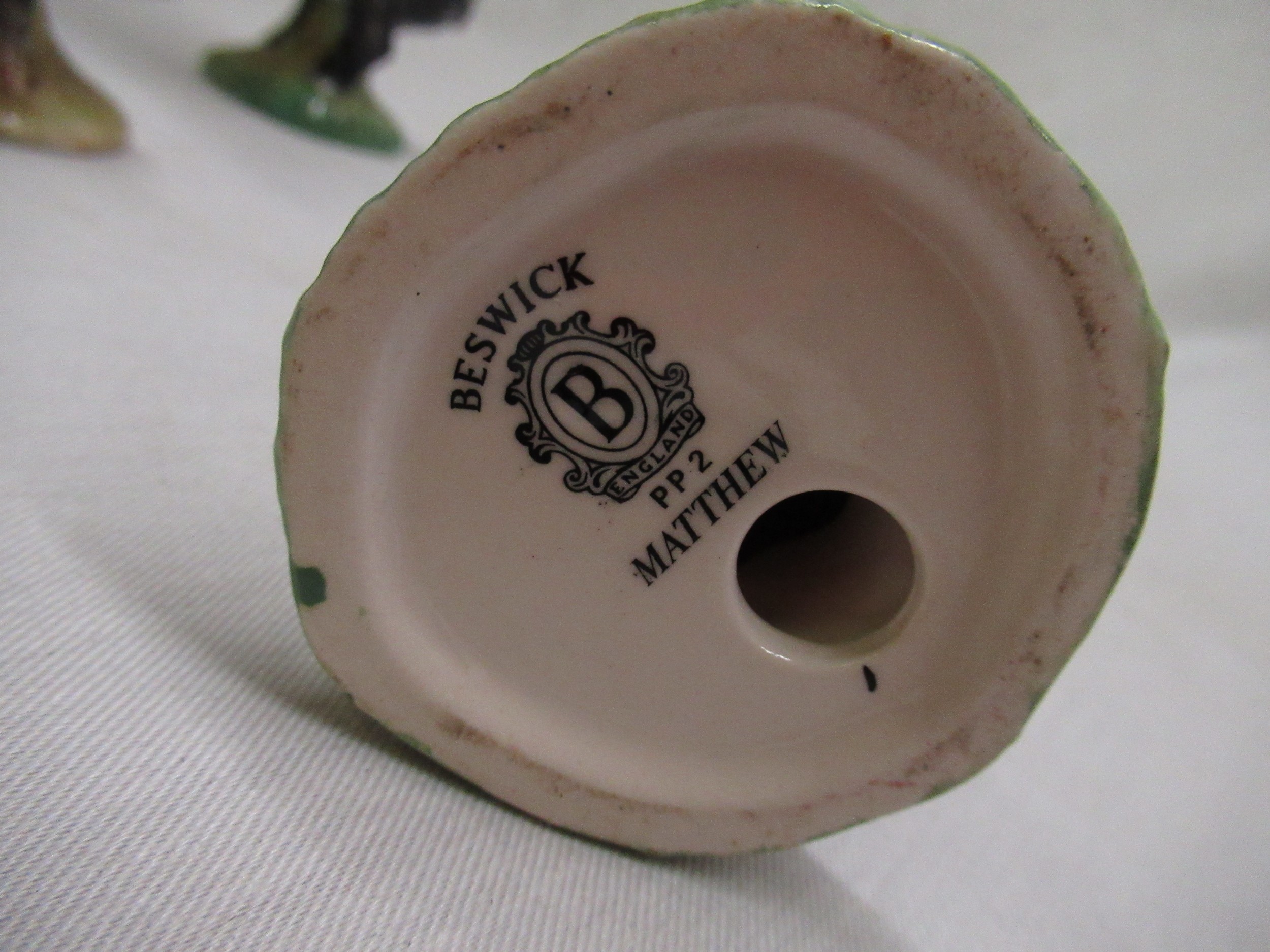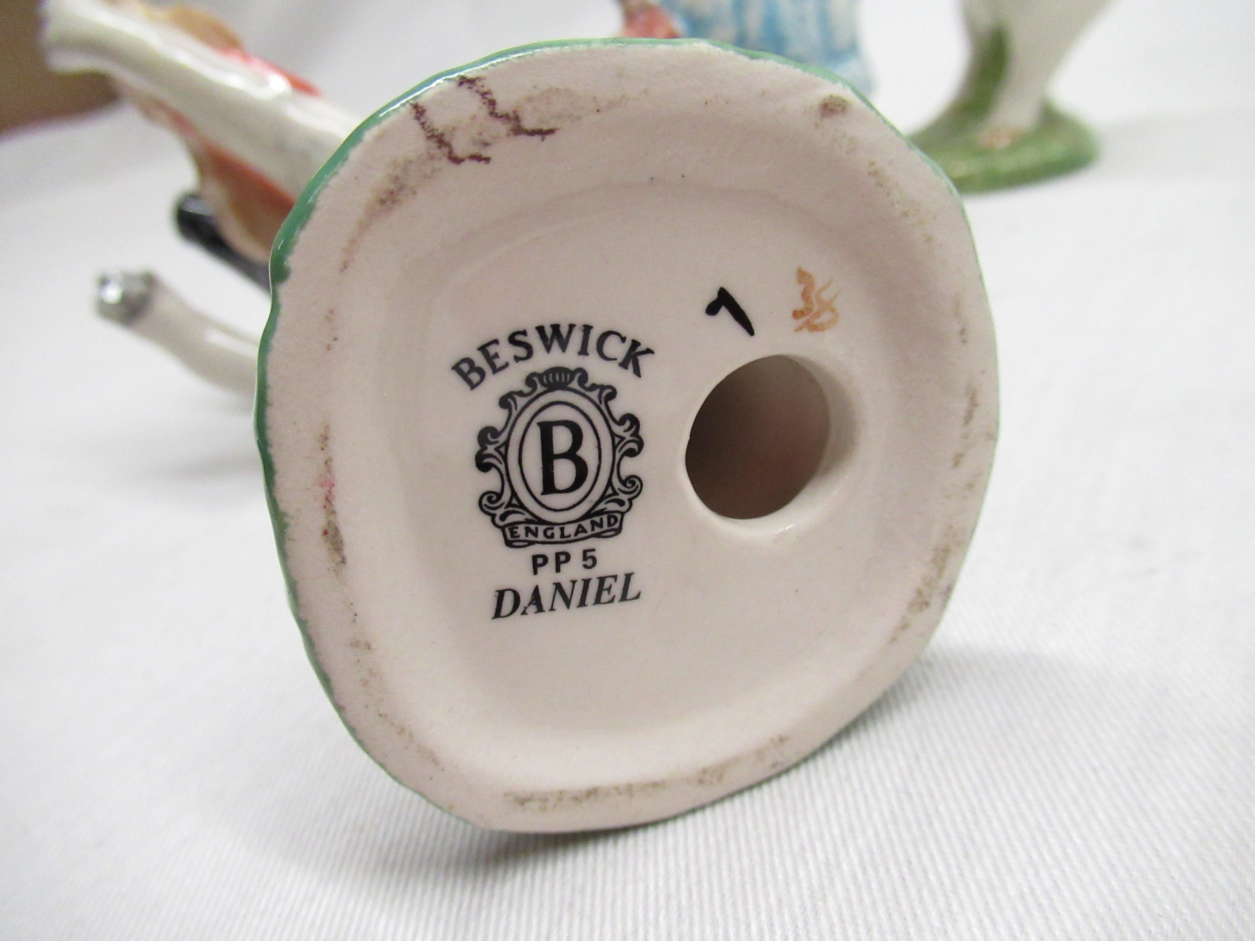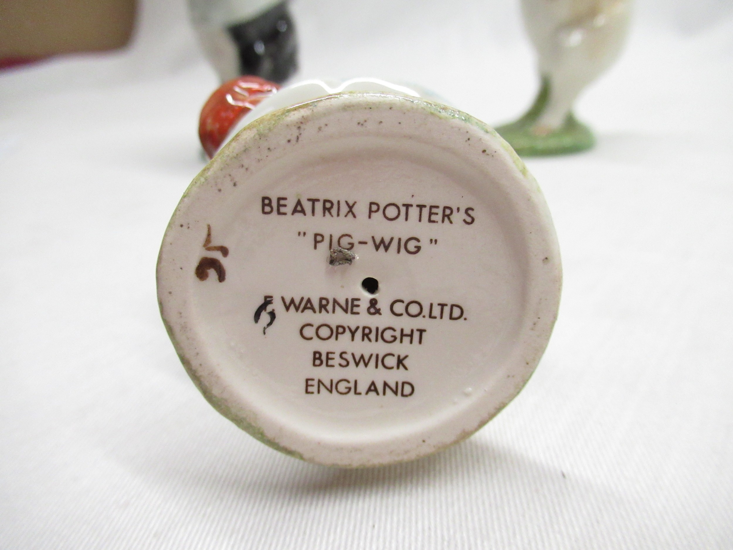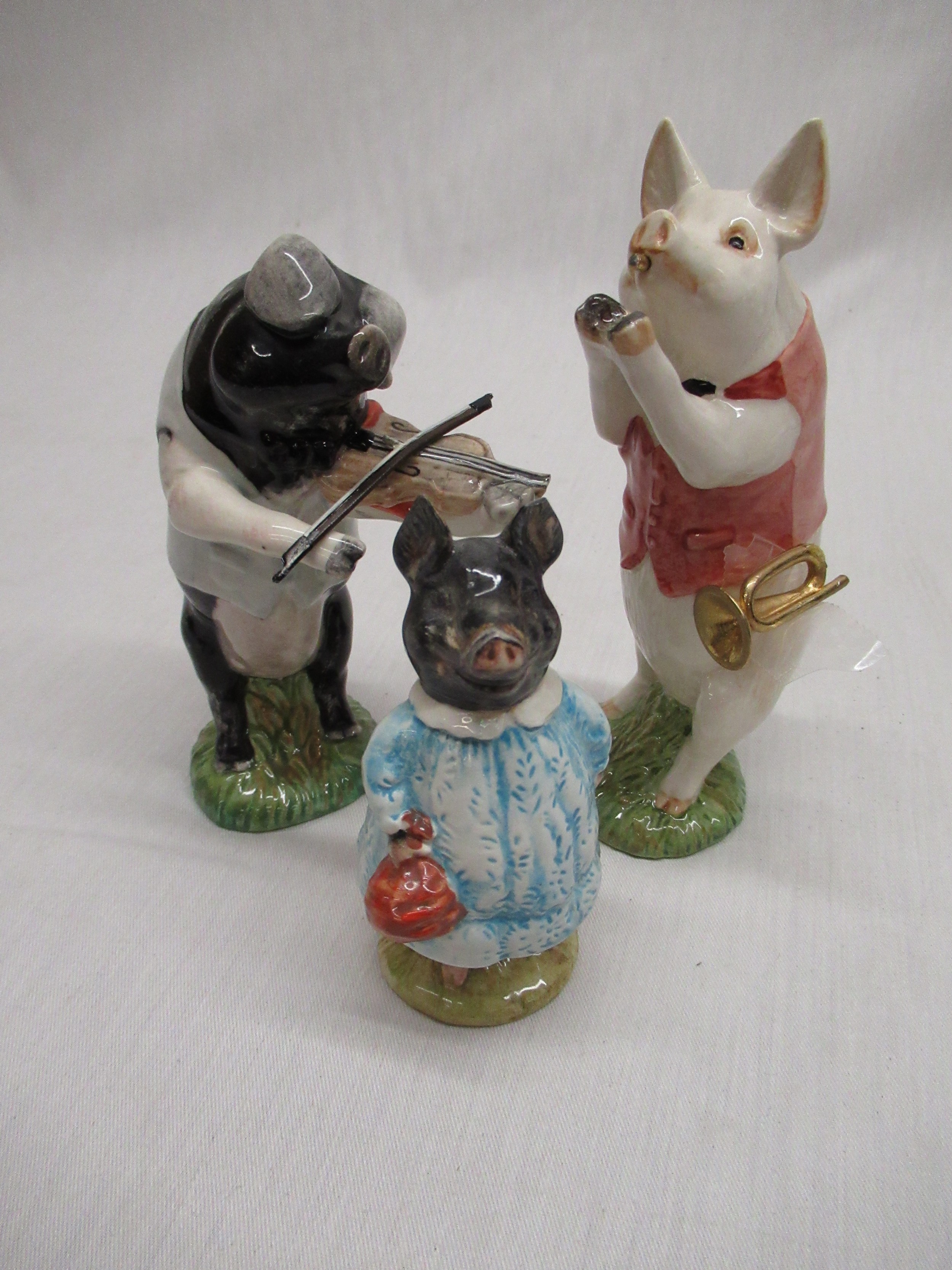 Three Beswick figures incl. Daniel the violin playing pig, Matthew the trumpet playing pig and Beatrix Potters pig wig. (3) (A/F)