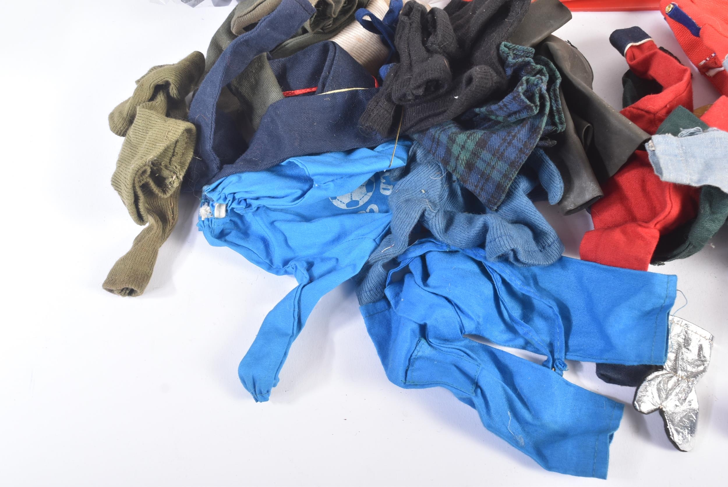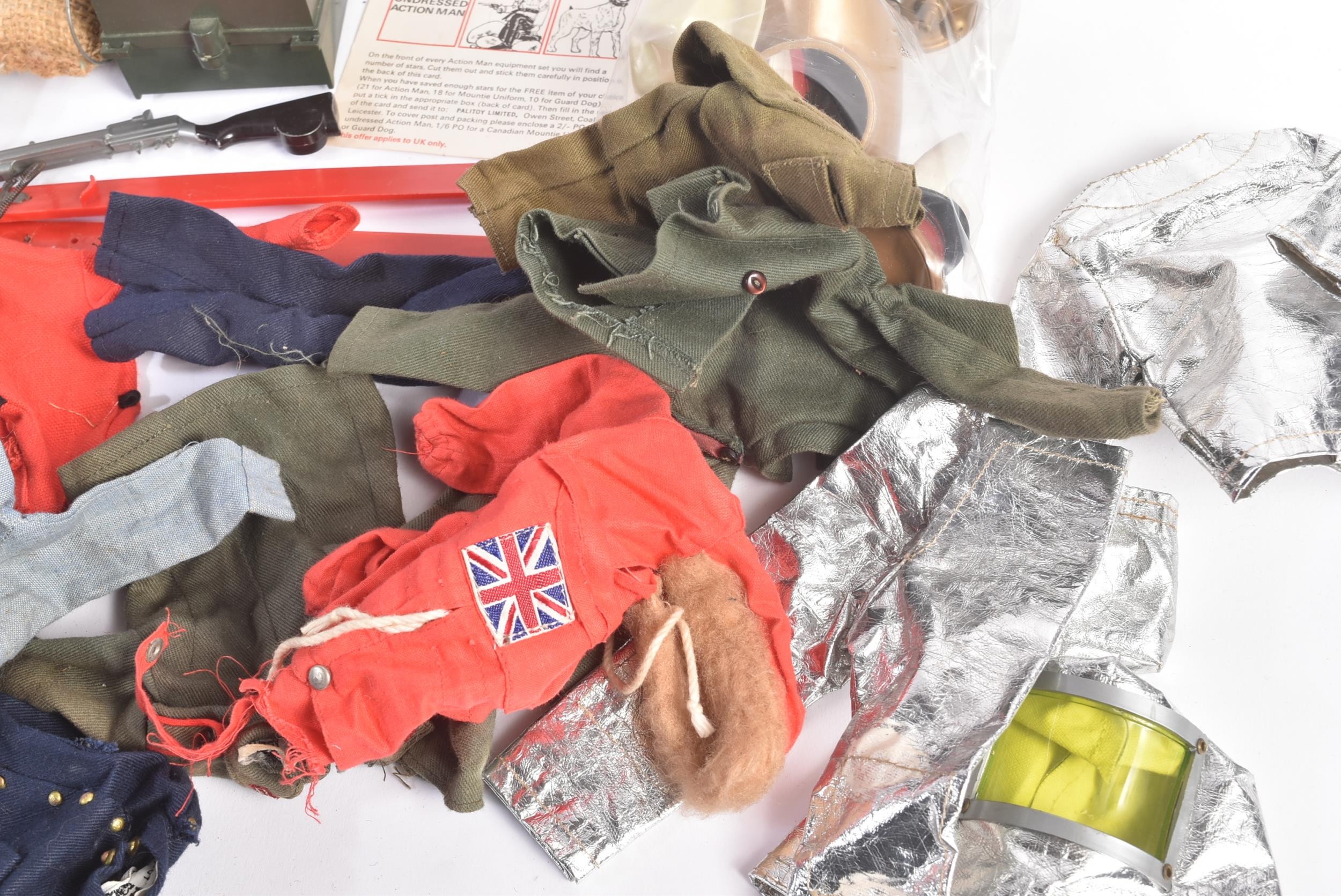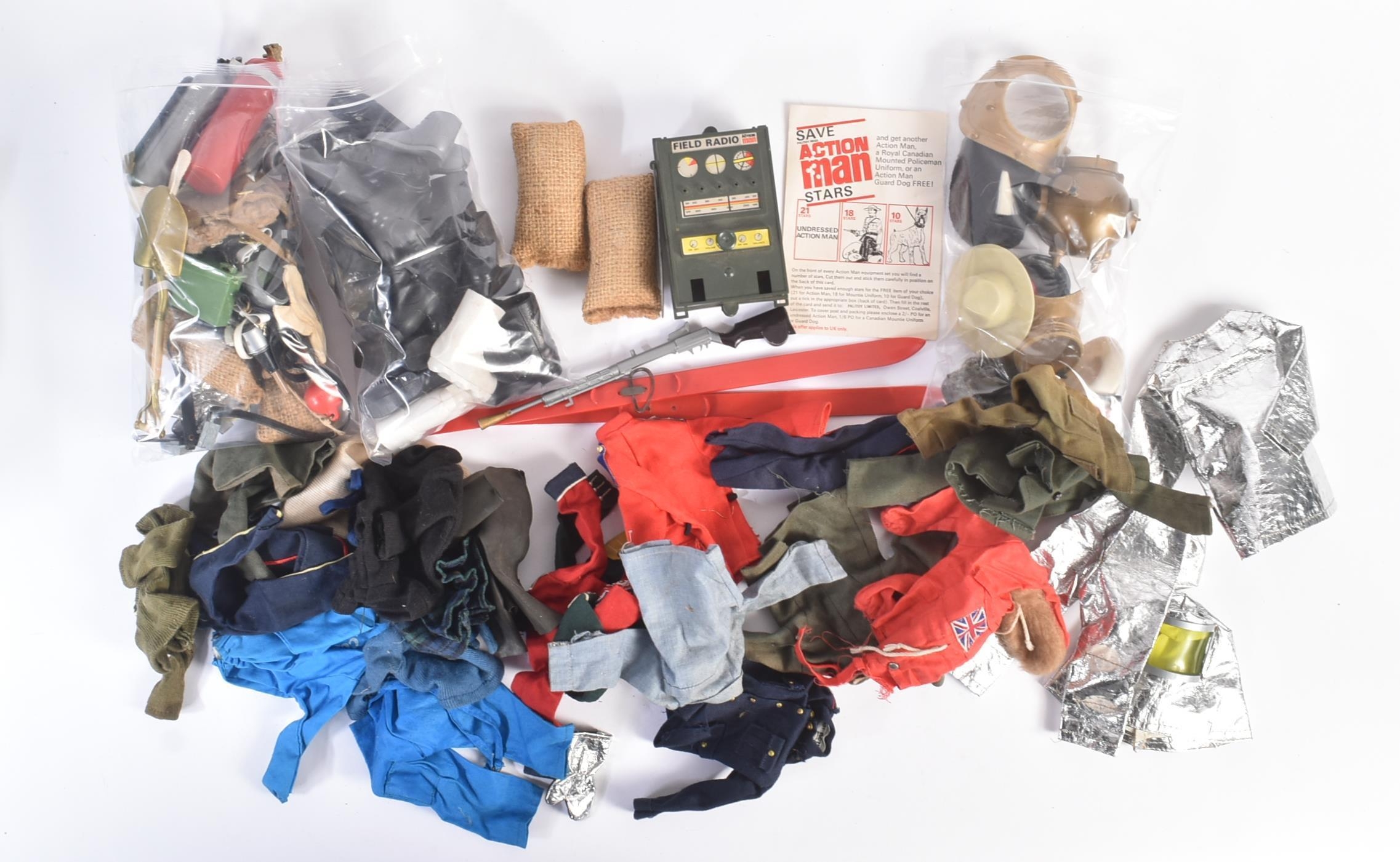 A large collection of vintage Palitoy Action Man clothing and accessories. Clothing appearing to include Canadian Mounted Police, Polar Explorer, Argyll & Sutherland Highlander, Crash Crew, German Officers, Footballers and others. Large selection of boots, hats, military weapons, diving equipment and more.