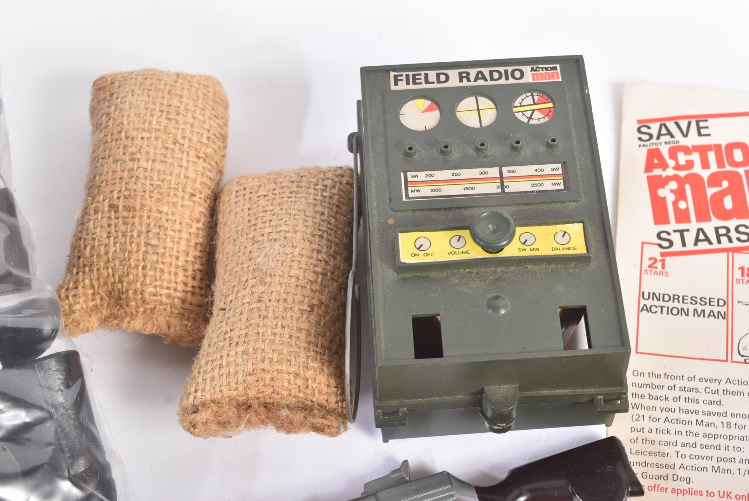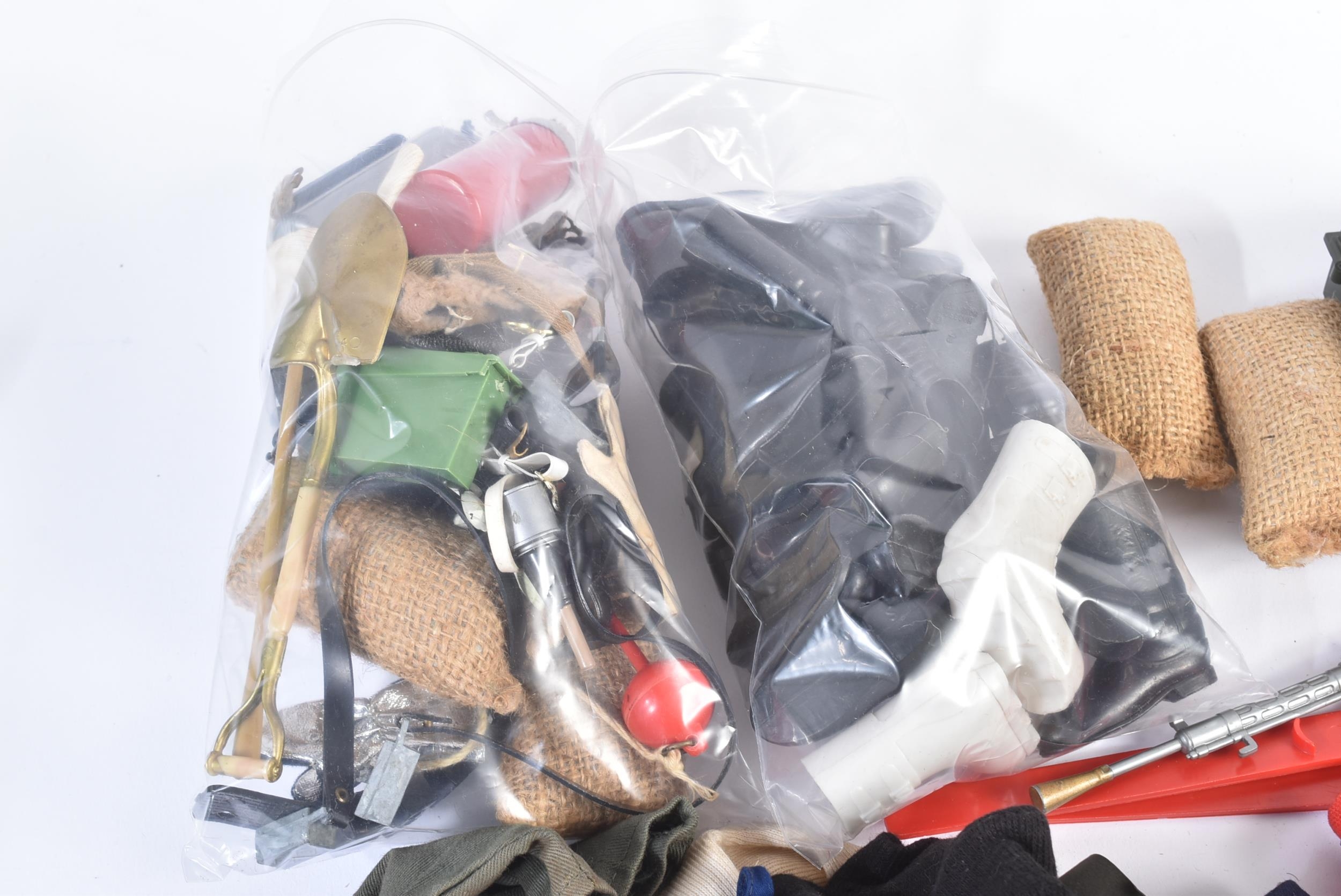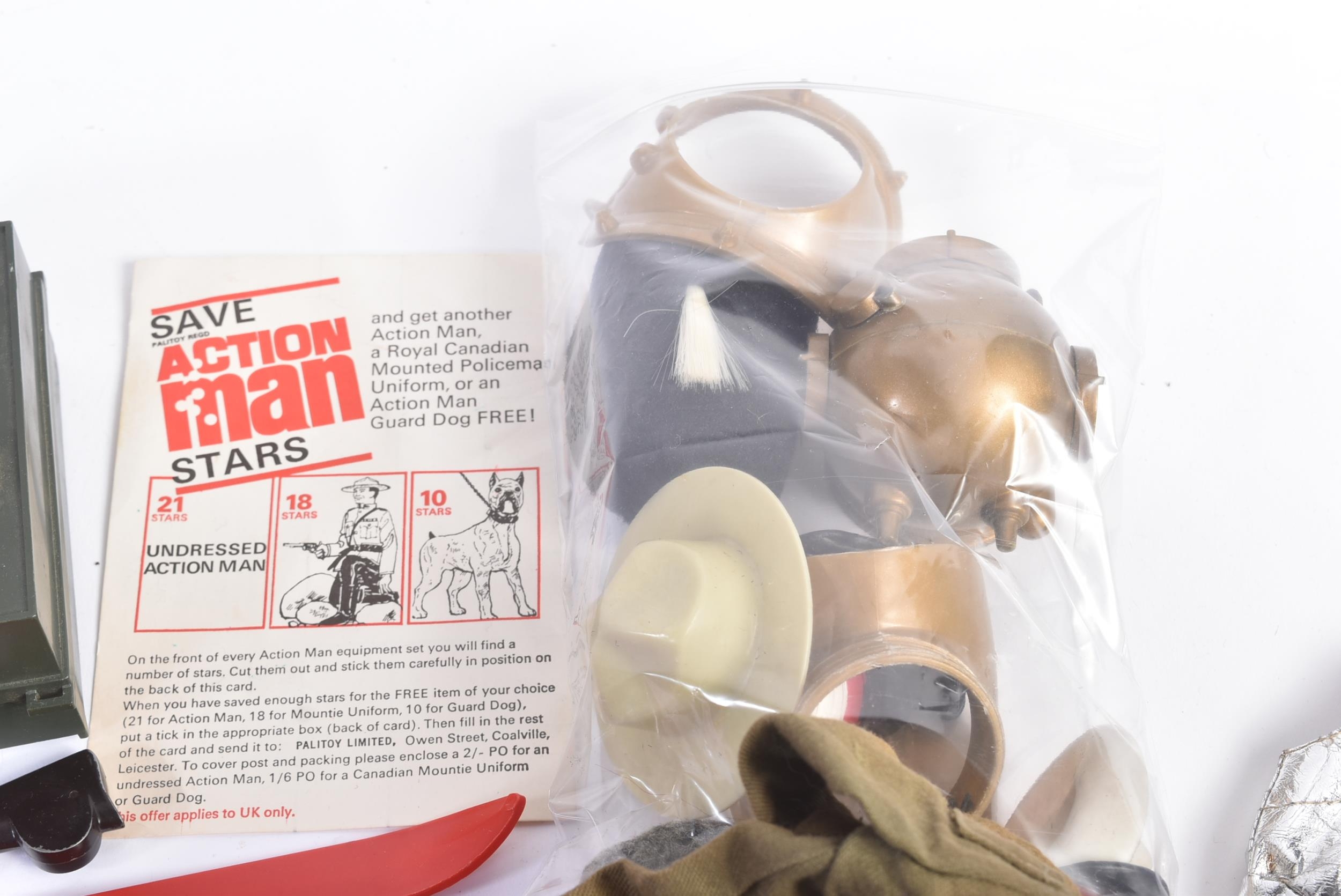 A large collection of vintage Palitoy Action Man clothing and accessories. Clothing appearing to include Canadian Mounted Police, Polar Explorer, Argyll & Sutherland Highlander, Crash Crew, German Officers, Footballers and others. Large selection of boots, hats, military weapons, diving equipment and more.