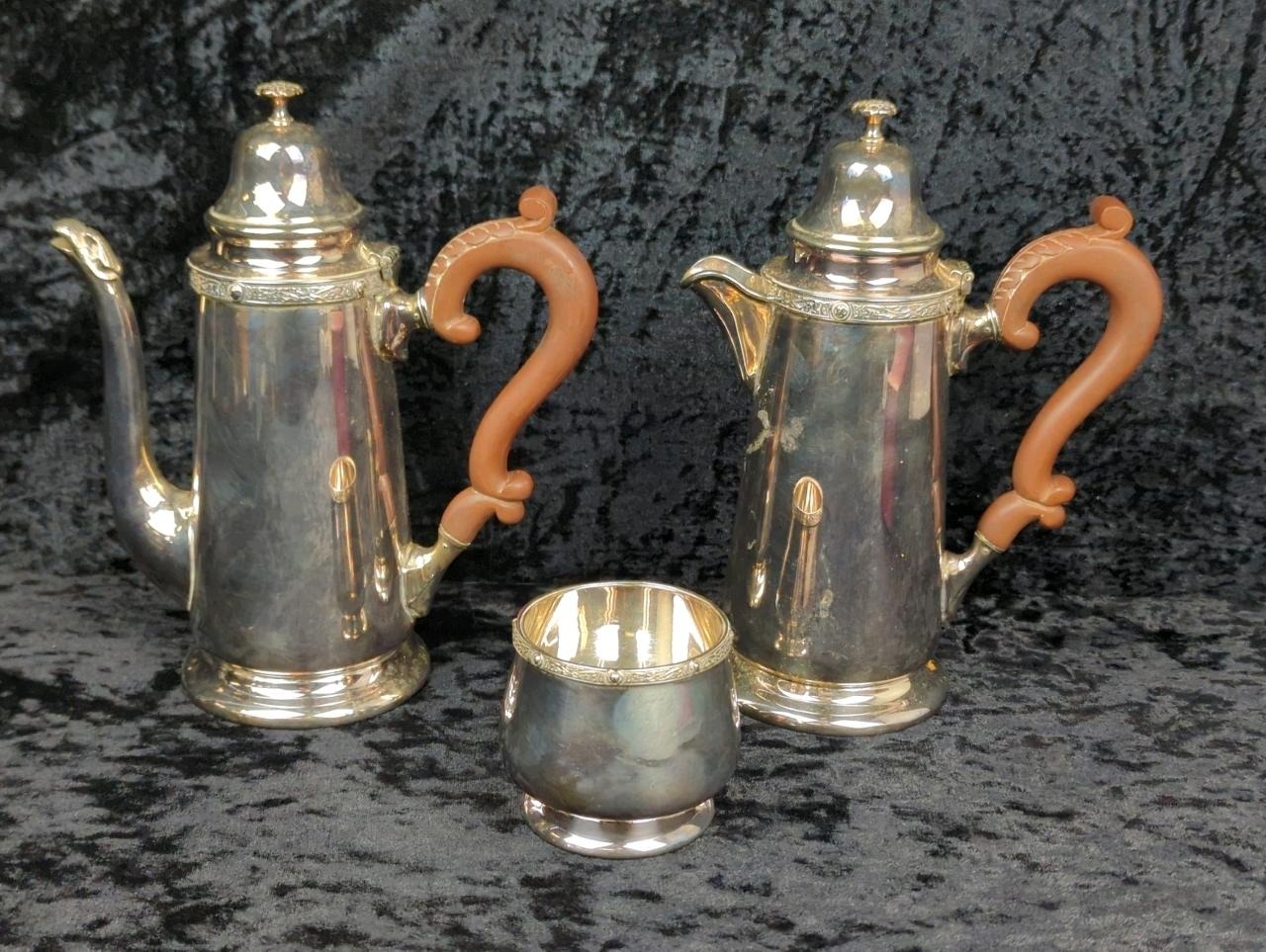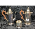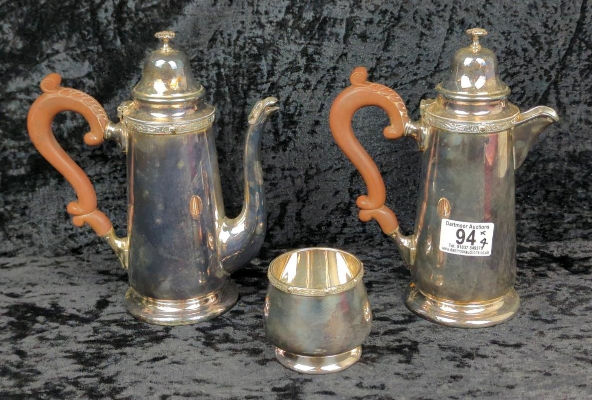 Two Georgian-style English silver plate coffee pots with wooden handles, and a sugar bowl.
