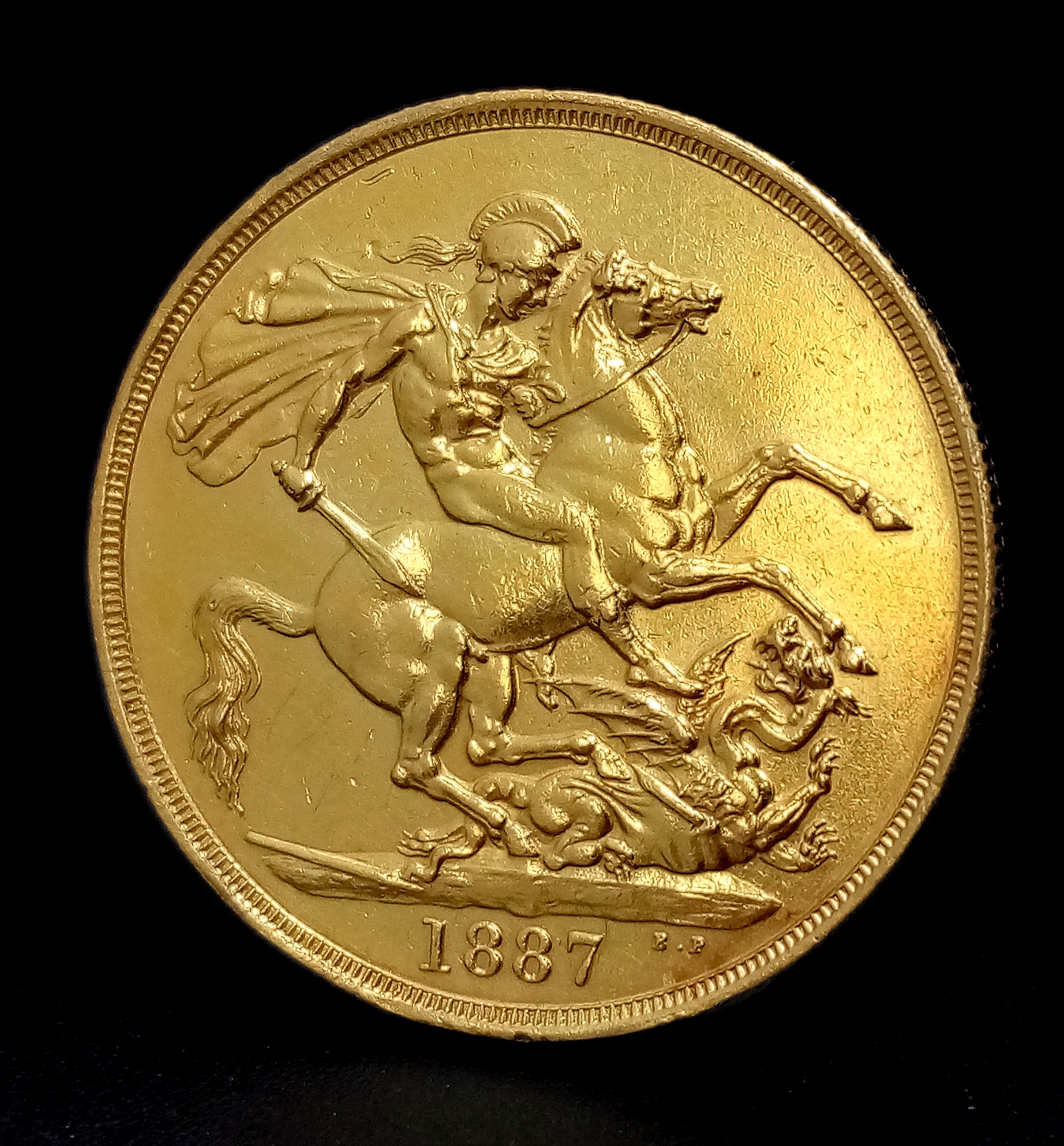 A Highly Collectible 1887, EF+ Grade, Queen Victoria Double Sovereign - 22K Gold Coin. This was only the second circulating £2 sovereign ever produced by the Royal Mint (1823, the first). It was minted to commemorate the Queen's Golden Jubilee. 16g. As stated, wonderful grade but please see photos. C9018.