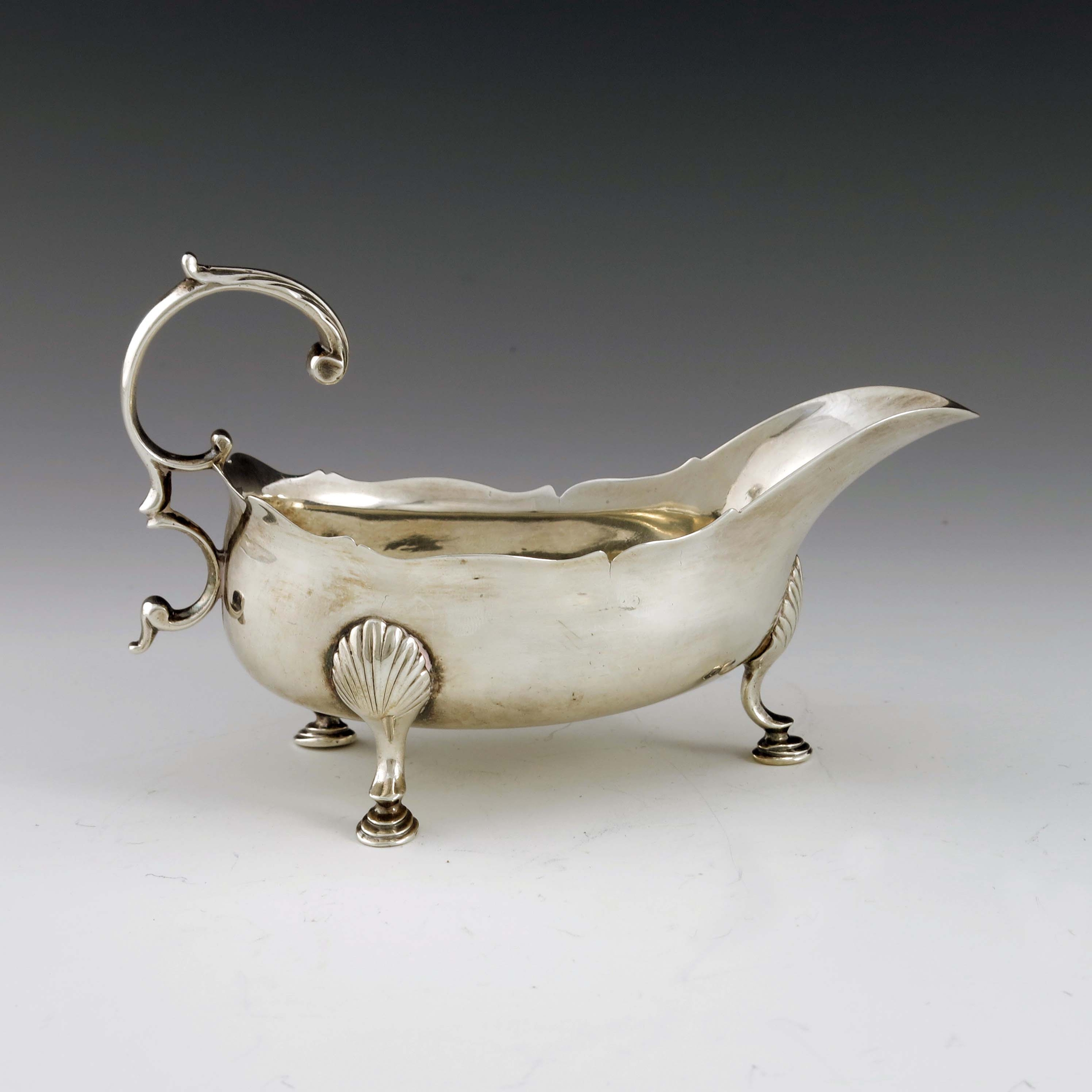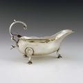 A George III Scottish Provincial silver sauce boat, William Craw, Canongate circa 1760s, narrow helmet form, with ogee rim and open acanthus ear handle, on shell and stepped pad feet, stamped WC and three Edinburgh gothic date letters, indistinct, 16.5cm long, 5.22ozt