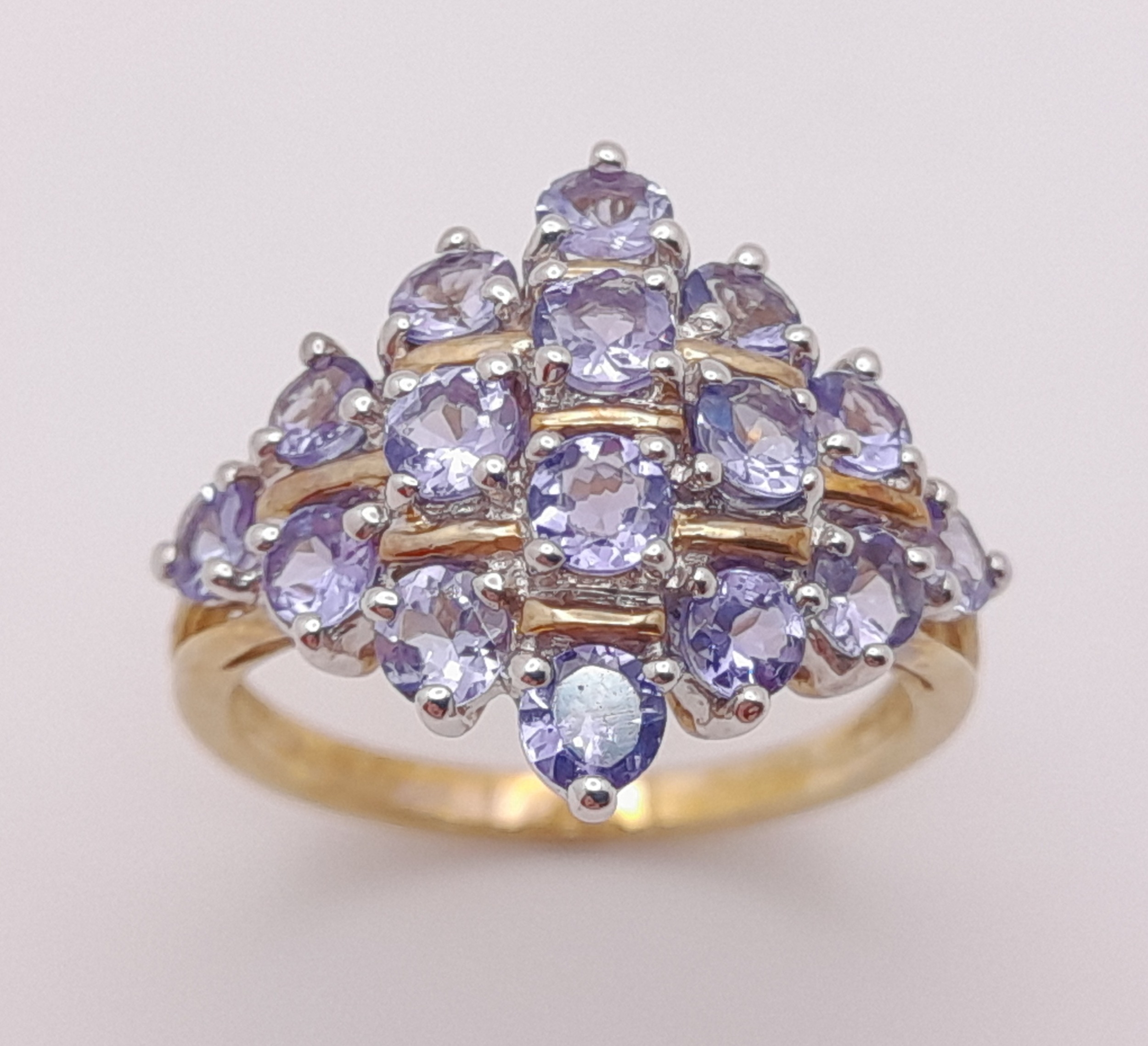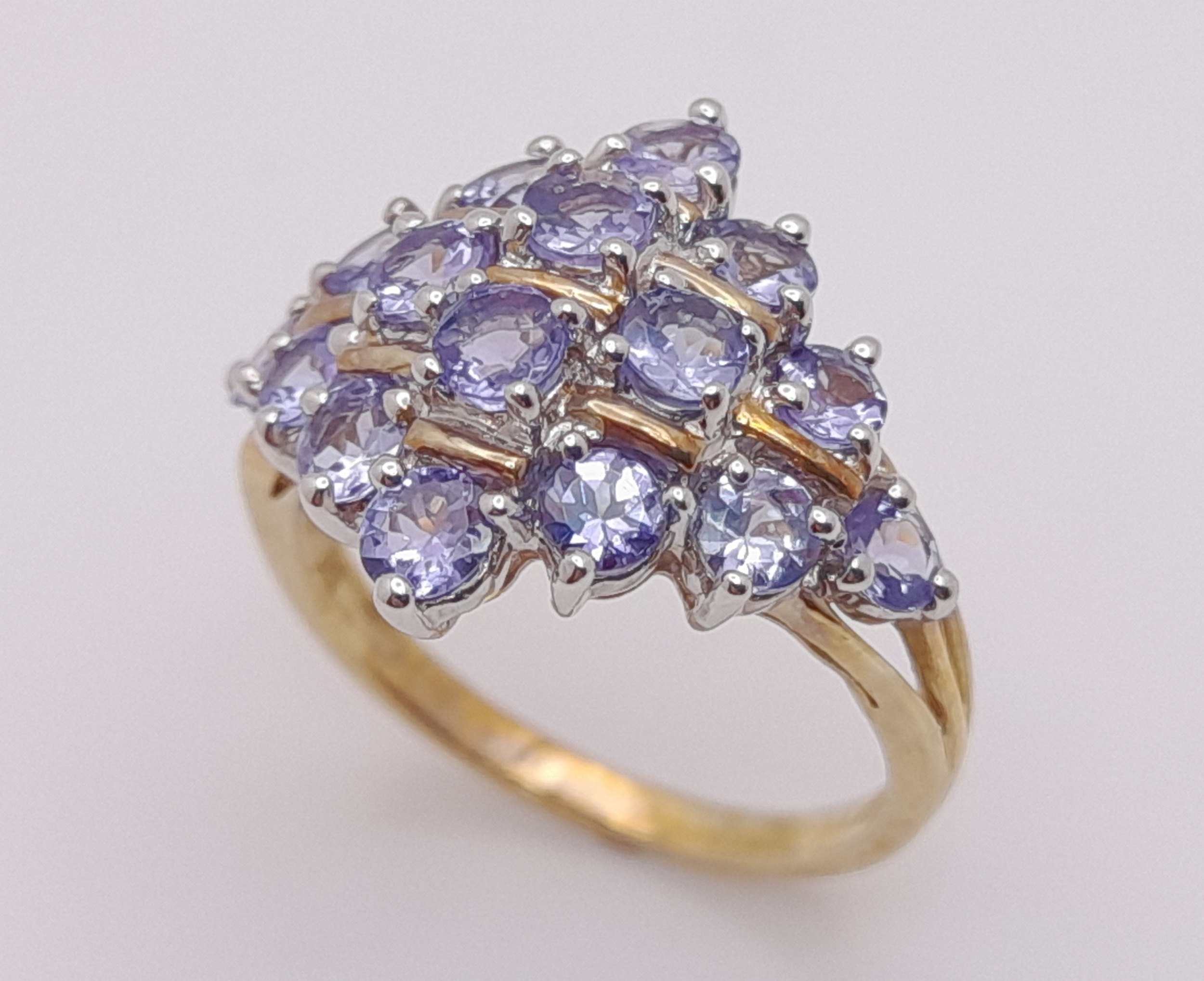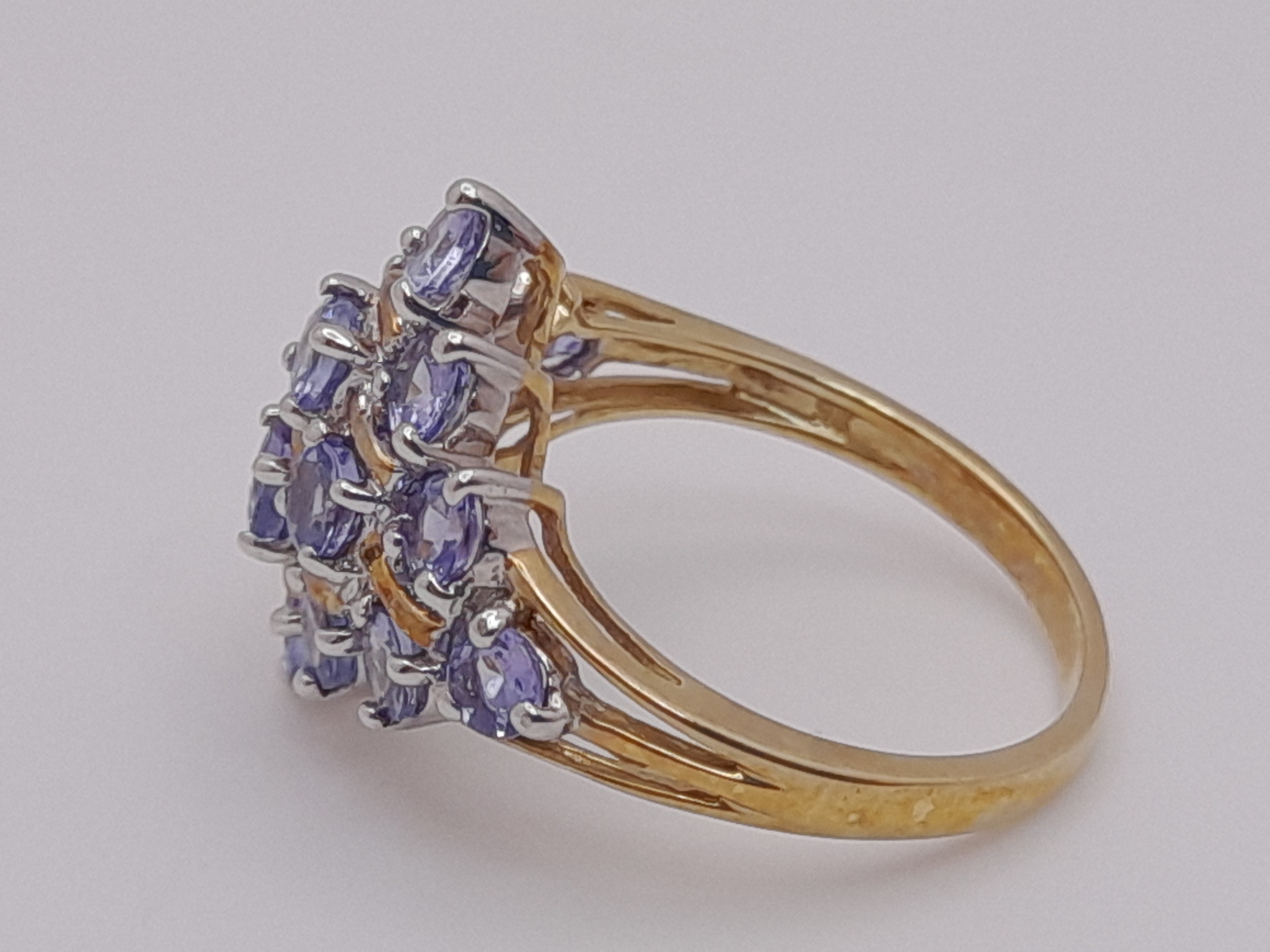 A Beautiful 9 Carat Yellow Gold and Tanzanite Set Cluster Ring Size M. The Ring is set with Sixteen 3mm Round Cut Tanzanites, approximately 2.4 Carats Total. The Ring measures 22 x 13 mm Crown and has a gross weight of 3.64 Grams.
