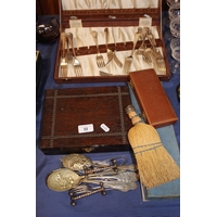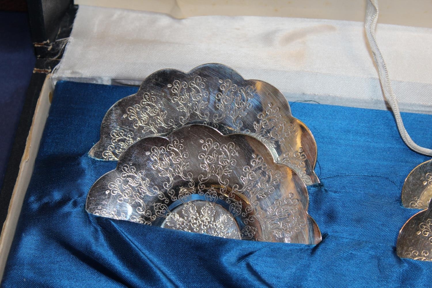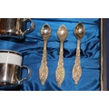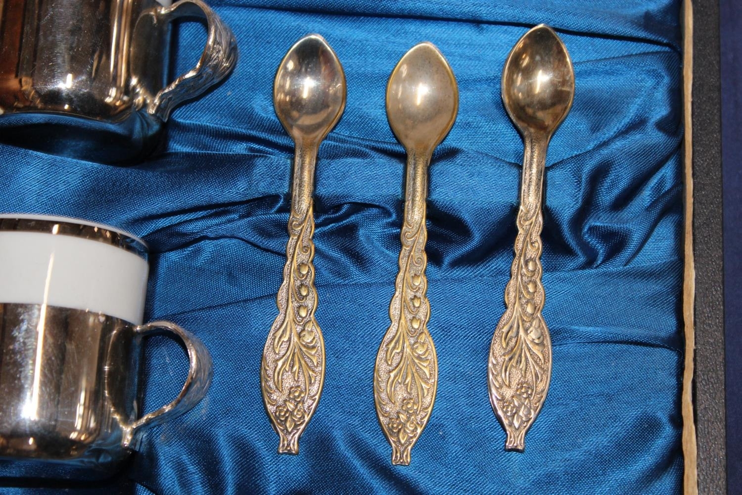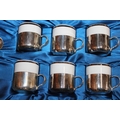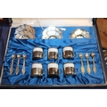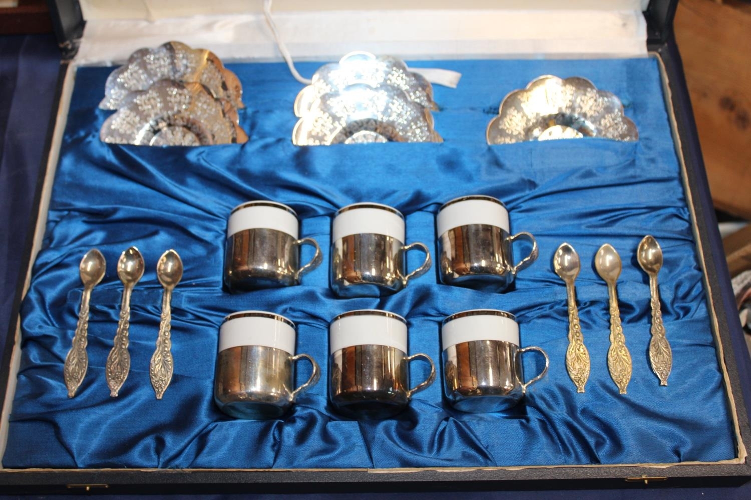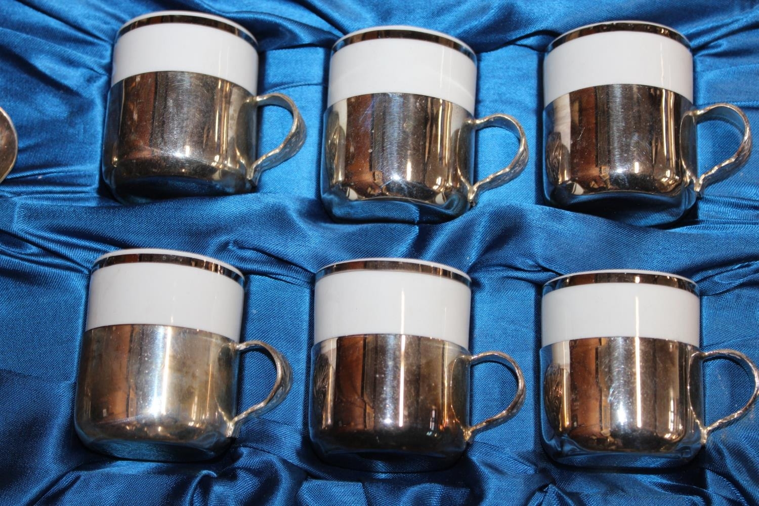 Cased set of six coffee cans and teaspoons, with matching saucers in white metal casings.