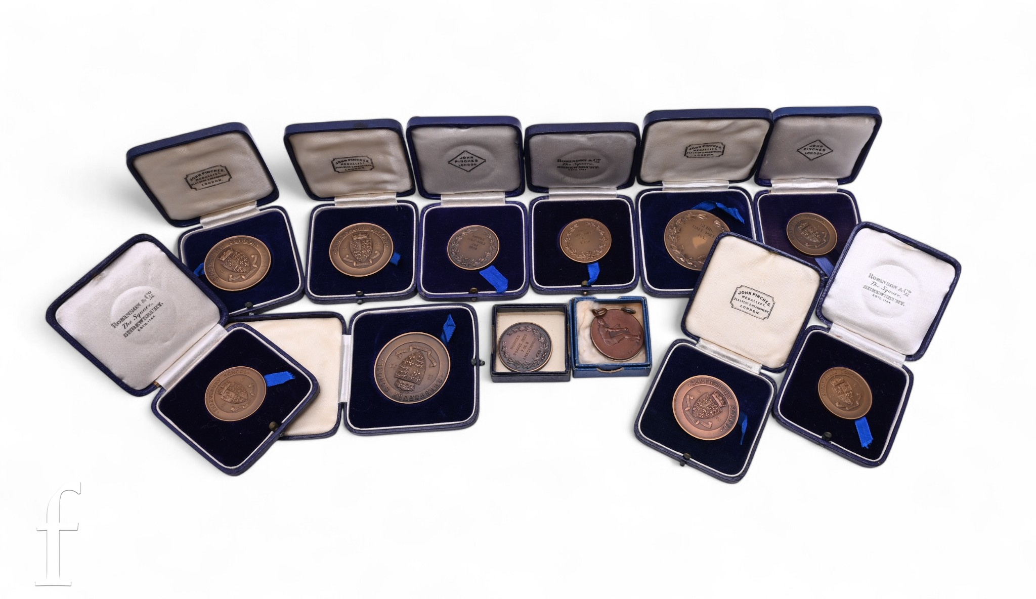 Eleven 1930s Shrewsbury School medals including Inter-House boxing, short relay, junior half mile, long jump, half mile and others, cased, together with two other sporting related medals. (13)