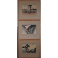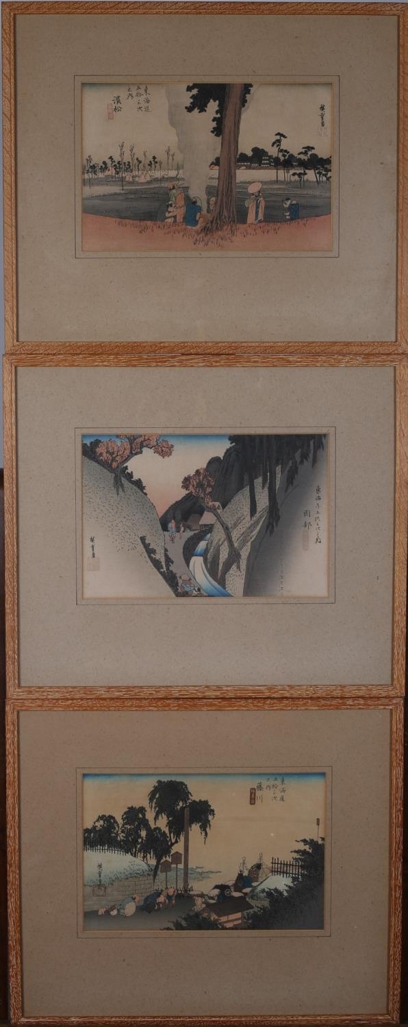HIROSHIGE IN THE COUNTRY SIDE OUTSIDE HAMAMATSU A YELLOW ROBED TRAVELER LOOKS ENVIOUSLY AT FARMERS AROUND A WARMING FIRE, THE ROUTE FROM MARIKO TO OKABE WENT THROUGH THIS NARROW ROBBER-INFFESTED MOUNTAIN PASS, APPROACHING FUJIKAWA COMMONERS BOW AS A DAIMYO PASSES LEADING DECORATED HORSES AS GIFTS TO THE EMPEROR coloured wood block prints a set of three 36cm x 42cm