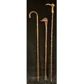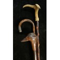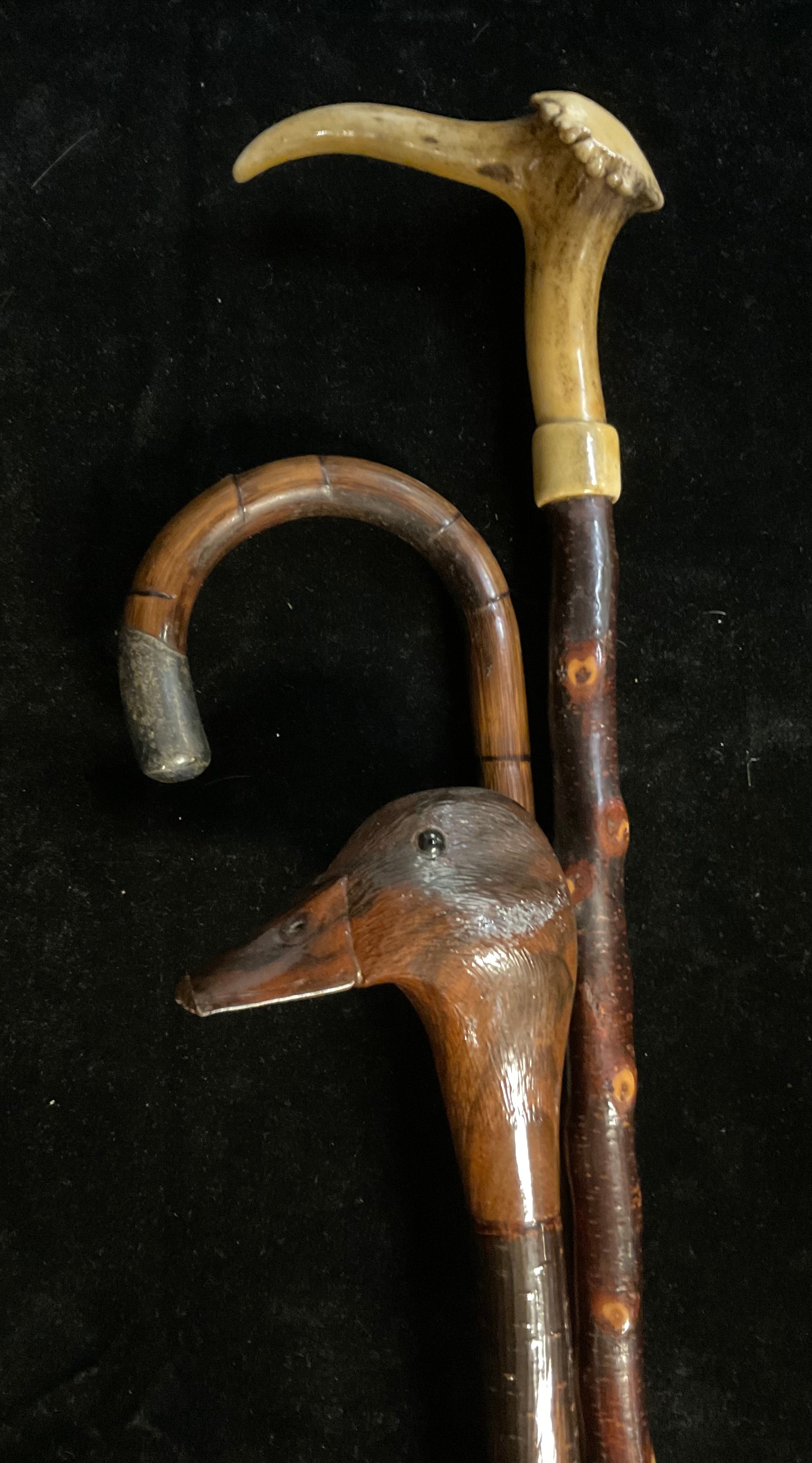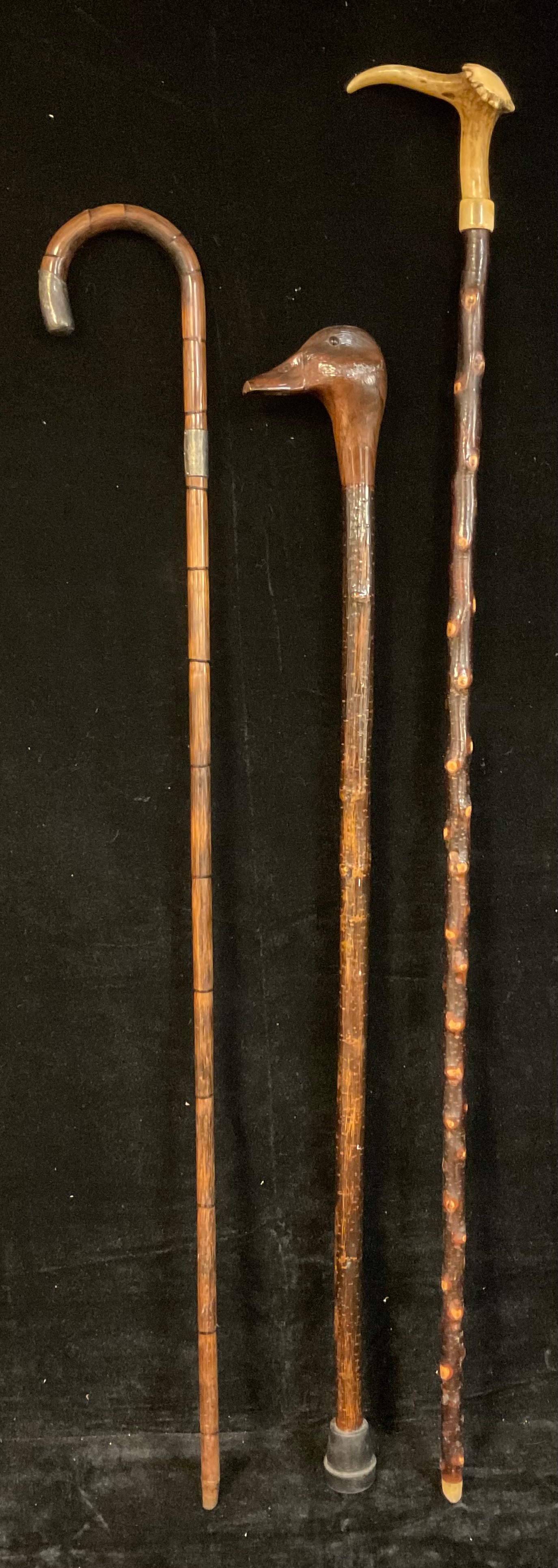Walking Sticks - a silver mounted bamboo walking stick, London 1914; another, the handle carved as a duck's head; an antler handled walking stick (3)