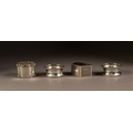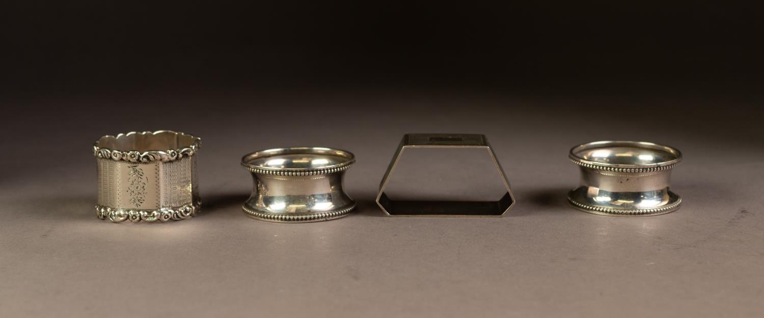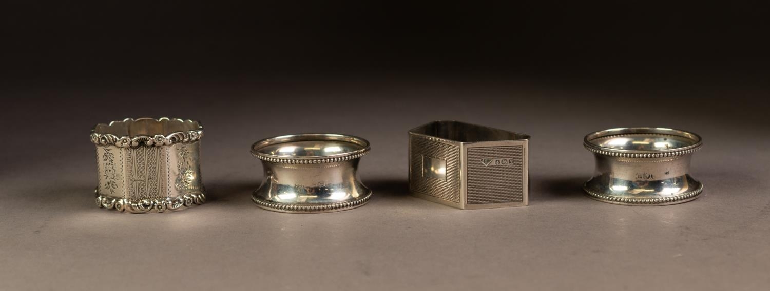 FOUR SILVER NAPKIN RINGS, comprising: A PAIR, Birmingham 1923, ANOTHER, octagonal, marks rubbed and an ENGINE TURNED, ANGULAR EXAMPLE, Birmingham 1945, 2.5oz, (4)