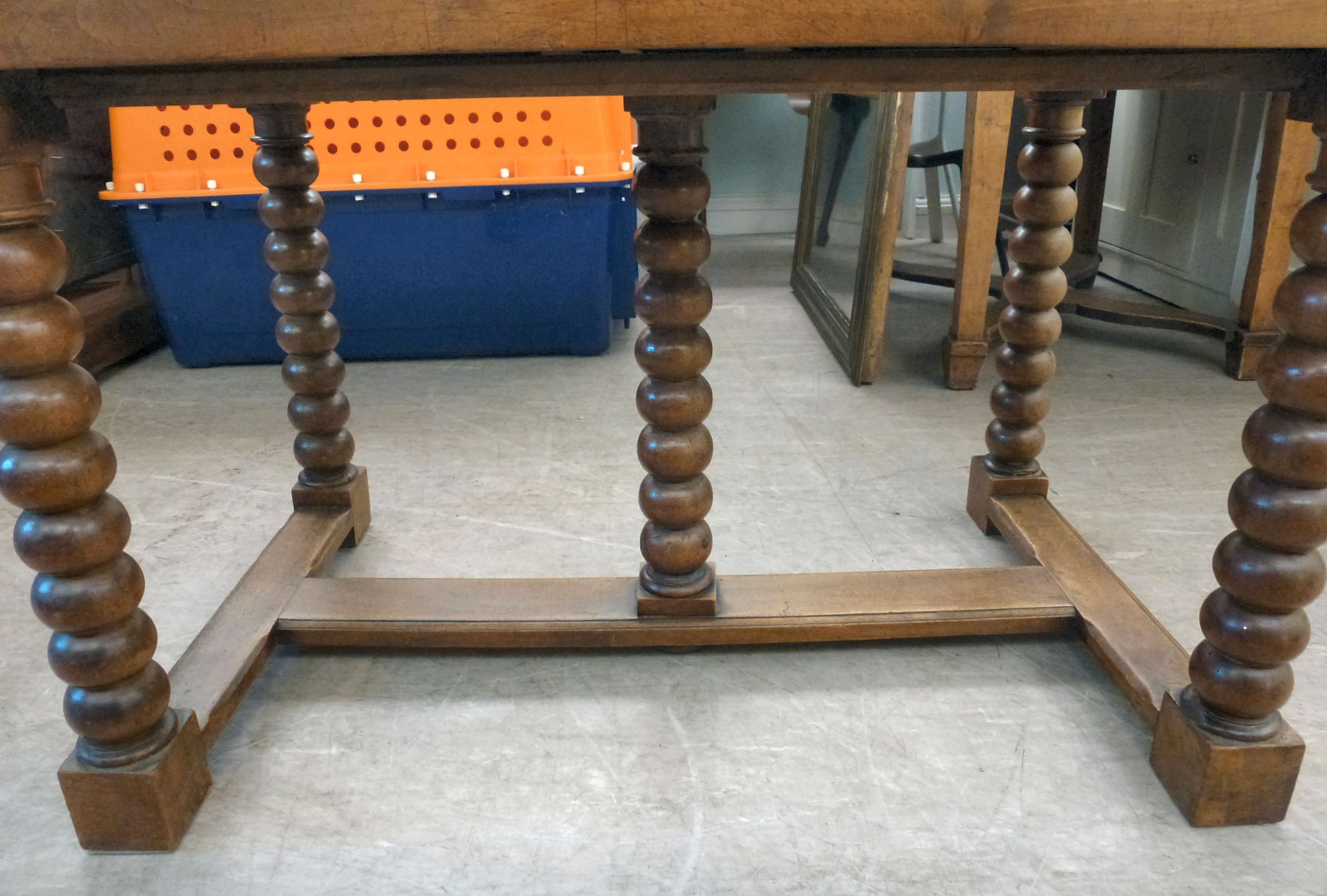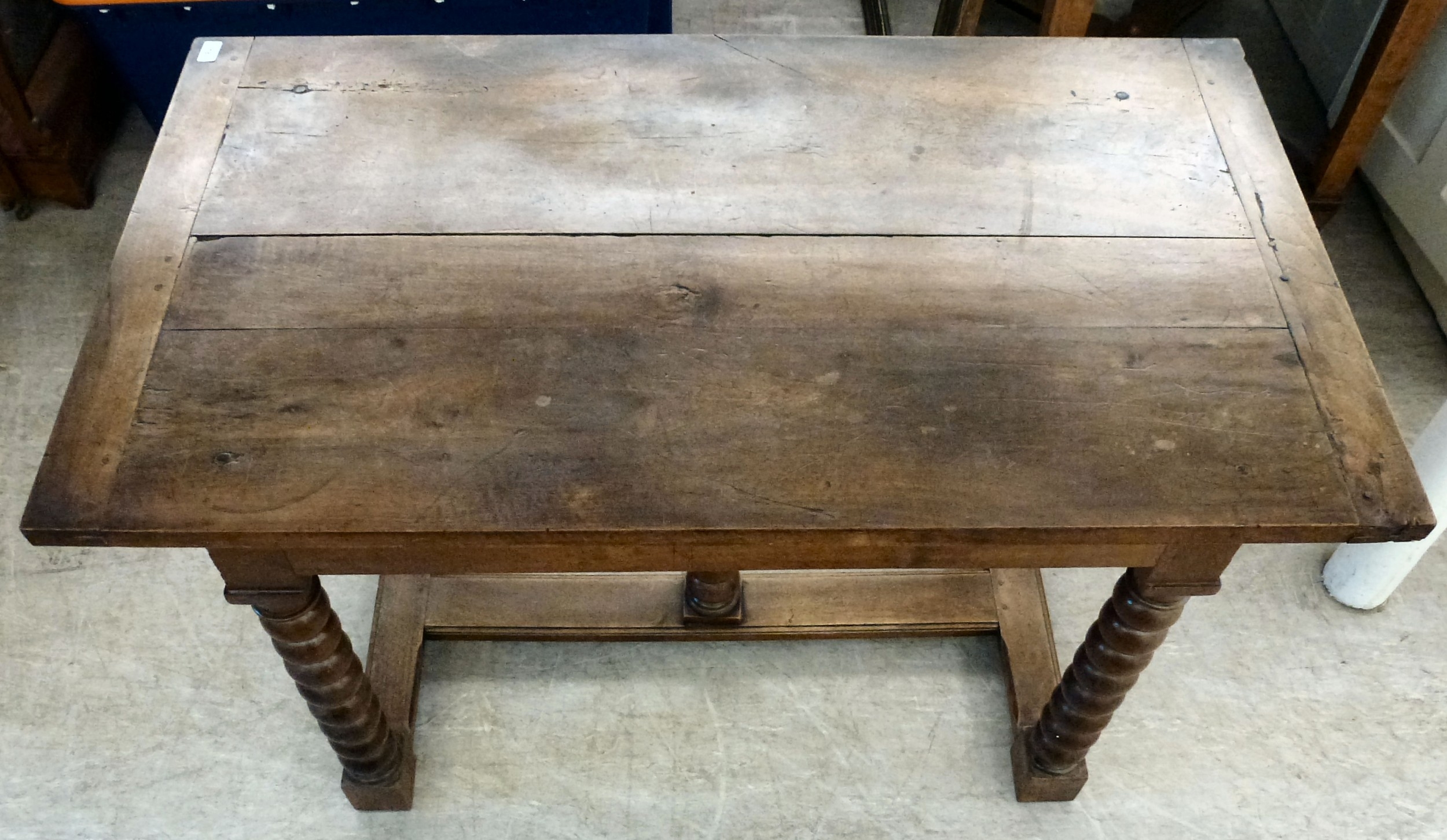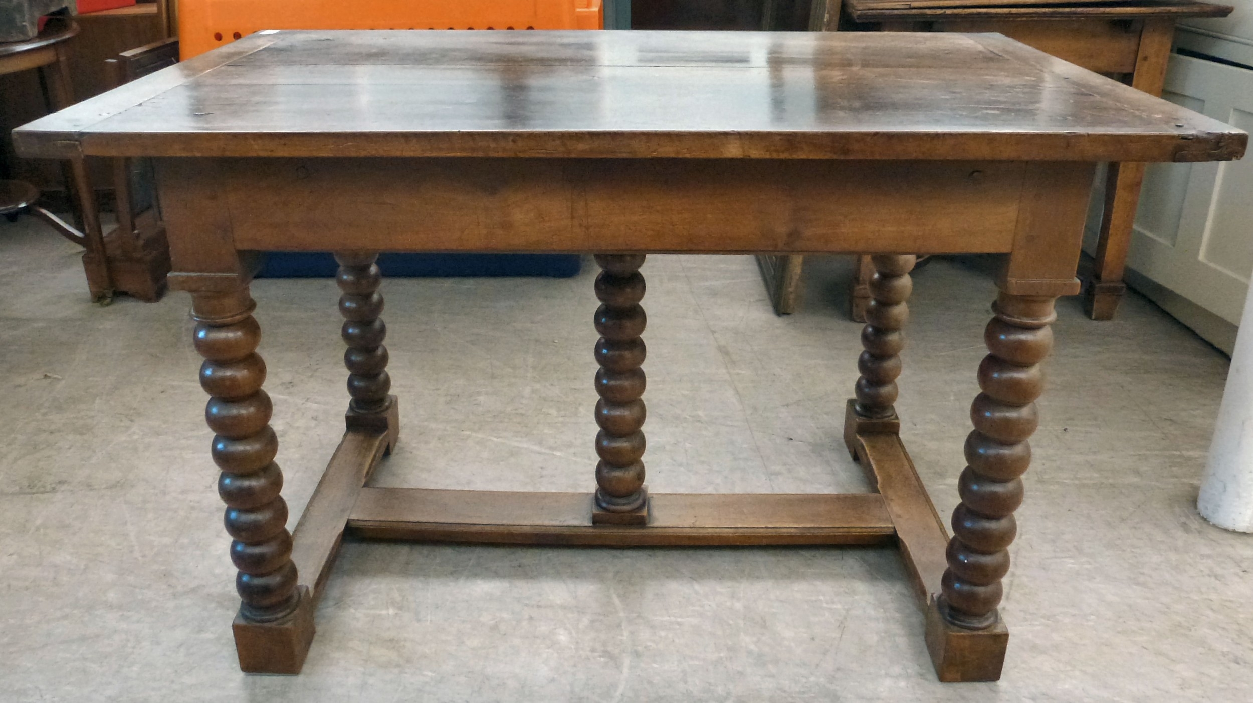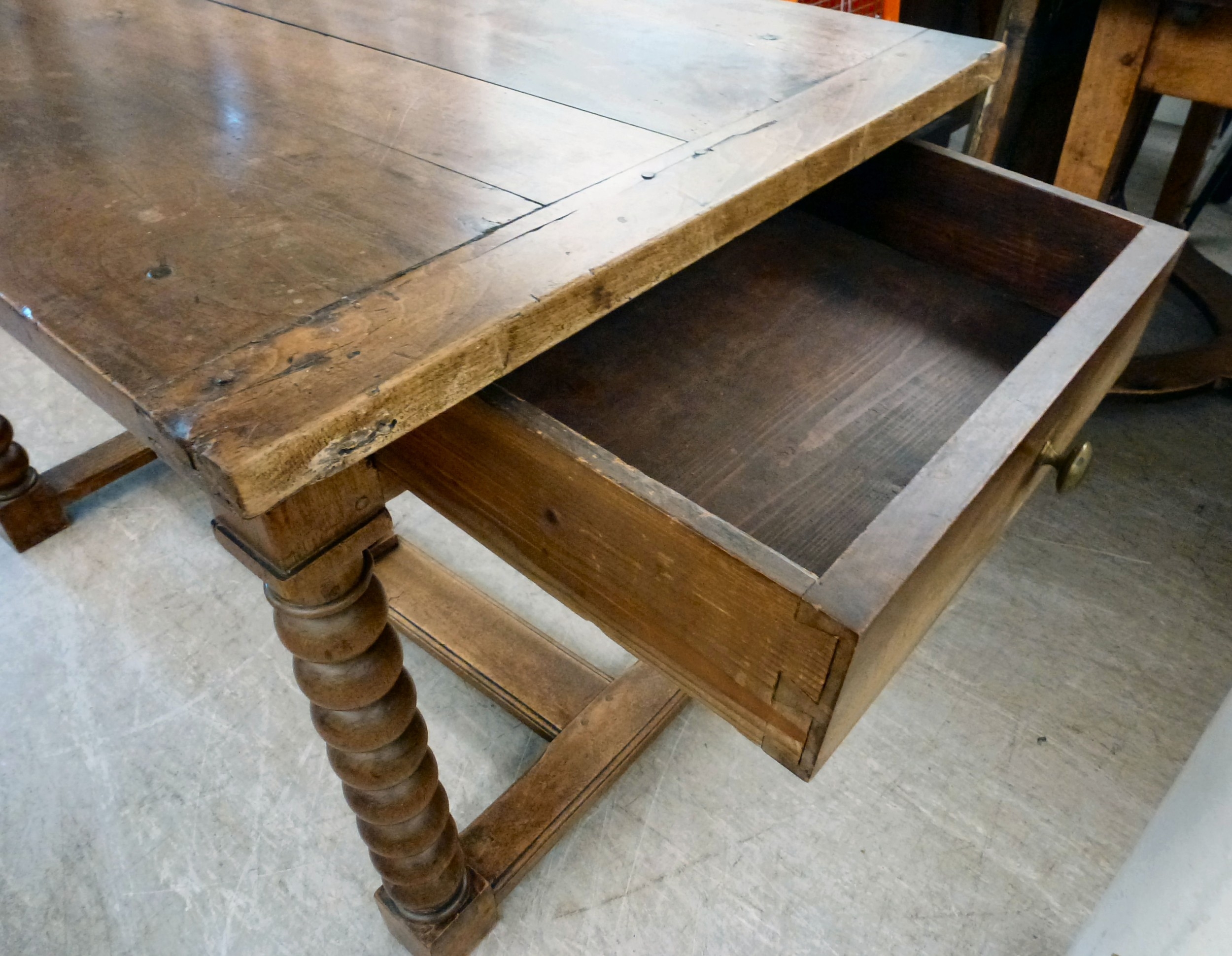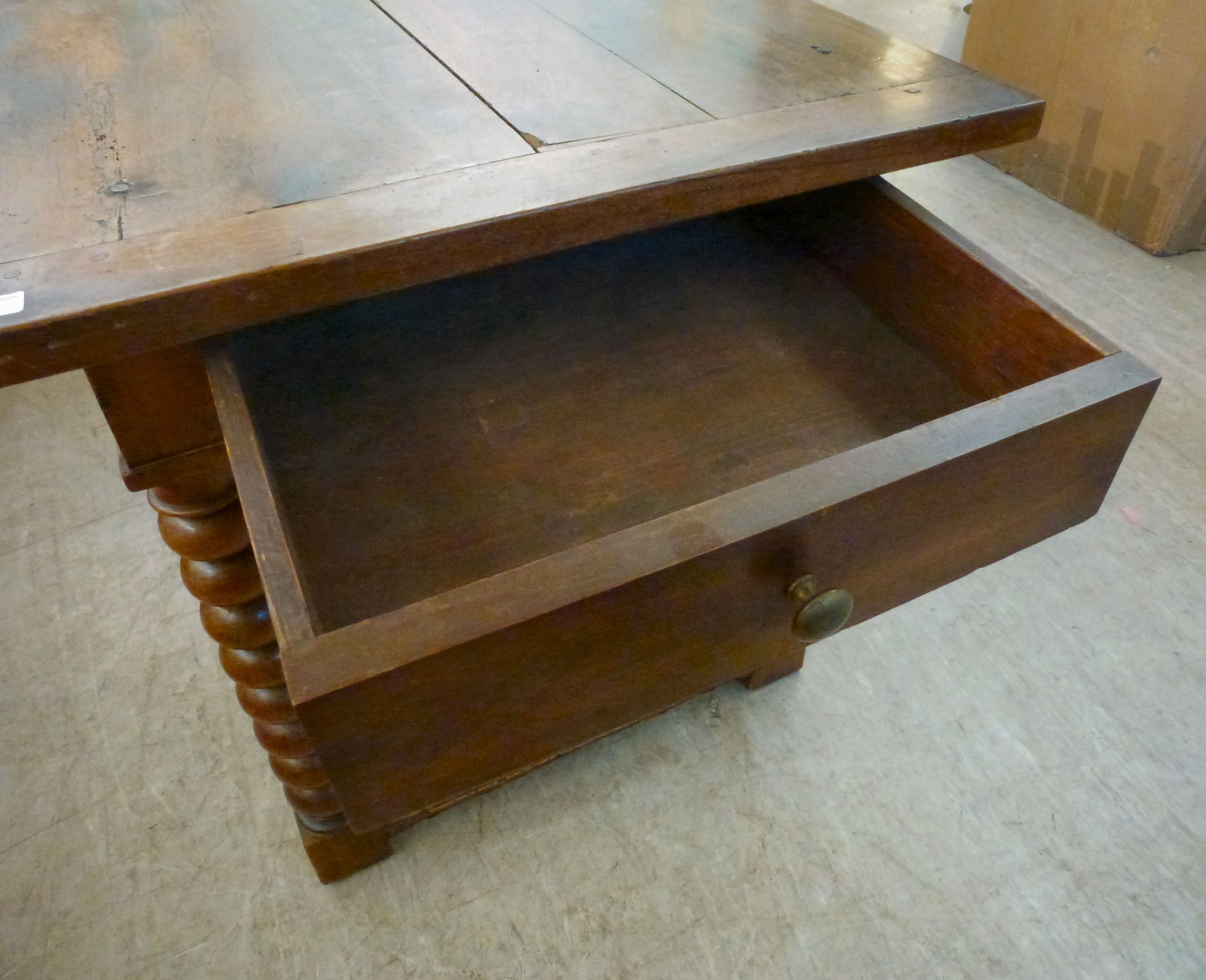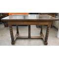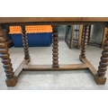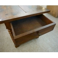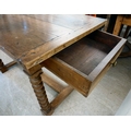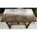 A mid 19thC oak farmhouse style side table, the planked top over two opposing drawers, raised on bobbin turned legs, united by a stretcher, on block feet 31"h 50"w