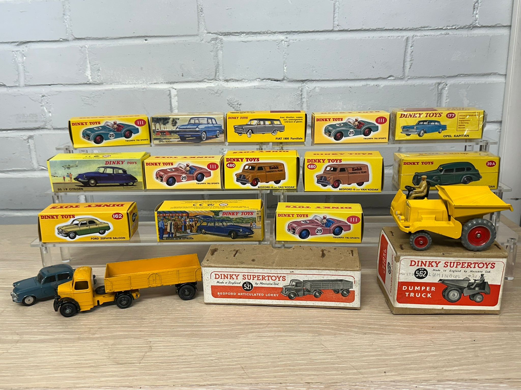 Carton of assorted Dinky toys to include Atlas (some sealed) older models include 562 Dumper Truck, 521 Bedford Lorry