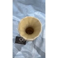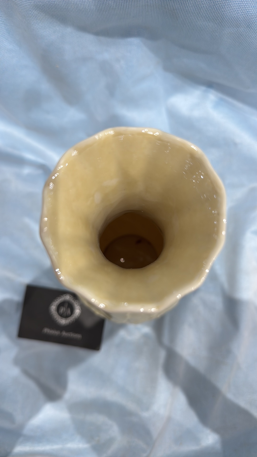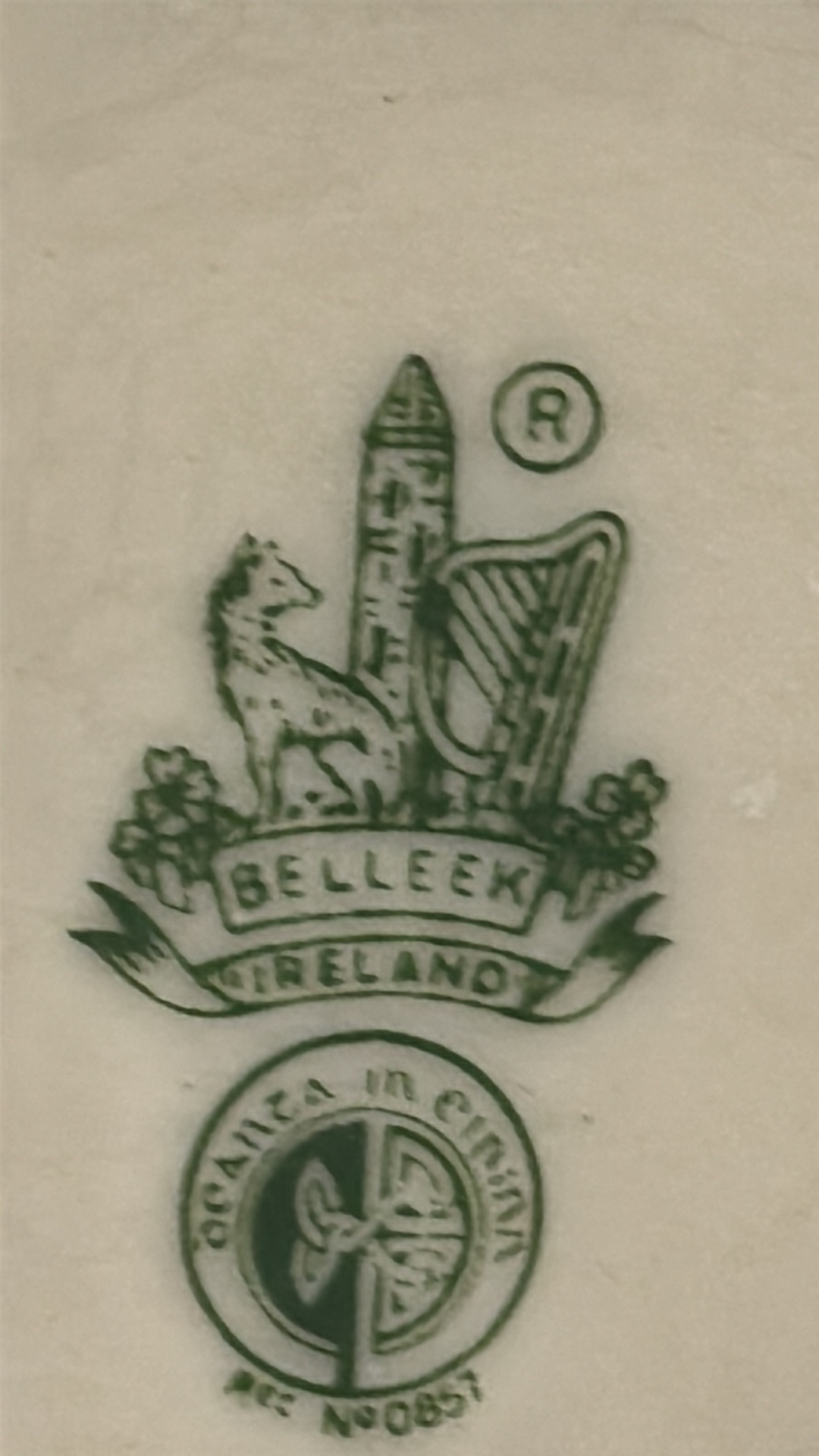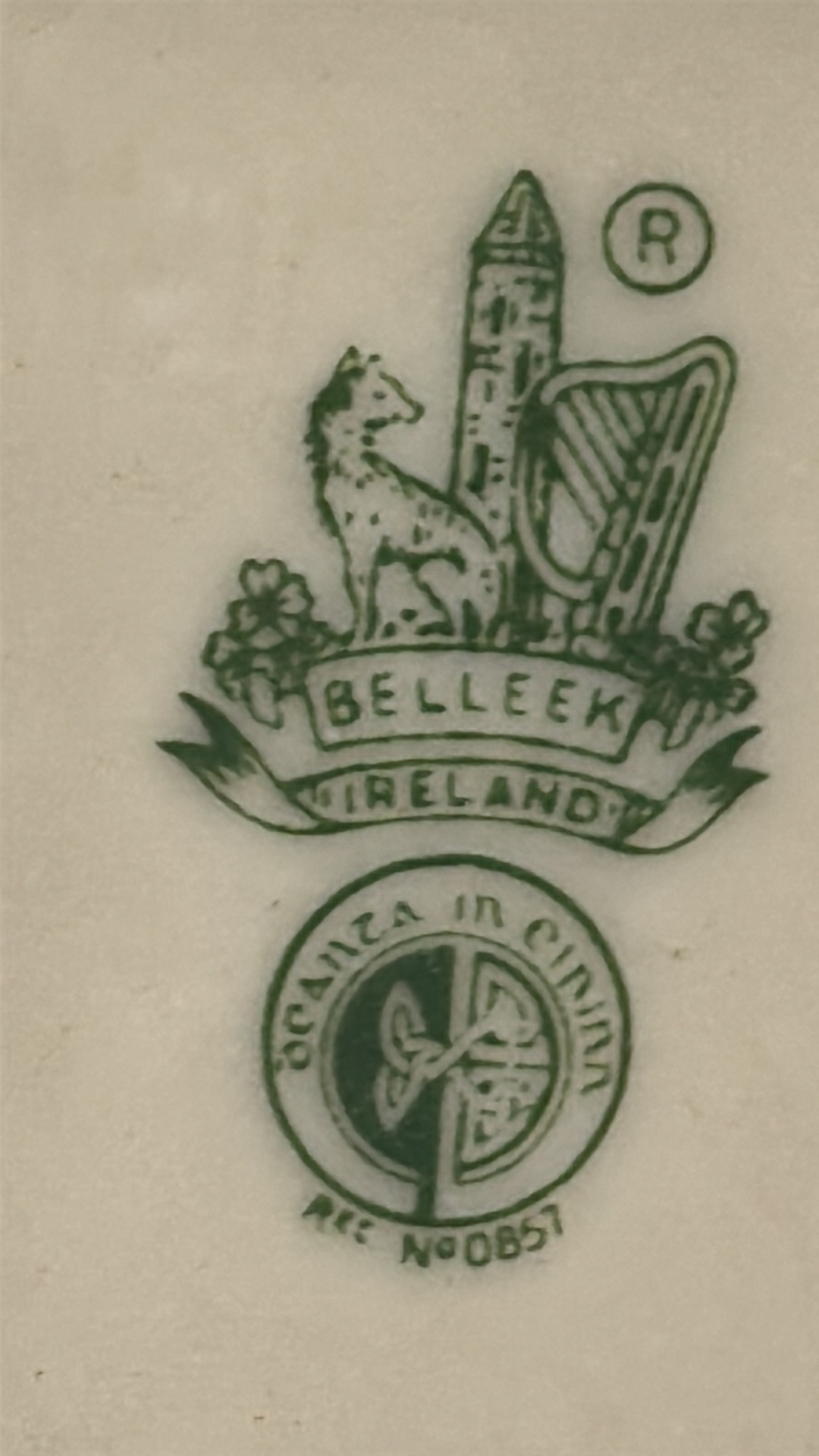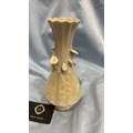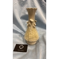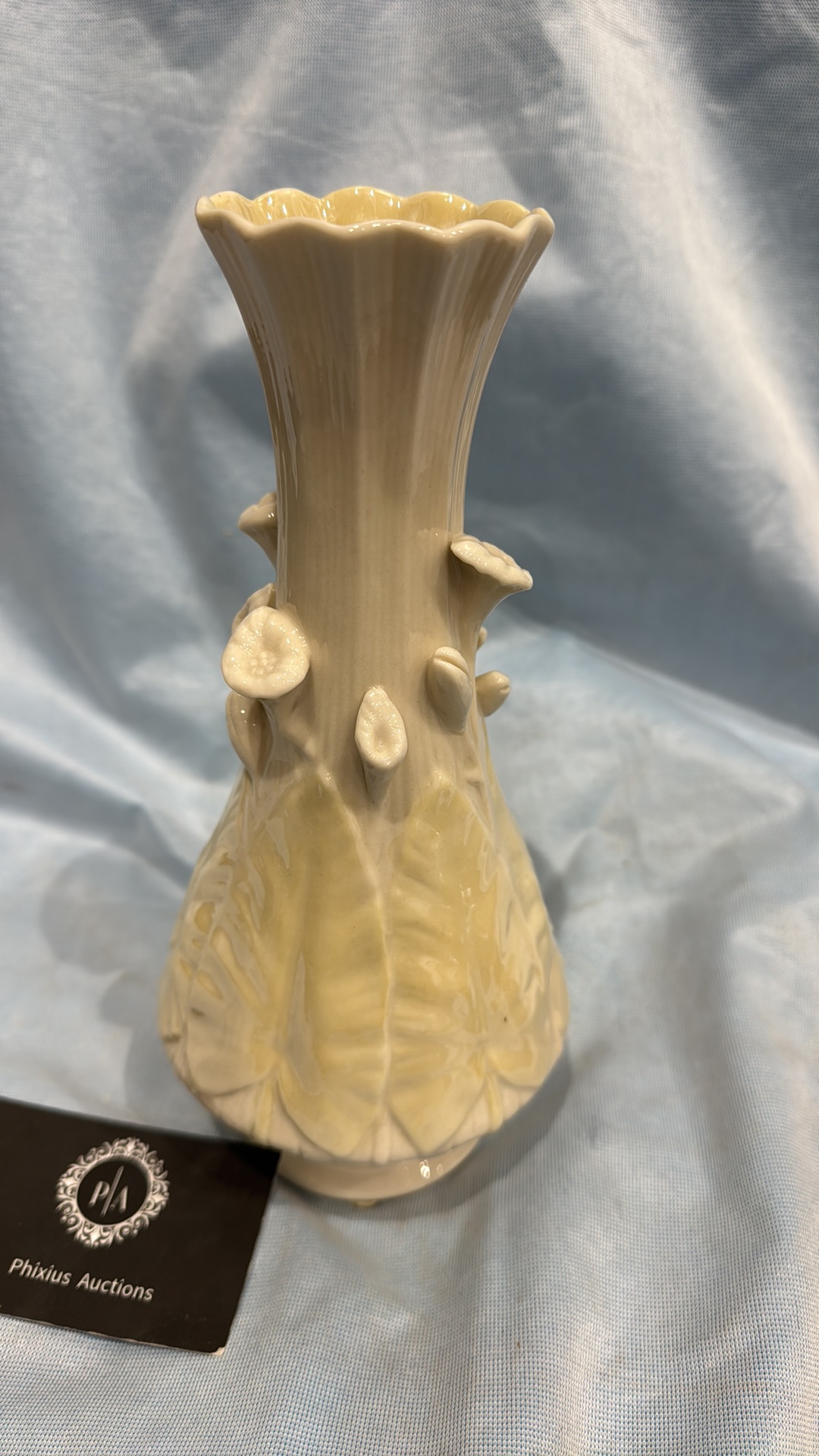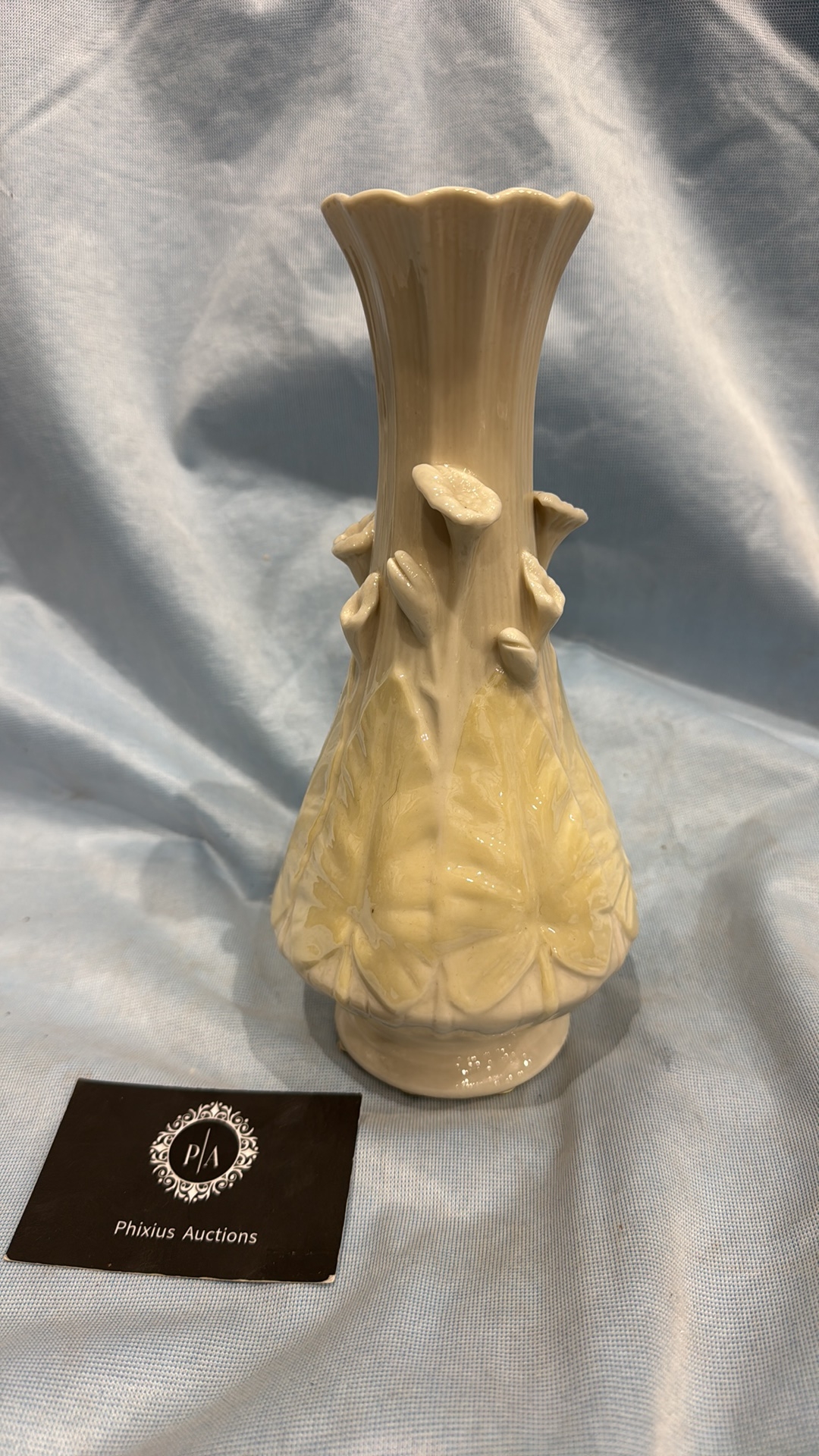 Mid-Century Belleek Irish porcelain trumpet-form vase, scalloped rim and leaf-moulded body with applied calla lilies, creamy ivory and pale yellow glaze; green 5th period mark, circa 1955-65.