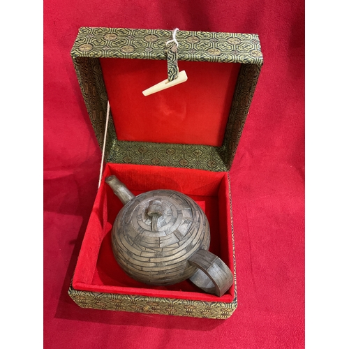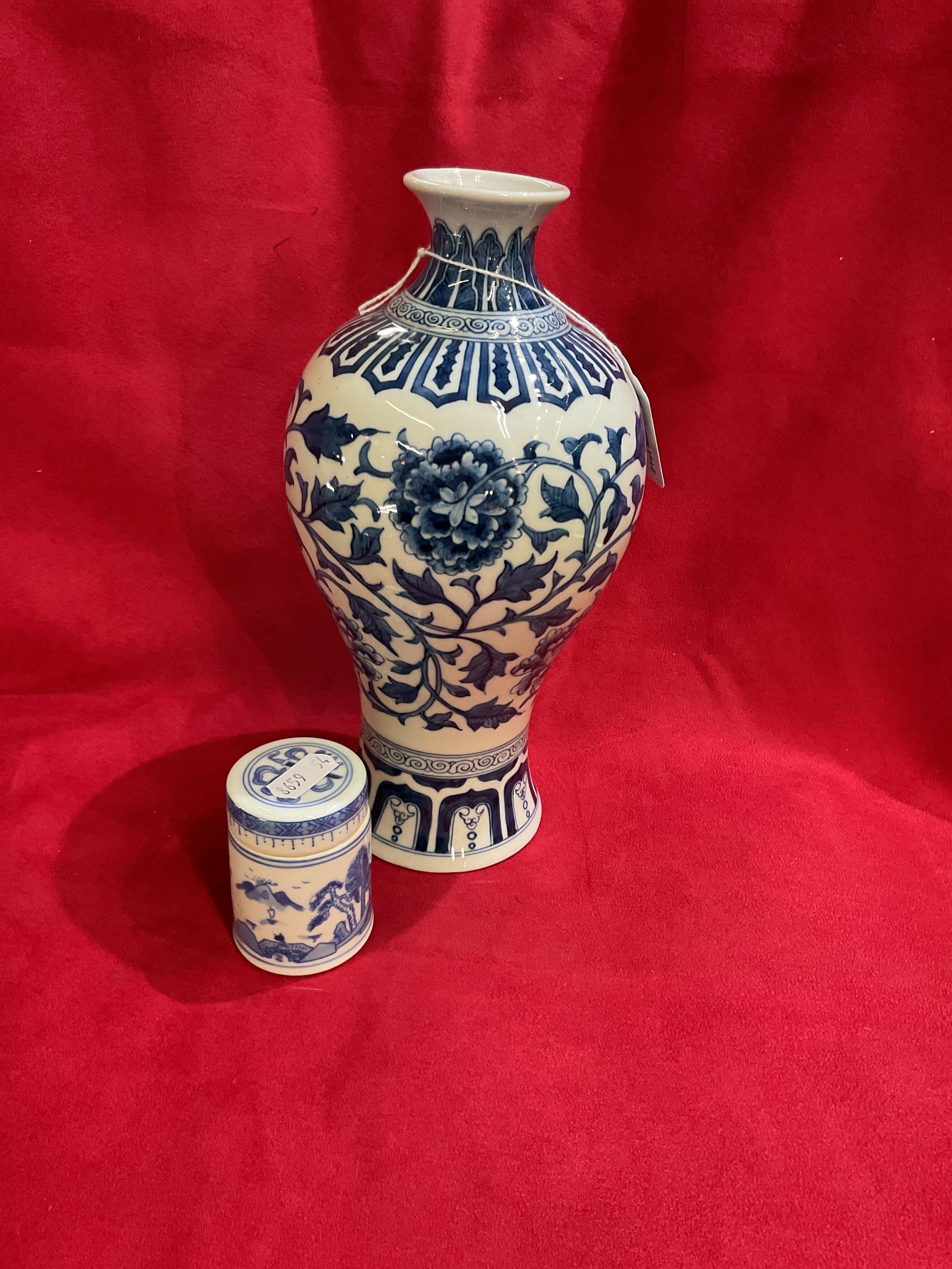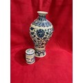 A blue and white Oriental vase 9 1/2” tall having floral decoration and character marks to base together with a lidded pot