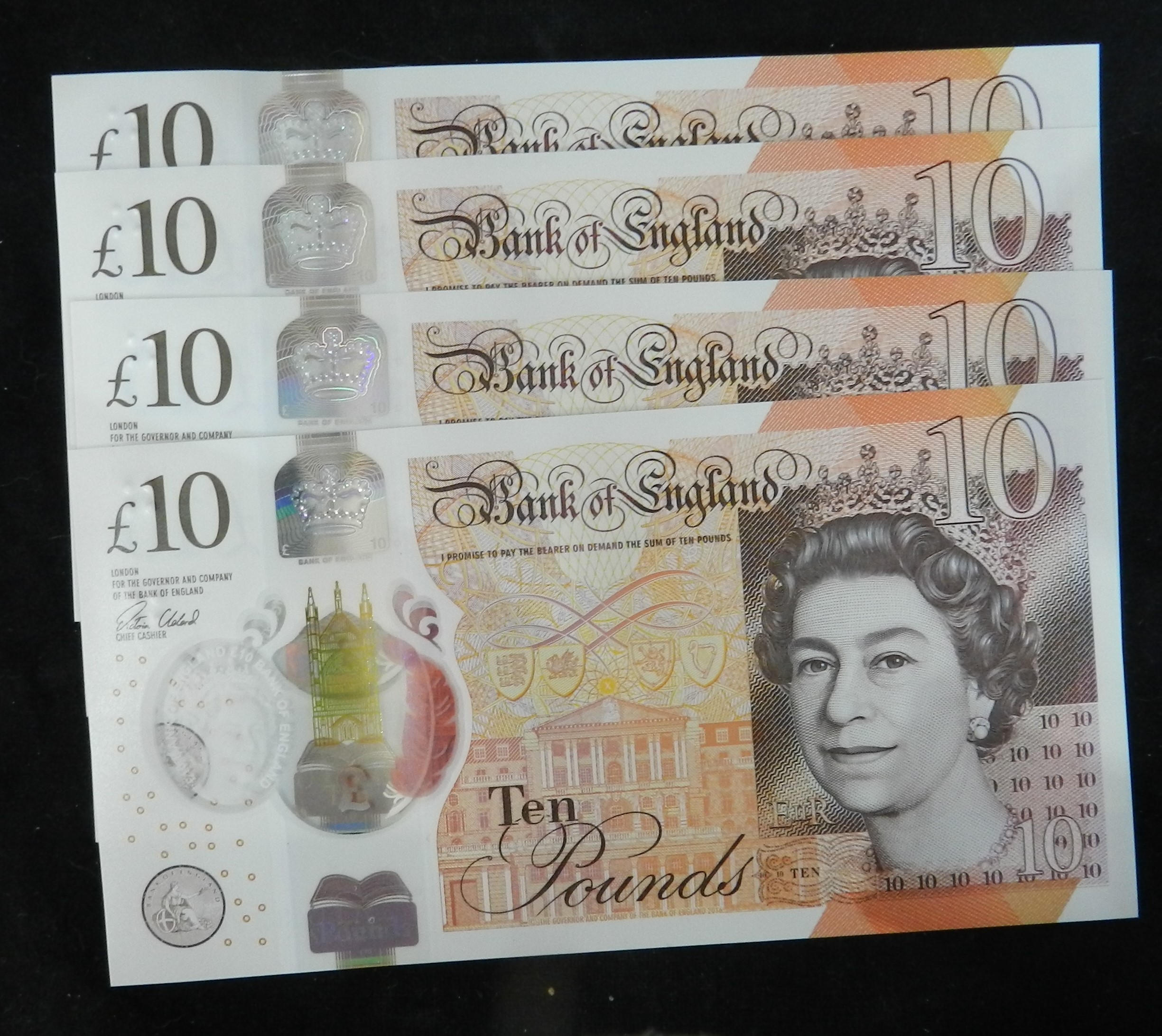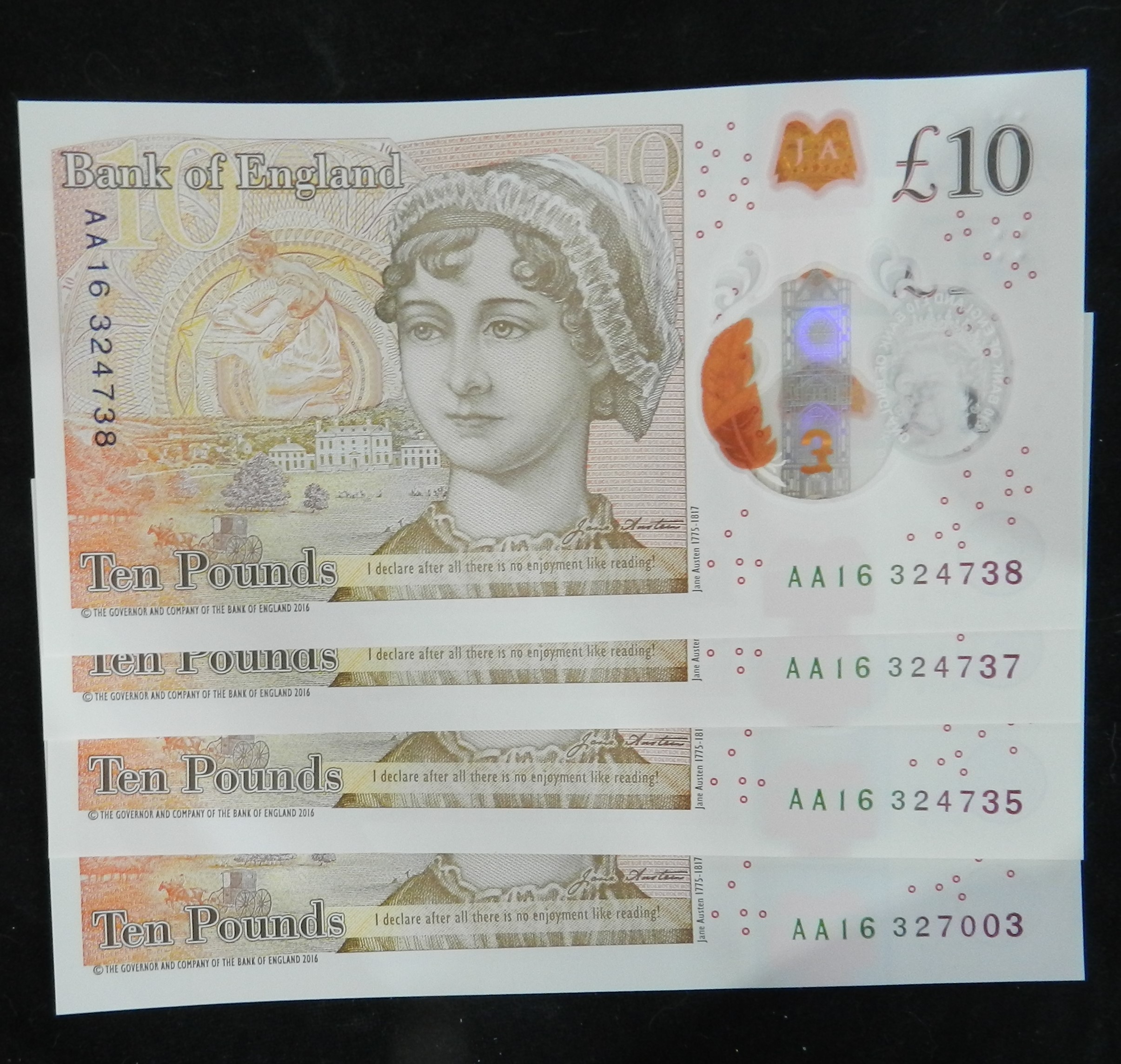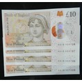 Banknotes. (4) £10 plastic note. First Issue. 2017. AA16 324737 to ...738 consecutive; 324735; & 327003. All Uncirculated.